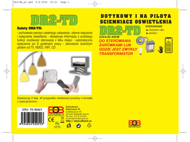 dr2tdb_pl.qxd 8.8.2006 23:21 Page 1 DOTYKOWY I NA PILOTA ŚCIEMNIACZ OŚWIETLENIA Zalety DR2-TD: - zachowanie pamięci ostatniego ustawienia - płynne włączenie i wyłączenie oświetlenia - dźwiękowa informacja o przebiegu funkcji -możliwość sterowania z kilku miejsc - automatyczne wyłączenie po 8 godzinach pracy - sterowanie dowolnym pilotem od TV, VIDEO, HIFI, CD . STEROWANIE dotykiem ręki pilotem 230V/40 -400W DO STEROWANIA ŻARÓWKAMI LUB GDZIE JEST ZWYKŁY TRANSFORMATOR Gwarancja 2 lata. W przypadku reklamacji prosimy o kontakt z dystrybutorem. DR2- TD BIAŁY MADE IN CZECH REPUBLIC Dystrybutor: Elektrobok PL ul.Bielowicza 46 32-040 Świątniki Górne Tel./fax: 012 2704139 e-mail:[email protected] http:// www.elbock.cz Pb LEAD FREE v souladu s RoHS MADE IN CZECH REPUBLIC 23:21 Page 2 Ściemniacz DR2-TD służy do sterowania dotykiem lub przy użyciu pilota jasnością świecenia żarówek. W ściemniaczu zastosowano specjalny obwód pozwalający na płynną regulację jasności świecenia co przedłuża żywotność żarówek. Istnieje możliwość przejścia na regulację skokową. Sterowanie ręką Przyłożyć rękę do płytki czołowej Krótki dotyk ok. 0,5s powoduje zaświecenie lub zgaszenie światła o tym natężeniu jakie było ostatnie. Dłuższy dotyk powoduje regulację natężenia światła, która zostaje zapamiętana do kolejnej zmiany. Sterowanie pilotem Na pilocie kierując go w stronę ściemniacza naciskamy dowolny przycisk przez ok. 3 sekundy aż ściemniacz wyda dźwięk. Po tej czynności na ściemniaczu zaczyna mrugać dioda co oznacza gotowość odbioru sygnału. Zwalniamy przycisk pilota a po jego ponownym naciśnięciu następuje sterowanie. Krótki sygnał włącza lub wyłącza oświetlenie a długim regulujemy jasność świecenia. Jeżeli po pierwszym naciśnięciu przycisku pilota nie podejmiemy dalszego sterowania to ściemniacz wyda dźwięk i dioda zgaśnie. Do regulacji wygodnie używać przycisku pilota który nie jest używany w sterowaniu urządzenia od którego jest . Montaż Ściemniacz przystosowany do montażu na puszki podtynkowe KU i KP. Przewód fazowy należy podłączyć pod zacisk oznaczony . Przewód od żarówki należy podłączyć do zacisku . Przy mylnym podłączeniu przewodów ściemniacz nie reaguje na dotyk oraz może dojść do jego uszkodzenia. Przy sterowaniu z kilku miejsc można używać zwykłych wyłączników którymi można tak włączać, wyłączać światło jak i regulować jego natężenie. Schemat instalacji Sterowanie z jednego miejsca Sterowanie z kilku miejsc 12V 8.8.2006 12V dr2tdb_pl.qxd OPIS PŁYTKI INDYKACJA DIODY LED: - oświetlenie wyłączone, dioda świeci - po zaświeceniu DOTYKIEM, dioda gaśnie - aktywacja pilotem, dioda mruga, sygnał dźwiękowy - przy deaktywacji pilotem, Suwak funkcji sygnał dźwiękowy, po zaświeceniu dioda gaśnie Dioda Led 1 2 FUNKCJE SUWAKA: POŁOŻENIE 1 - do sterowania z transformatorami TRIOIDALNYMI i klasycznymi POŁOŻENIE 2 - do sterowania żarówek UWAGA !!! Przy podłączeniu do większego obciążenia nastąpi uszkodzenie bezpiecznika . Przy sterowaniu z kilku miejsc ściemniacz DR2-TD należy podłączyć zgodnie ze schematem, na przewód od żarówek. Przy regulacji ściemniacz szumi. Bezpiecznik typu F2A/1500A,250 V. Montaż i demontaż należy prowadzić bez napięcia przez osoby o odpowiednich kwalifikacjach. TECHNICZNE PARAMETRY napięcie częstotliwość obciążenie oporowe ściemniacza obciążenie indukcyjne ściemniacza bezpiecznik średnica przewodu instalacyjnego Cu Un = 230 V fn = 50 Hz 40 - 400 W 40 - 300 VA F2 A/1500 A, 250V 2,5 mm2