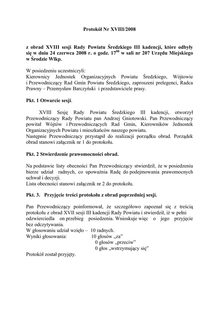 Protok€ł Nr XVIII/2008 z obrad XVIII sesji Rady Powiatu Średzkiego III kadencji, kt€re odbyły się w dniu 24 czerwca 2008 r. o godz. 1700 w sali nr 207 Urzędu Miejskiego w Środzie Wlkp. W posiedzeniu uczestniczyli: Kierownicy Jednostek Organizacyjnych Powiatu Średzkiego, W•jtowie i Przewodniczący Rad Gmin Powiatu Średzkiego, zaproszeni prelegenci, Radca Prawny – Przemysław Barczyński i przedstawiciele prasy. Pkt. 1 Otwarcie sesji. XVIII Sesję Rady Powiatu Średzkiego III kadencji, otworzył Przewodniczący Rady Powiatu pan Andrzej Gniotowski. Pan Przewodniczący powitał W•jt•w i Przewodniczących Rad Gmin, Kierownik•w Jednostek Organizacyjnych Powiatu i mieszkańc•w naszego powiatu. Następnie Przewodniczący przystąpił do realizacji porządku obrad. Porządek obrad stanowi załącznik nr 1 do protokołu. Pkt. 2 Stwierdzenie prawomocności obrad. Na podstawie listy obecności Pan Przewodniczący stwierdził, że w posiedzeniu bierze udział radnych, co upoważnia Radę do podejmowania prawomocnych uchwał i decyzji. Lista obecności stanowi załącznik nr 2 do protokołu. Pkt. 3. Przyjęcie treści protokołu z obrad poprzedniej sesji. Pan Przewodniczący poinformował, że szczegƒłowo zapoznał się z treścią protokołu z obrad XVII sesji III kadencji Rady Powiatu i stwierdził, iż w pełni odzwierciedla on przebieg posiedzenia. Wnioskuje więc o jego przyjęcie bez odczytywania. W głosowaniu udział wzięło – 10 radnych. Wyniki głosowania: 10 głosƒw „za” 0 głosƒw „przeciw” 0 głos „wstrzymujący się” Protokƒł został przyjęty. Pkt 4. Sprawozdanie Starosty z prac Zarządu w okresie między sesjami. Zarząd Powiatu Średzkiego, jak i jednostki organizacyjne Powiatu, w okresie sprawozdawczym zajmowały się wieloma istotnymi dla Powiatu zagadnieniami, ktƒre Starosta – Piotr Piekarski przedstawił w następujących blokach tematycznych. I. Przetargi, remonty i utrzymanie dr„g. 1. W wyniku przeprowadzonego postępowania na udzielenie i obsługę w 2008 r. długoterminowego kredytu bankowego na sfinansowanie wydatkƒw inwestycyjnych, Zarząd dokonał wyboru oferty najkorzystniejszej tj. oferty złożonej przez Bank Gospodarstwa Krajowego Oddział w Poznaniu. Cena oferty – oprocentowanie w skali roku WiBOR 14+0,25% marża bankowa. 2. 19 czerwca br. ogłoszono przetarg na budowę magazynu sprzętu przeciwpowodziowego i sprzętu drogowego w Lubrzu. Szacunkowa wartość całego zadania wynosi 130.000,- zł, z czego 100.000,- zł to środki z Powiatowego Funduszu Ochrony Środowiska i Gospodarki Wodnej. 3. 21 kwietnia br. Sejmik Wojewƒdztwa Wielkopolskiego przyjął uchwałę w sprawie wyrażenia zgody na przekazanie przez Wojewƒdztwo Wielkopolskie dotacji celowej na dofinansowanie realizacji zadania „Remont podłogi sali gimnastycznej w Zespole Szkƒł Zawodowych w Środzie Wlkp.” w wysokości 4.000 zł. Dotacja ta została przyznana, w związku ze złożonym przez Starostwo Powiatowe w Środzie wnioskiem do Departamentu Sportu i Turystyki Urzędu Marszałkowskiego Wojewƒdztwa Wielkopolskiego w Poznaniu. 4. Przeprowadzono remont drogi powiatowej nr 4048P Chromiec- Chwalęcin, na odcinku Chwalęcin – Kruczyn. Roboty wykonała firma Przedsiębiorstwo Robƒt Drogowych „DroBud” S.A. z Jarocina. Wartość zamƒwienia wyniosła brutto 306.652,25 zł. Zadanie zrealizowano do dnia 29 maja br. 5. Wykonano remont drogi powiatowej nr 3735P Zaniemyśl - Sulęcin, na odcinku Kępa – Potach. Roboty wykonała firma Przedsiębiorstwo Drogowe „DROGBUD- GOSTYŃ” Sp. z o.o. Wartość zamƒwienia brutto 173.937,96 zł. Zadanie zrealizowano do dnia 19 maja br. 6. Wykonano ścinkę pobocza na drogach powiatowych dla na długości 10 kmb pobocza. Wartość zamƒwienia wyniosła brutto 31.720,00 zł. Zadanie zrealizowano do dnia 9 czerwca br. Roboty wykonała firma „FERD”- Firma Robƒt Inżynieryjnych i Drogowych ze Środy Pana Ryszarda Bianka. 2 II. Gospodarka nieruchomościami. 1. 27 maja br. Zarząd Powiatu podpisał akt notarialny z Panem Piotrem Jankiewiczem, kt•ry wygrał przetarg ustny ograniczony, na sprzedaż lokalu użytkowego nr 8, znajdującego się w budynku Przychodni, przy ulicy Czerwonego Krzyża. W wyniku przetargu uzyskano kwotę 313.100 zł. 2. Zgodnie z wcześniejszymi ustaleniami, w dniu 9 czerwca br. została podpisana umowa najmu z Powiatową Stacją Sanitarno-Epidemiologiczna w Środzie Wlkp., na pomieszczenia usytuowane na I i II piętrze budynku położonego w Środzie Wlkp., przy ulicy Żwirki i Wigury 1. Umowa została zawarta na czas nieokreślony, począwszy od dnia 1 lipca 2008 roku. Czynsz wynosi 5,50 zł + VAT za 1 m2 . 3. W związku z wypowiedzeniem, z dniem 30 czerwca br., administrowania nieruchomością wsp•lną, będącą wsp•łwłasnością Powiatu Średzkiego, położoną w Środzie Wlkp., przy ulicy Libelta 4 – przez Zarząd Nieruchomościami Jerzy Łopatka & Krystyna Kasperska Sp•łka cywilna, po przeprowadzeniu stosownej procedury Zarząd Powiatu podjął decyzję o powierzeniu przedmiotowego administrowania Panu Zbigniewowi Pogorzelskiemu, właścicielowi Zakładu Usługowego „PAWOK”. III. Kontrole. 1. W okresie sprawozdawczym nastąpiło podpisanie protokołƒw z kontroli w : 1) Starostwie Powiatowym w Środzie Wlkp. 2) Powiatowym Centrum Pomocy Rodzinie w Środzie Wlkp. 3) Publicznej Placƒwce Opiekuńczo-Wychowawczej – Ognisku Wychowawczym w Szlachcinie oraz protokołu z kontroli wykonania planu Powiatowego Funduszu Gospodarki Zasobem Geodezyjnym i Kartograficznym. Przeprowadzona w jednostkach organizacyjnych powiatu kontrola dotyczyła: - prawidłowości dokonywania wydatkƒw ze środkƒw publicznych - przestrzegania realizacji procedur kontroli finansowej, o ktƒrej mowa w art. 187 ustawy z dnia 30 czerwca 2005r. o finansach publicznych, - realizacji zaleceń pokontrolnych i obejmowała zakresem 2006 i 2007 rok. Ustalenia są następujące : 1) W zakresie dokonywania