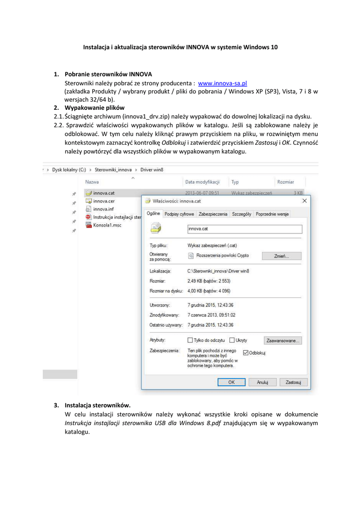Instalacja i aktualizacja sterowników INNOVA w systemie Windows 10 1. Pobranie sterowników INNOVA Sterowniki należy pobrać ze strony producenta : www.innova-sa.pl (zakładka Produkty / wybrany produkt / pliki do pobrania / Windows XP (SP3), Vista, 7 i 8 w wersjach 32/64 b). 2. Wypakowanie plików 2.1. Ściągnięte archiwum (innova1_drv.zip) należy wypakować do dowolnej lokalizacji na dysku. 2.2. Sprawdzić właściwości wypakowanych plików w katalogu. Jeśli są zablokowane należy je odblokować. W tym celu należy kliknąć prawym przyciskiem na pliku, w rozwiniętym menu kontekstowym zaznaczyć kontrolkę Odblokuj i zatwierdzić przyciskiem Zastosuj i OK. Czynność należy powtórzyć dla wszystkich plików w wypakowanym katalogu. 3. Instalacja sterowników. W celu instalacji sterowników należy wykonać wszystkie kroki opisane w dokumencie Instrukcja instajlacji sterownika USB dla Windows 8.pdf znajdującym się w wypakowanym katalogu. 4. Aktualizacja sterowników INNOVA 4.1. Otworzyć Menadżer urządzeń -> wybrać z listy: Porty (COM i LPT). Podłączyć drukarkę do portu USB. W liście: Porty (COM i LPT) pojawią się 2 rekordy „Urządzenie szeregowe USB(COMx)”, gdzie x – numer portu przydzielony przez system. 4.2. Kliknąć prawym przyciskiem myszy na „Urządzenie szeregowe USB(COMx)” odpowiadające podłączonej drukarce i z menu podręcznego wybrać opcję „Aktualizuj oprogramowanie sterownika…” 4.3. Wybrać opcję „Przeglądaj mój komputer w poszukiwaniu oprogramowania sterownika”. 4.4. W kolejnym oknie wskazać lokalizację sterowników na dysku i wybrać opcję „Pozwól mi wybrać z listy sterowników urządzeń na moim komputerze”. 4.5. Następnie należy wybrać sterownik dla danego modelu urządzenia i kliknąć „Dalej”. 4.6. Pojawi się okno z informacją o powodzeniu aktualizacji sterownika. 4.7. Klikamy zamknij. W Menadżerze urządzeń pojawi się zaktualizowana nazwa portu ze zaktualizowanym sterownikiem. 4.8. Następnie powtarzamy kroki 4.2.-4.7 dla drugiego portu odpowiadającego kopii elektronicznej.