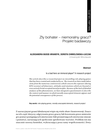 Homo Ludens 1/(4) (2012) Zły bohater – niemoralny gracz? Projekt badawczy Aleksandra Busse-Brandyk, Dorota Chmielewska-Łuczak Uniwersytet Wrocławski Abstract Is a bad hero an immoral player? A research project This article describes a research project on storytelling role-playing games that has been created and conducted by us. The research we have undertaken stems from the numerous controversies which concern the exposure (during RPG sessions) of behaviours, attitudes and emotions which are beyond or even actively break accepted moral principles. Because of the lack of detailed analyses of this phenomenon, we have designed a questionnaire to describe the context and manner in which morally unaccepted elements appear and the potential consequences of this process. Key words: role-playing games, morally unaccepted elements, research project Z narracyjnymi grami fabularnymi wiąże się wiele obaw i kontrowersji. Znaczna ich część dotyczy odgrywania przez graczy lub kreowania przez mistrzów gry postaci postępujących nieetycznie (lub przejawiających nieetyczne emocje i postawy), naruszających społecznie aprobowane wartości. Problem ten ma znacznie szerszy kontekst, wykraczający poza ramy współczesności. DotyHomo Ludens 1/(4) 2012 © Polskie Towarzystwo Badania Gier 2012 12 Aleksandra Busse-Brandyk, Dorota Chmielewska-Łuczak czy samej istoty fikcji, jej roli, znaczenia. Kwestia ta ma szczególną wagę, gdy odbiorcą jest młody człowiek kształtujący swoją tożsamość1. Narracyjnym grom fabularnym, które można traktować jako interpersonalną aktywność symboliczną (za: Zagórska, 2004), poświęcono wiele opracowań (m.in. w Polsce: Grzybkowska-Lewicka, 2001; Szeja, 2002). Dotyczyły one roli edukacyjnej, problemu eskapizmu, aspektów terapeutycznych gier fabularnych, a także interesującego nas aspektu zagrożeń związanych z uczestnictwem w nich (np. Hickman, 1989; Abeyta, Forest, 1991; Cardwell, 1994; Matelly, 1997). Prezentujemy projekt badawczy mający na celu wstępne usystematyzowanie opisanych na początku tekstu kwestii. Problem jest ważny ze względu na szczególną atrakcyjność gier fabularnych dla młodych ludzi. Mimo licznych podobieństw do innych wytworów aktywności symbolicznej (fantazje, literatura, film, muzyka, sztuka obrazowa) sesja RPG różni się od nich. Po pierwsze, proces tworzenia i odbioru fabuły ma charakter interaktywny, zachodzi symultanicznie u wszystkich uczestników gry, często bywa nieprzewidywalny. Po drugie, gracze i mistrz gry nie podlegają zasadom oceny społecznej obejmującym publikowane twory kultury (jak np. ocena wydawnicza, rating gier komputerowych, recenzje filmowe). Po trzecie – sesja narracyjnej gry fabularnej nie jest gotowym wytworem. Uczestnicy mają więc dużo mniejsze szanse ustalenia, w czym przyjdzie im brać udział i czy są na to gotowi. Ze względu na osobisty charakter kontaktu trudniej im też opuścić grę, gdy nie spełnia ich oczekiwań. Po czwarte, uczestnicy, a zwłaszcza Mistrz Gry stosują (świadomie lub nie) techniki wzmacniające proces immersji, co w połączeniu z symbolicznym charakterem przestrzeni i gry może powodować bardzo silne zaangażowanie niektórych uczestników2. Opisane powyżej cechy gier fabularnych mogą, dzięki niewielkiemu udziałowi zewnętrznej oceny społecznej i narzuconej struktury zachowań i reakcji, znacznie wzmocnić charakterystyczne dla kontaktu z fikcją mechanizmy projekcji i identyfikacji. Efektem tego może być zwiększenie wpływu cech osobowości (stanowiących podstawowe ramy aktywności i mających pełną swobodę ekspresji) oraz nieuświadomionych potrzeb i przeżyć uczestników, szczególnie mistrzów gry. Interesuje nas, czy istnieje związek między uczestnictwem w sesjach RPG, w których ujawniają się elementy kontrowersyjne etycznie, a funkcjonowaniem społecznym gracza. Jeżeli zaś taki związek występuje, to interesuje nas również jego charakter i przebieg. Szerzej o kontakcie młodego odbiorcy z fikcją w: Chmielewska-Łuczak, 2007. Więcej o zaangażowaniu uczestników i jego powszechności w: Chmielewska-Łuczak, Matkowski, 2008. 1 2 Homo Ludens 1/(4) 2012 © Polskie Towarzystwo Badania Gier 2012 Zły bohater – niemoralny gracz? Projekt badawczy 13 1. Problematyka badawcza Ze względu na bardzo szczegółowy opis i aparat pojęciowy, a także na możliwość ujawnienia głęboko symbolicznego i projekcyjnego charakteru narracyjnych gier fabularnych, jako podstawę teoretyczną naszych badań przyjęłyśmy założenia koncepcji psychoanalitycznych (klasycznej psychoanalizy Zygmunta Freuda i psychologii głębi Carla Gustawa Junga)3. Zakładamy jednak, że inne koncepcje psychologiczne4 mogą być równie inspirujące przy analizowaniu zjawiska elementów nieakceptowanych etycznie w RPG5. 1.1. Kontekst sytuacji badawczej Badane przez nas elementy nieakceptowane moralnie6 definiujemy jako postępowanie niezgodne z obowiązującymi w naszej kulturze standardami etycznymi. Za podstawowe przejawy tego postępowania uznałyśmy: 1. Brak reakcji wobec zdarzeń lub zachowań mogących prowadzić do czyjegoś cierpienia. 2. Uniemożliwianie innym osobom osiągnięcia dobrostanu. 3. Akceptowanie wyrządzania innym krzywdy. 4. Krzywdzenie innych. 5. Wyrażanie negatywnego stosunku do innych ludzi (uznawanie za gorszych, niegodnych szacunku, troski). Za płaszczyzny, na których w narracyjnych grach fabularnych mogą się ujawnić elementy niejednoznaczne moralnie, uznałyśmy: 1. treści – elementy rzeczywistości symbolicznej, w której odbywa się gra. Składają się na nie: ԀԀ realia polityczno-kulturowe obszaru, w którym znajdują się bohaterowie graczy7; ԀԀ zachowania i postawy bohaterów niezależnych; Zobacz także: Busse-Brandyk, Chmielewska-Łuczak, 2009. Warto tu wspomnieć chociażby o pojęciach zabawy symbolicznej Lwa Wygotskiego (1995) i eksperymentu tożsamościowego Erika Eriksona (1997), teorii rozwo