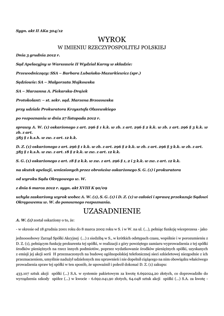 Sygn. akt II AKa 304/12 WYROK W IMIENIU RZECZYPOSPOLITEJ POLSKIEJ Dnia 3 grudnia 2012 r. Sąd Apelacyjny w Warszawie II Wydział Karny w składzie: Przewodniczący: SSA – Barbara Lubańska-Mazurkiewicz (spr.) Sędziowie: SA – Małgorzata Mojkowska SA – Marzanna A. Piekarska-Drążek Protokolant: – st. sekr. sąd. Marzena Brzozowska przy udziale Prokuratora Krzysztofa Olszewskiego po rozpoznaniu w dniu 27 listopada 2012 r. sprawy A. W. (1) oskarżonego z art. 296 § 1 k.k. w zb. z art. 296 § 2 k.k. w zb. z art. 296 § 3 k.k. w zb. z art. 585 § 1 k.s.h. w zw. z art. 12 k.k. D. Z. (1) oskarżonego z art. 296 § 1 k.k. w zb. z art. 296 § 2 k.k. w zb. z art. 296 § 3 k.k. w zb. z art. 585 § 1 k.s.h. w zw. z art. 18 § 2 k.k. w zw. z art. 12 k.k. S. G. (1) oskarżonego z art. 18 § 2 k.k. w zw. z art. 296 § 1, 2 i 3 k.k. w zw. z art. 12 k.k. na skutek apelacji, wniesionych przez obrońców oskarżonego S. G. (1) i prokuratora od wyroku Sądu Okręgowego w. W. z dnia 6 marca 2012 r. sygn. akt XVIII K 90/09 uchyla zaskarżony wyrok wobec A. W. (1), S. G. (1) i D. Z. (1) w całości i sprawę przekazuje Sądowi Okręgowemu w. W. do ponownego rozpoznania. UZASADNIENIE A. W. (1) został oskarżony o to, że: - w okresie od 18 grudnia 2001 roku do 8 marca 2002 roku w S. i w W. na ul. (...), pełniąc funkcję wiceprezesa - jako jednoosobowy Zarząd Spółki Akcyjnej (...) z siedzibą w S., w krótkich odstępach czasu, wspólnie i w porozumieniu z D. Z. (1), pełniącym funkcję prokurenta tej spółki, w realizacji z góry powziętego zamiaru wyprowadzenia z tej spółki środków pieniężnych na rzecz innych podmiotów, poprzez wydatkowanie środków pieniężnych spółki, uzyskanych z emisji jej akcji serii H przeznaczonych na budowę ogólnopolskiej telefonicznej sieci szkieletowej niezgodnie z ich przeznaczeniem, umyślnie nadużył udzielonych mu uprawnień i nie dopełnił ciążącego na nim obowiązku właściwego prowadzenia spraw tej spółki w ten sposób, że upoważnił i polecił dokonać D. Z. (1) zakupu: 433.107 sztuk akcji spółki (...) S.A. w systemie pakietowym za kwotę 6.692024,20 złotych, co doprowadziło do wyrządzenia szkody spółce (...) w kwocie - 6.692.041,90 złotych, 64.048 sztuk akcji spółki (...) S.A. za kwotę - 438.916,45 złotych, 2.700 sztuk akcji spółki (...) S.A. za kwotę 36.910 złotych co naraziło spółkę (...) na oczywiste niebezpieczeństwo powstania szkody materialnej, a także: udzielił w dniu 28 stycznia 2002 roku pożyczki spółce (...) z siedzibą w Ł. w kwocie 1.800.000 złotych, którą następnie zamienił w dniu 28 lutego 2002 roku na 20 bonów dłużnych od tej spółki za kwotę - 1.923.076,92 złotych, które nie zostały wykupione i przyniosło to spółce (...) szkodę w wysokości 1.793.076,92 złotych, oraz: w dniu 18 stycznia 2002 roku zawarł niekorzystną dla reprezentowanej spółki umowę - zlecenie z Kancelarią Adwokacką - (...), na podstawie której w dniu 28 lutego 2002 roku doprowadził do niezasadnego rozporządzenia majątkiem spółki w postaci zaliczki w kwocie 500 tysięcy złotych na rzecz tej kancelarii, co wobec niewykonania warunków tej umowy spowodowało szkodę w mieniu spółki w kwocie 500 tysięcy złotych, czym działał na szkodę reprezentowanej spółki (...), narażając ją na oczywiste niebezpieczeństwo powstania szkody materialnej i utratę korzyści, jakie mogła ta spółka osiągnąć, gdyby środki te przeznaczyła zgodnie z prospektem emisyjnym akcji serii H, podczas gdy lokowanie ich na giełdzie papierów wartościowych w tym czasie było obarczone wysokim ryzykiem, a zakup akcji spółki (...), która była w tym czasie w bardzo trudnej sytuacji finansowej i zgłoszone były wnioski o ogłoszenie jej upadłości oraz udzielenia pożyczki ze środków, które były przeznaczone na inne ściśle określone cele, a także wydatkowanie środków bez wykonania należnej pracy - wiązało się w sposób oczywisty z niebezpieczeństwem powstania strat i w konsekwencji tych decyzji przyniosło to spółce (...) szkody w wielkich rozmiarach na łączną kwotę - 8.940.944,20 złotych, tj. o przestępstwa z art. 296 § 1 k.k. w zb. z art. 296 § 2 k.k. w zb. z art. 296 § 3 k.k. w zb. z art. 585 § 1 k.s.h. w zw. z art. 12 k.k.; D. Z. (1) został oskarżony o to, że: - w okresie od 18 grudnia 2001 roku do 8 marca 2002 roku w S. i w W. na ul. (...), pełniąc funkcję prokurenta Spółki Akcyjnej (...) z siedzibą w S., w krótkich odstępach czasu, wspólnie i w porozumieniu z Wiceprezesem Zarządu Spółki (...) – A. W. (1) i jej akcjonariuszem S. G. (1), w realizacji z góry powziętego zamiaru wyprowadzenia z tej spółki środków pieniężnych na rzecz innych podmiotów, poprzez wydatkowanie środków pieniężnych spółki (...), uzyskanych z emisji akcji serii H przeznaczonych na budowę ogólnopolskiej telefonicznej sieci szkieletowej - niezgodnie z ich przeznaczeniem, umyślnie nadużył udzielonych mu uprawnień i nie dopełnił ciążącego na nim obowiązku właściwego reprezentowania tej spółki w ten sposób, że dokonał zakupu: 433.107 sztuk akcji spółki (...) S.A. w systemie pakietowym za kwotę 6.692.041,90 złotych, co doprowadziło do wyrządzenia szkody spółce (...) w kwocie - 6.647.867,28 złotych, 64.048 sztuk akcji spółki (...) S.A. za kwotę 438.916,45 złotych, 2.700 sztuk akcji spółki (...) S.A. za kwotę 36.910 złotych co naraziło spółkę (...) na oczywiste niebezpieczeństwo powstania szkody materialnej, a także: nakłonił A. W. (1) do udzielenia w dniu 28 stycznia 2002 roku pożyczki spółce (...) z siedzibą w Ł. w kwocie 1.800.000 złotych, która została następnie zamieniona w dniu 28 lutego 2002 roku na 20 bonów dłużnych od tej spółki za kwotę - 1.923.076,92 złotych, które nie zostały wykupione i przyniosło to spółce (...) szkodę w wysokości 1.793.076,92 złotych czym działał na szkodę reprezentowanej spół