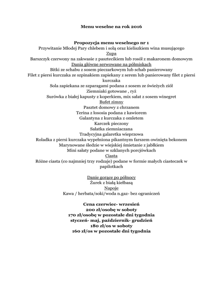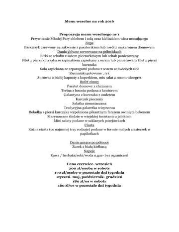 Menu weselne na rok 2016 Propozycja menu weselnego nr 1 Przywitanie Młodej Pary chlebem i solą oraz kieliszkiem wina musującego Zupa Barszczyk czerwony na zakwasie z pasztecikiem lub rosół z makaronem domowym Dania główne serwowane na półmiskach Bitki ze schabu z sosem pieczarkowym lub schab panierowany Filet z piersi kurczaka ze szpinakiem zapiekany z serem lub panierowany filet z piersi kurczaka Sola zapiekana ze szparagami podana z sosem ze świeżych ziół Ziemniaki gotowane , ryż Surówka z białej kapusty z koperkiem, mix sałat z sosem winegret Bufet zimny Pasztet domowy z chrzanem Terina z łososia podana z kawiorem Galantyna z kurczaka z omletem Karczek pieczony Sałatka ziemniaczana Tradycyjna galaretka wieprzowa Roladka z piersi kurczaka wypełniona pikantnym farszem owinięta bekonem Marynowane śledzie w wiejskiej śmietanie z jabłkiem Mini sałaty podane w szklanych porcjówkach Ciasta Różne ciasta (co najmniej trzy rodzaje) podane w formie małych ciasteczek w papilotkach Danie gorące po północy Żurek z białą kiełbasą Napoje Kawa / herbata/soki/woda n.gaz- bez ograniczeń Cena czerwiec- wrzesień 200 zł/osobę w soboty 170 zł/osobę w pozostałe dni tygodnia styczeń- maj, październik- grudzień 180 zł/os w soboty 160 zł/os w pozostałe dni tygodnia Propozycja menu weselnego nr 2 Przywitanie Młodej Pary chlebem i solą oraz kieliszkiem wina musującego Przystawka Wątróbka drobiowa zapiekana w bekonie podana na grzance lub vol-au-vent z nadzieniem z sera pleśniowego i orzechów włoskich Zupa Rosół z kołdunami lub zupa porowo- ziemniaczana z łososiem i łezką śmietany Dania główne serwowane na półmiskach Polędwiczka wieprzowa w sosie demi glace lub zraziki z karkówki w sosie własnym Pierś z kurczaka zapiekana z bakłażanem i cukinią i serem chedar lub filet z piersi indyka z suszonymi pomidorami i mozzarellą Łosoś w sosie porowym lub sandacz w sosie rakowym Ziemniaki gotowane , ziemniaki opiekane, ryż Mix sałat z sosem winegret, buraczki na ciepło, brokuł Deser Panna cotta z sosem malinowym lub musem truskawkowym Bufet zimny Pasztet z dziczyzny z żurawiną Półmiski mięs pieczonych podane w formie różnorodnych roladek Rolada z pieczonego kurczaka podana w delikatnej warzywnej galaretce Rostbeef pieczony na różowo oprószony kolorowym pieprzem i ziołami Mini sałaty w szklanych porcjówkach Tymbaliki z łososia Gravlax z łososia Ciasta Różne ciasta podane w formie małych ciasteczek w papilotkach Danie gorące po północy Węgierska zupa gulaszowa Napoje Kawa / herbata/ soki/woda n.gaz- bez ograniczeń Cena czerwiec- wrzesień 245 zł/osobę w soboty 210 zł/osobę w pozostałe dni tygodnia styczeń- maj, październik- grudzień 220 zł/os w soboty 200 zł/os w pozostałe dni tygodnia Propozycja menu weselnego nr 3 Tort weselny i stół wiejski w prezencie!!! Przywitanie Młodej Pary chlebem i solą oraz kieliszkiem oryginalnego francuskiego champagne Przystawka Mus z łososia podany na grzance z bazyliowym pesto lub roladka z polędwiczki z bakaliami owinięta bekonem Zupa borowikowa lub krem ze szparagów z grzankami Dania główne serwowane na półmiskach Roladka z polędwiczki z szynką dojrzewającą w sosie z sera pleśniowego lub tradycyjne zraziki wołowe lub zraziki wołowe z wiśniami Filet z kaczki z gorącymi wiśniami i rozmarynem lub pieczone udko z kaczki marynowane w miodzie i winie Ziemniaki opiekane, ryż, kasza Mix sałat z sosem winegret, bukiet warzyw blanszowanych Deser Mus z belgijskiej czekolady z sosem malinowym Bufet zimny Rostbef pieczony na różowo podany z sosem z oliwy i świeżych ziół Vitello Tonnato- duszona cielęcina podana z sosem z anchovies Tatar z tuńczyka Carpacio z łososia Deski rozmaitych serów włoskich i francuskich Półmisek hiszpańskich i włoskich wędlin dojrzewających Pieczona i wędzona dziczyzna z sosem śliwkowym Bufet sałatkowy (składniki sałat do samodzielnej kompozycji) Bufet słodki różnorodne ciasta i torciki w papilotkach podane na paterze Fontanna czekoladowa Danie gorące podane po północy Pierogi z dziczyzną z sosem kurkowym Consome wołowe Napoje Kawa / herbata soki/woda n.gaz- bez ograniczeń czerwiec- wrzesień 345 zł/osobę w soboty 310 zł/osobę w pozostałe dni tygodnia styczeń- maj, październik- grudzień 295 zł/os w soboty 280 zł/os w pozostałe dni tygodnia Cennik napojów i alkoholi Wódka czysta Żołądkowa de luxe but 0,5l 35 zł Wino domu Ucenda Bodegas del Rosario (hiszpańskie, wytrawne, białe i czerwone) karafka 0,5l- 19 zł lub but 0,75l- 39 zł Pakiet zimnych napojów (napoje gazowane w butelkach szklanych 0,2/0,25l) 10 zł/os Piwo keg 30l 300 zł Rabaty i dopłaty Dzieci do lat 3 bezpłatnie 4-10 rabat 50% Ilość gości mniejsza niż 80 osób 60-79 osób dopłata 1500 zł 40-59 osób dopłata 2500 zł do 39 osób dopłata 3500 zł Zimne przekąski podawane na stoły zamiast zimnego bufetu Dopłata 10 zł/os Opcje dodatkowe Tort weselny- smak i forma do uzgodnienia- od 65 zł/kg Stylizowany stolik wiejski w formie oddzielnego bufetu (min 8 kg produktów)- od 800 zł Dzik pieczony- od 900 zł Prosiak pieczony- od 500 zł Łosoś lub szczupak pieczony w całości- od 350 zł