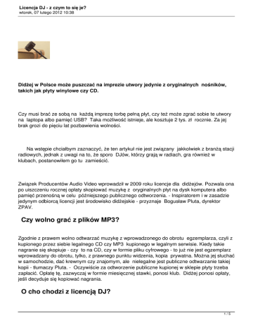 Licencja DJ - z czym to się je? wtorek, 07 lutego 2012 10:38 Didżej w Polsce może puszczać na imprezie utwory jedynie z oryginalnych nośników, takich jak płyty winylowe czy CD. Czy musi brać ze sobą na każdą imprezę torbę pełną płyt, czy też może zgrać sobie te utwory na laptopa albo pamięć USB? Taka możliwość istnieje, ale kosztuje 2 tys. zł rocznie. Za jej brak grozi do pięciu lat pozbawienia wolności. Na wstępie chciałbym zaznaczyć, że ten artykuł nie jest związany jakkolwiek z branżą stacji radiowych, jednak z uwagi na to, że sporo DJów, którzy grają w radiach, gra również w klubach, postanowiłem go tu zamieścić. Związek Producentów Audio Video wprowadził w 2009 roku licencje dla didżejów. Pozwala ona po uiszczeniu rocznej opłaty skopiować muzykę z oryginalnych płyt na dysk komputera albo pamięć przenośną w celu późniejszego publicznego odtworzenia. - Inspiratorem i w zasadzie jedynym odbiorcą licencji jest środowisko didżejskie - przyznaje Bogusław Pluta, dyrektor ZPAV. Czy wolno grać z plików MP3? Zgodnie z prawem wolno odtwarzać muzykę z wprowadzonego do obrotu egzemplarza, czyli z kupionego przez siebie legalnego CD czy MP3 kupionego w legalnym serwisie. Kiedy takie nagranie się skopiuje - czy to na CD, czy w formie pliku cyfrowego - to już nie jest egzemplarz wprowadzany do obrotu, tylko, z prawnego punktu widzenia, kopia prywatna. Można jej słuchać w samochodzie, dać krewnym czy znajomym, ale nielegalne jest publiczne odtwarzanie takiej kopii - tłumaczy Pluta. - Oczywiście za odtworzenie publiczne kupionej w sklepie płyty trzeba zapłacić. Opłatę tę, zazwyczaj w formie miesięcznej stawki, ponosi klub. Didżej ponosi opłaty, jeśli decyduje się kopiować nagrania. O cho chodzi z licencją DJ? 1/5 Licencja DJ - z czym to się je? wtorek, 07 lutego 2012 10:38 Wyrobienie licencji jest z formalnego punktu widzenia bardzo proste. Wystarczy dokonać rejestracji na stronie dj.zpav.pl, wpłacić 2 tys. zł (jeśli rejestrujemy się w styczniu, jeśli później odpowiednio mniej za każdy miesiąc) na konto związku, wydrukować umowę w czterech egzemplarzach, podpisać i odesłać na wskazany adres. Następnie co kwartał trzeba raportować do ZPAV pełną listę zdigitalizowanych utworów, wraz z nazwiskami autorów kompozycji i nazwą posiadającej prawa wytwórni. Listy takiej didżej nie ma obowiązku tworzyć, jeśli gra z oryginalnych nośników. - Jeśli didżej kopiuje nagranie i płaci nam za nie poprzez licencję, wówczas my musimy wiedzieć, komu ile przekazać pieniędzy - wyjaśnia Pluta. - Za puszczanie muzyki z oryginalnych nośników płaci klub. My nie wymagamy od klubów przesyłania kompletnej listy utworów, bo to jest chyba nierealne. Stosujemy własne metody szacowania, ale w przyszłym roku planujemy monitoring tego tematu. Wylosujemy grupę reprezentatywną klubów, za ich zgodą zainstalujemy monitoring i będziemy lepiej wiedzieć, komu ile zapłacić - tłumaczy. Problem z gwiazdami z zagranicy. Problemy z plikami MP3 W przypadku muzyki kopiowanej z płyt sprawa jest więc jasna. A co z nagraniami kupowanymi w sklepach MP3? - Wszystko zależy od licencji - tłumaczy Pluta. - Jeśli zezwala ona tylko na użytek prywatny, to nie jest to dozwolone nawet z licencją. Jeśli jest zgoda na publiczne odtwarzanie - wówczas licencja nie jest potrzebna. Tak właśnie brzmiący zapis zawarty jest w regulaminie sklepu Apple - iTunes: "Produkty iTunes są przeznaczone wyłącznie do użytku osobistego i nie mogą być wykorzystywane przez użytkownika w celach komercyjnych". Didżeje mogą za to dowolnie miksować utwory podczas imprezy, muszą jednak wyszczególnić, jakie kompozycje zostały w miksie wykorzystane. - Jeśli zaś didżej zrobi taki miks wcześniej i nagra go na dysk, to ma prawo używać go w ramach tej licencji, ale nie może dać go koledze ani tym bardziej sprzedawać - doprecyzowuje Pluta. Licencji dla didżejów nie może wykupić klub. - Zastanawialiśmy się, jaki model sprzedaży tego typu licencji przyjąć. Uznaliśmy, że sprzedajemy je didżejowi, a klub nie może legalizować komputera. Wzięło się to z naszych obserwacji: didżej przychodzi zazwyczaj ze swoim sprzętem i gra. Licencja pozwala jednak stowarzyszeniom didżejskim kupować jedną płytę na cały klub i potem każdy z członków może ją skopiować. 2/5 Licencja DJ - z czym to się je? wtorek, 07 lutego 2012 10:38 A jeśli klub chciałby puszczać muzykę z plików w komputerze bądź skopiowanych płyt, a nie ma zamiaru zatrudniać didżejów? Sytuacja nie jest taka prosta. - My możemy udzielić licencji na użycie muzyki innej niż do tańca. To kosztuje 150 zł rocznie. Jest to jednak oferta raczej dla restauracji i sklepów, bo w przypadku klubów czy dyskotek trudno to wyraźnie rozgraniczyć. Jeśli wówczas sklep kopiuje muzykę i odtwarza ją z komputera, to płaci 150 zł rocznie. Jeżeli jest to sieć sklepów - to płaci 50 zł od punktu. Inny problem wynikający z zapisów prawa to zapraszanie didżejów z zagranicy. Czy klub powinien płacić każdorazowo 2 tys. złotych za didżeja z Zachodu, który chce puszczać utwory z komputera? - Zasadniczo tak - przyznaje Pluta, ale po chwili milczenia dodaje: - Jeśli didżej ma legalną kopię w myśl prawa swojego kraju, na przykład jeśli pochodzi z kraju, gdzie można legalnie skopiować płytę na użytek komercyjny, może grać. Może też grać, jeśli ma licencję, chyba że obowiązuje ona jedynie na terenie jego kraju. Od trzech do pięciu lat pozbawienia wolności Jak dotąd licencje didżejskie wykupiło w Polsce nieco ponad 350 osób. Według dyrektora Pluty to dobry wynik. Szacunki ZPAV wskazują, że w Polsce jako główne źródło utrzymania zawód didżeja traktuje około tysiąca osób. Nieregularnie gra kolejne trzy tysiące. - Można powiedzieć, że jest coraz lepiej i rynek zaczyna rozumieć problem. Szkoda tylko