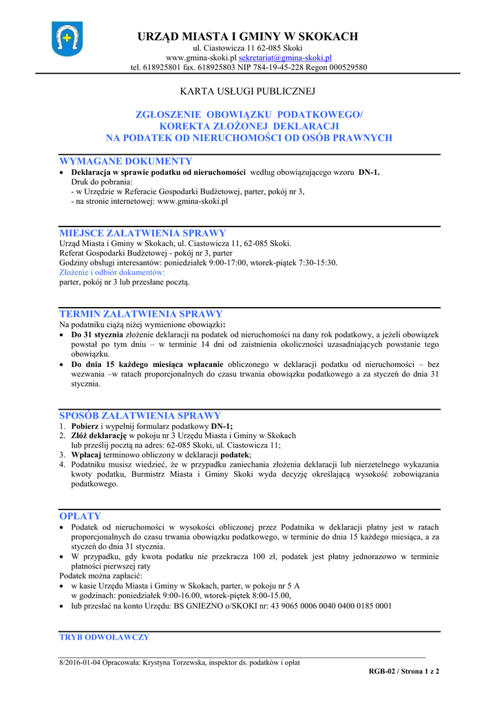 URZĄD MIASTA I GMINY W SKOKACH ul. Ciastowicza 11 62-085 Skoki www.gmina-skoki.pl [email protected] tel. 618925801 fax. 618925803 NIP 784-19-45-228 Regon 000529580 KARTA USŁUGI PUBLICZNEJ ZGŁOSZENIE OBOWIĄZKU PODATKOWEGO/ KOREKTA ZŁOŻONEJ DEKLARACJI NA PODATEK OD NIERUCHOMOŚCI OD OSÓB PRAWNYCH WYMAGANE DOKUMENTY Deklaracja w sprawie podatku od nieruchomości według obowiązującego wzoru DN-1. Druk do pobrania: - w Urzędzie w Referacie Gospodarki Budżetowej, parter, pokój nr 3, - na stronie internetowej: www.gmina-skoki.pl MIEJSCE ZAŁATWIENIA SPRAWY Urząd Miasta i Gminy w Skokach, ul. Ciastowicza 11, 62-085 Skoki. Referat Gospodarki Budżetowej - pokój nr 3, parter Godziny obsługi interesantów: poniedziałek 9:00-17:00, wtorek-piątek 7:30-15:30. Złożenie i odbiór dokumentów: parter, pokój nr 3 lub przesłane pocztą. TERMIN ZAŁATWIENIA SPRAWY Na podatniku ciążą niżej wymienione obowiązki: Do 31 stycznia złożenie deklaracji na podatek od nieruchomości na dany rok podatkowy, a jeżeli obowiązek powstał po tym dniu – w terminie 14 dni od zaistnienia okoliczności uzasadniających powstanie tego obowiązku. Do dnia 15 każdego miesiąca wpłacanie obliczonego w deklaracji podatku od nieruchomości – bez wezwania –w ratach proporcjonalnych do czasu trwania obowiązku podatkowego a za styczeń do dnia 31 stycznia. SPOSÓB ZAŁATWIENIA SPRAWY 1. Pobierz i wypełnij formularz podatkowy DN-1; 2. Złóż deklarację w pokoju nr 3 Urzędu Miasta i Gminy w Skokach lub prześlij pocztą na adres: 62-085 Skoki, ul. Ciastowicza 11; 3. Wpłacaj terminowo obliczony w deklaracji podatek; 4. Podatniku musisz wiedzieć, że w przypadku zaniechania złożenia deklaracji lub nierzetelnego wykazania kwoty podatku, Burmistrz Miasta i Gminy Skoki wyda decyzję określającą wysokość zobowiązania podatkowego. OPŁATY Podatek od nieruchomości w wysokości obliczonej przez Podatnika w deklaracji płatny jest w ratach proporcjonalnych do czasu trwania obowiązku podatkowego, w terminie do dnia 15 każdego miesiąca, a za styczeń do dnia 31 stycznia. W przypadku, gdy kwota podatku nie przekracza 100 zł, podatek jest płatny jednorazowo w terminie płatności pierwszej raty Podatek można zapłacić: w kasie Urzędu Miasta i Gminy w Skokach, parter, w pokoju nr 5 A w godzinach: poniedziałek 9:00-16.00, wtorek-piętek 8:00-15.00, lub przesłać na konto Urzędu: BS GNIEZNO o/SKOKI nr: 43 9065 0006 0040 0400 0185 0001 TRYB ODWOŁAWCZY 8/2016-01-04 Opracowała: Krystyna Torzewska, inspektor ds. podatków i opłat RGB-02 / Strona 1 z 2 URZĄD MIASTA I GMINY W SKOKACH ul. Ciastowicza 11 62-085 Skoki www.gmina-skoki.pl [email protected] tel. 618925801 fax. 618925803 NIP 784-19-45-228 Regon 000529580 KARTA USŁUGI PUBLICZNEJ Odwołanie od decyzji wnosi się do Samorządowego Kolegium Odwoławczego w Pile, ul. Dzieci Polskich 26, 64-920 Piła, za pośrednictwem Burmistrza Miasta i Gminy Skoki w terminie 14 dni od jej doręczenia. DODATKOWE INFORMACJE 1) podatnikami podatku od nieruchomości są właściciele nieruchomości lub obiektów budowlanych, posiadacze samoistni nieruchomości lub obiektów budowlanych, użytkownicy wieczyści gruntów, posiadacze nieruchomości lub ich części albo obiektów budowlanych lub ich części stanowiących własność Skarbu Państwa lub Gminy Skoki; 2) opodatkowaniu podatkiem od nieruchomości podlegają grunty, budynki lub ich części, budowle lub ich części związane z prowadzeniem działalności gospodarczej; 3) podstawę opodatkowania stanowi: - dla gruntów – powierzchnia, - dla budynków lub ich części – powierzchnia użytkowa, - dla budowli lub ich części związanych z prowadzeniem działalności gospodarczej – wartość, o której mowa w przepisach o podatkach dochodowych, ustalona na dzień 1 stycznia roku podatkowego, stanowiąca podstawę obliczania amortyzacji w tym roku, niepomniejszona o odpisy amortyzacyjne, a w przypadku budowli całkowicie zamortyzowanych – ich wartość z dnia 1 stycznia roku, w którym dokonano ostatniego odpisu amortyzacyjnego; 4) podatnicy są zobowiązani do zgłoszenia zmian mających wpływ na wysokość podatku w trakcie roku poprzez złożenie korekty deklaracji podatkowej; 5) dodatkowych informacji udzielają pracownicy Urzędu Krystyna Torzewska lub Jagoda Jung-Kaźmierczak pod nr telefonu (61) 892-58-19. PODSTAWA PRAWNA Art. 6 ustawy z 12 stycznia 1991 r. o podatkach i opłatach lokalnych (tekst jednolity Dz. U. z 2014 r., poz. 849ze zmianami). Ustawa z 29 sierpnia 1997 r. Ordynacja podatkowa (tekst jednolity Dz. U. z 2015 r. poz. 613 ze zmianami). Uchwała nr XIV/77/2015 Rady Miejskiej Gminy Skoki z dnia 19.11.2015 r. w sprawie ustalenia stawek i zwolnień w podatku od nieruchomości (Dz.Urz. Woj. Wlkp. nr 7151). Uchwała nr XIV/78/2015 Rady Miejskiej Gminy Skoki z dnia 19.11.2015 r. w sprawie określenia wzorów formularzy informacji i deklaracji podatkowych /Dz.Urzęd. Woj. Wlkp. nr 7138/. Rozporządzenie Ministra Finansów z 22 kwietnia 2004 r. w sprawie ewidencji podatkowej nieruchomości (Dz. U. Nr 107, poz. 1138). 8/2016-01-04 Opracowała: Krystyna Torzewska, inspektor ds. podatków i opłat RGB-02 / Strona 2 z 2
