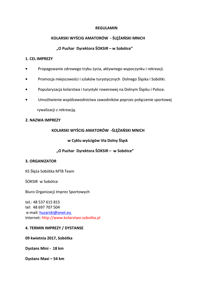 REGULAMIN KOLARSKI WYŚCIG AMATORÓW - ŚLĘŻAŃSKI MNICH „O Puchar Dyrektora ŚOKSIR – w Sobótce” 1. CEL IMPREZY • Propagowanie zdrowego trybu życia, aktywnego wypoczynku i rekreacji. • Promocja miejscowości i szlaków turystycznych Dolnego Śląska i Sobótki. • Popularyzacja kolarstwa i turystyki rowerowej na Dolnym Śląsku i Polsce. • Umożliwienie współzawodnictwa zawodników poprzez połączenie sportowej rywalizacji z rekreacją. 2. NAZWA IMPREZY KOLARSKI WYŚCIG AMATORÓW -ŚLĘŻAŃSKI MNICH w Cyklu wyścigów Via Dolny Śląsk „O Puchar Dyrektora ŚOKSIR – w Sobótce” 3. ORGANIZATOR KS Ślęża Sobótka MTB Team ŚOKSIR w Sobótce Biuro Organizacji Imprez Sportowych tel.: 48 537 615 815 tel: 48 697 707 504 e-mail: [email protected] Internet: http://www.kolarstwo.sobotka.pl 4. TERMIN IMPREZY / DYSTANSE 09 kwietnia 2017, Sobótka Dystans Mini - 18 km Dystans Maxi – 54 km 5. WARUNKI UCZESTNICTWA Ślężański Mnich 2017 to ogólnodostępna impreza rowerowa rozgrywana we wskazanych terminach i miejscach. Uczestnikiem może być osoba, która spełni poniższe warunki: 5.1 Zawodnik zobowiązany jest do wypełnienia i wysłania specjalnego formularza zgłoszeniowego oraz do uiszczenia opłaty za start. Organizator dopuszcza dwa sposoby dokonywania zgłoszeń i opłat: A) Osobiście: Zgłoszeń, opłat i odbioru numerów startowych na Ślężański Mnich 2017 można będzie dokonywać w Sobótce Hotel Sobotel ul. Św. Anny 16 w dniu 08.04.2017 w godz. od 16:00 20:00 oraz w dniu 09.04.2017 w godz. od 7:00 – 9:00 B) Za pośrednictwem Internetu: - Wysłanie poprzez stronę internetową wypełnionego formularza zgłoszeniowego oraz wniesienie opłaty www.kolarstwo.sobotka.pl (przy odbiorze numeru startowego uczestnik zobowiązany będzie do złożenia podpisu na formularzu zgłoszeniowym wydrukowanym przez Organizatora, dotyczy tylko zawodników, którzy wypełnią formularz i opłacą startowe, przestrzegając terminu zgłoszeń. Po tym terminie uczestnicy będą musieli wypełniać formularz na miejscu w Biurze Zawodów. - Dokonanie opłaty startowej w wysokości określonej w poz. 6 niniejszego regulaminu. Oryginał dowodu opłaty startowej (włącznie z opłatami przez Internet) każdy zawodnik musi zachować do wglądu w Biurze Zawodów. - Zgłoszenie uczestnictwa przez Internet oraz wpłacenie opłaty startowej należy dokonać w ostatecznym terminie do 07.04.2017. Po tym terminie zgłoszenie uczestnictwa oraz opłaty będą możliwe tylko w Biurze Zawodów Hotel Sobotel ul. Św. Anny 16 w dniu 08.04.2017 w godz. od 16:00 - 20:00 oraz w dniu 09.04.2017 w godz. od 7:00 – 9:00 Zgłoszenie jest jednocześnie oświadczeniem o zapoznaniu się uczestnika wyścigu Ślężański Mnich z treścią regulaminu i akceptacją jego warunków. UWAGA! Zawodniczki i zawodnicy Ślężańskiego Mnicha 2017r. którzy zapisali się przez stronę internetową, a nie uiścili opłaty za udział w wyścigu zobowiązani są do przelania na konto - płatności w systemie Datasport bezpośrednio po zalogowaniu, opłata startowa w wysokości 50,00 zł najpóźniej do 07.04.2017. Brak opłaty startowej w wyżej wymienionym terminie oznaczać będzie wykreślenie z listy startowej. Istnieje możliwość wykupienia pakietu startowego w kwocie 200,00 zł wg zasad wyścigów Via Dolny Śląsk zgodnie z & 1. pkt.4 5.2 Impreza ma charakter otwarty, prawo udziału w wyścigu mają osoby: • • które ukończyły 18 lat, osoby w wieku 16-18 lat, mają prawo startu wyłącznie za pisemną zgodą rodzica lub opiekuna prawnego lub osoby sprawującej opiekę w czasie trwania wyścigu i jego/jej stałą obecnością na imprezie (podpis na formularzu zgłoszeniowym) - posiadającej pisemne oświadczenie wyrażające zgodę rodzica lub opiekuna prawnego na udział nieletniego w wyścigu (według wzoru oświadczenia opublikowanego na stronie internetowej www.kolarstwo.sobotka.pl, stanowiącego załącznik do niniejszego Regulaminu). 5.4 Każdy zawodnik zgłoszony do Ślężańskiego Mnicha w 2017 r. startuje na własną odpowiedzialność (w przypadku zawodników niepełnoletnich na odpowiedzialność rodzica lub prawnego opiekuna). Dopuszcza się do uczestnictwa w zawodach wyłącznie osoby posiadające dobry stan zdrowia, nie posiadające przeciwwskazań medycznych do uczestnictwa w wyścigu. Ten fakt zawodnik potwierdzi własnoręcznym podpisem na formularzu zgłoszeniowym przygotowanym przez Organizatora. W przypadku osób niepełnoletnich potwierdzenie dobrego stanu zdrowia, braku przeciwwskazań medycznych oraz wyrażenie zgody na udział w zawodach potwierdza na formularzu zgłoszeniowym lub stosownym oświadczeniu własnoręcznym podpisem rodzic lub opiekun prawny nieletniego zawodnika oraz osoba, której opiekunowie prawni powierzyli opiekę nad nieletnim zawodnikiem w czasie trwania wyścigu. 5.5 Każdy zawodnik ma obowiązek startu w kasku sztywnym podczas całego wyścigu. W przypadku naruszenia tego przepisu, zawodnik zostanie ukarany dyskwalifikacją. Zaleca się rower szosowy. 5.6 Każdy zawodnik ma obowiązek zapoznania się z trasą wyścigu. 5.7 Pojazdy towarzyszące są bezwzględnie zabronione. 5.8 Zaleca się posiadanie ubezpieczenia OC i NW. 6. OPŁATY STARTOWE 2017 6.1 W Ślężańskim Mnichu obowiązuje opłata za udział: • • 50,00 zł - do 07.04.2017r. (przelew), 70,00 zł - w dniu 08.04.2017 w godz. od 16:00 - 20:00 oraz w dniu 09.04.2017 w godz. od 7:00 – 9:00 6.2 Każdy zawodnik, po uiszczeniu opłaty startowej, otrzymuje numer startowy z chipem uprawniający do startu Ślężańskim Mnichu 6.3 Opłata startowa płatności w systemie Datasport bezpośrednio po zalogowaniu. 6.4 Organizator nie ponosi odpowiedzialności za terminy realizacji przelewów bankowych i pocztowych. Przyjęci będą ci zawodnicy, których przelewy zostały zaksięgowane na koncie Organizatora oraz posiadają dowody wpłat. 6.5 Każdy zawodnik dokonujący wpłaty w Biurze Zawodów otr