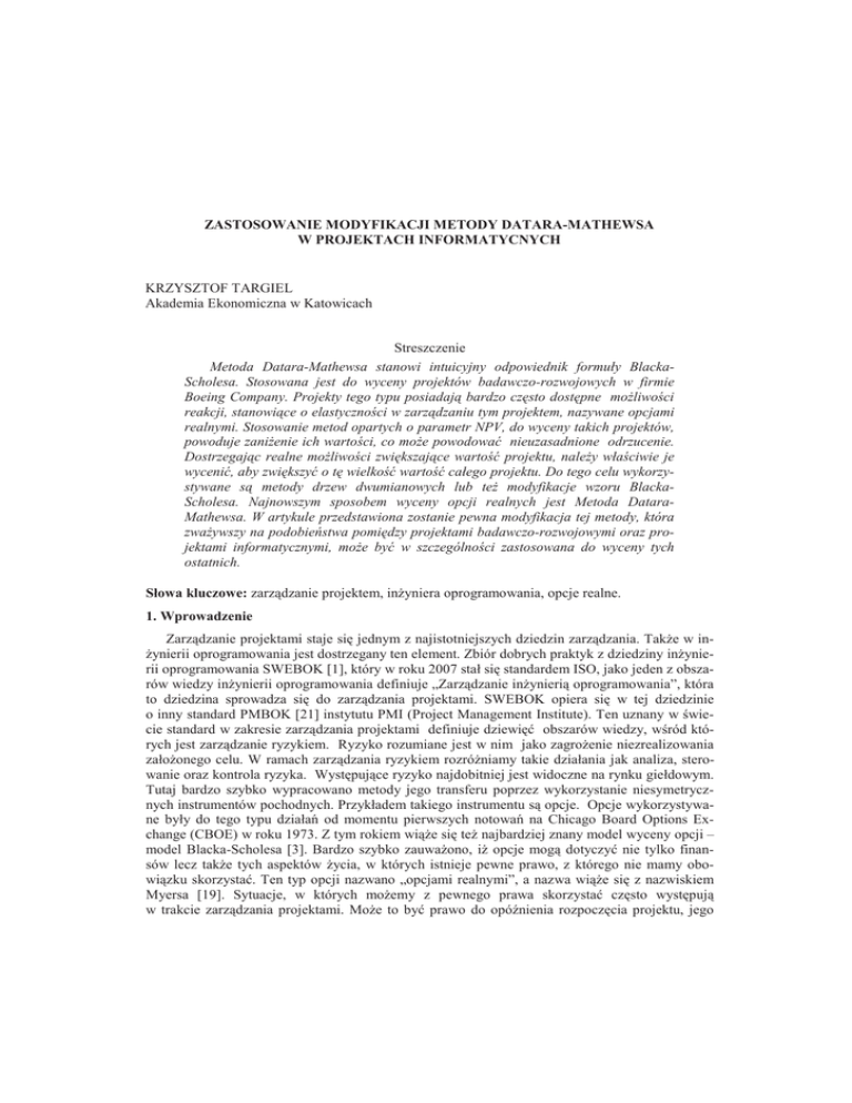 ZASTOSOWANIE MODYFIKACJI METODY DATARA-MATHEWSA W PROJEKTACH INFORMATYCNYCH KRZYSZTOF TARGIEL Akademia Ekonomiczna w Katowicach Streszczenie Metoda Datara-Mathewsa stanowi intuicyjny odpowiednik formuły BlackaScholesa. Stosowana jest do wyceny projektów badawczo-rozwojowych w firmie Boeing Company. Projekty tego typu posiadaj bardzo czsto dostpne moliwoci reakcji, stanowice o elastycznoci w zarzdzaniu tym projektem, nazywane opcjami realnymi. Stosowanie metod opartych o parametr NPV, do wyceny takich projektów, powoduje zanienie ich wartoci, co moe powodowa nieuzasadnione odrzucenie. Dostrzegajc realne moliwoci zwikszajce warto projektu, naley właciwie je wyceni, aby zwikszy o t wielko warto całego projektu. Do tego celu wykorzystywane s metody drzew dwumianowych lub te modyfikacje wzoru BlackaScholesa. Najnowszym sposobem wyceny opcji realnych jest Metoda DataraMathewsa. W artykule przedstawiona zostanie pewna modyfikacja tej metody, która zwaywszy na podobiestwa pomidzy projektami badawczo-rozwojowymi oraz projektami informatycznymi, moe by w szczególnoci zastosowana do wyceny tych ostatnich. Słowa kluczowe: zarzdzanie projektem, inyniera oprogramowania, opcje realne. 1. Wprowadzenie Zarzdzanie projektami staje si jednym z najistotniejszych dziedzin zarzdzania. Take w inynierii oprogramowania jest dostrzegany ten element. Zbiór dobrych praktyk z dziedziny inynierii oprogramowania SWEBOK [1], który w roku 2007 stał si standardem ISO, jako jeden z obszarów wiedzy inynierii oprogramowania definiuje „Zarzdzanie inynieri oprogramowania”, która to dziedzina sprowadza si do zarzdzania projektami. SWEBOK opiera si w tej dziedzinie o inny standard PMBOK [21] instytutu PMI (Project Management Institute). Ten uznany w wiecie standard w zakresie zarzdzania projektami definiuje dziewi obszarów wiedzy, wród których jest zarzdzanie ryzykiem. Ryzyko rozumiane jest w nim jako zagroenie niezrealizowania załoonego celu. W ramach zarzdzania ryzykiem rozróniamy takie działania jak analiza, sterowanie oraz kontrola ryzyka. Wystpujce ryzyko najdobitniej jest widoczne na rynku giełdowym. Tutaj bardzo szybko wypracowano metody jego transferu poprzez wykorzystanie niesymetrycznych instrumentów pochodnych. Przykładem takiego instrumentu s opcje. Opcje wykorzystywane były do tego typu działa od momentu pierwszych notowa na Chicago Board Options Exchange (CBOE) w roku 1973. Z tym rokiem wie si te najbardziej znany model wyceny opcji – model Blacka-Scholesa [3]. Bardzo szybko zauwaono, i opcje mog dotyczy nie tylko finansów lecz take tych aspektów ycia, w których istnieje pewne prawo, z którego nie mamy obowizku skorzysta. Ten typ opcji nazwano „opcjami realnymi”, a nazwa wie si z nazwiskiem Myersa [19]. Sytuacje, w których moemy z pewnego prawa skorzysta czsto wystpuj w trakcie zarzdzania projektami. Moe to by prawo do opónienia rozpoczcia projektu, jego 214 POLSKIE STOWARZYSZENIE ZARZDZANIA WIEDZ Seria: Studia i Materiały, nr 32, 2010 odrzucenia przed zakoczeniem, ale te zakoczenie projektu co staje si moliwoci dalszego jego kontynuowania, co jest nazywane opcj wzrostu. Podejcie oparte o opcje realne moe by wykorzystane w zarzdzaniu ryzykiem, nie tylko do transferu ryzyka jak ma to miejsce w przypadku opcji finansowych, ale take dziki wykorzystaniu metod wyceny, do ilociowej oceny ryzyka. Celem pracy jest przedstawienie moliwoci wykorzystania opcji realnych do wyceny sytuacji pojawiajcych si w zarzdzaniu projektami informatycznymi, co moe by dalej wykorzystane do szacowania ryzyka. Wycena zostanie oparta o modyfikacj metody Datara-Mathewsa. 2. Opcje realne Myers, [20], jako pierwszy zauwaył nieadekwatno oceny projektów przy pomocy zdyskontowanych przepływów kapitałowych. Metody te znane pod nazw DCF (Discounted Cash Flow Analysis) i wykorzystujce biec warto NPV (Net Present Value), nie uwzgldniaj przyszłych zmian, take pozytywnych, w analizowanych przepływach kapitałowych. Dzieje si tak poniewa reprezentuj one podejcie statyczne. Powody te doprowadziły Myersa do zaproponowania dynamicznie dostosowywanej wartoci biecej APV (Adjusted Present Value). Wielko ta uwzgldniała nie tylko przewidywane przepływy kapitałowe, ale take moliwe zmiany wiodce do wzrostu wartoci projektu. S to moliwoci do spoytkowania, które Myers nazwał „opcjami realnymi” [19]. Tworz one w projekcie now warto. W literaturze przedmiotu pojawiaj si cztery koncepcje opcji realnych. O opcjach realnych mona mówi za prac [22] jako o: • Modelu wyceny – sposobie oceny pojawiajcych si moliwoci z wykorzystaniem metod znanych z inynierii finansowej • Procesie podejmowania decyzji – wykorzystaniu podejcia opcyjnego do wyboru decyzji w warunkach niepewnoci • Sposobie mylenia – w zarzdzaniu strategicznym kierujcy si wykorzystaniem pojawiajcych si moliwoci • Modelu organizacyjnym – sposobie kształtowania organizacji w taki sposób by mogła konsumowa pojawiajce si moliwoci. Koncepcje te zostały podzielone na dwie grupy: ROV (Real Option Valuation) która skupia si na samych metodach wyceny moliwoci oraz ROA (Real Option Analysis) do której nale pozostałe. Wycena opcji realnych jest przeprowadzana w oparciu o cztery grupy metod: Metody wykorzystujce model Coxa-Rossa-Rubinsteina oparty na drzewach dwumianowych [23] Metody oparte na modyfikacjach wzoru Blacka-Scholesa [2; 13; 14]. Metoda Datara-Mathewsa (DM) [17] Metoda oparta na rozmytej funkcji wypłaty Collana [8; 9]. Trigeorgis w pracy [23] wyrónia kilka typów opcji realnych. W zarzdzaniu projektami wykorzystywane s: • Opcja rezygnacji (option to abandon) – gdy warunki rynkowe sprawi i projekt staje si nieopłacalny, zarzd moe podj decyzj o rezygnacji z jego kontynuowania. Powysz moliwo mona traktowa jako amerykask opcj sprzeday. Krzysztof Targiel Zastosowanie modyfikacji metody Datara-Mathewsa w projektach informatycznych 215 Opcja zmiany zakresu działania ma dwa podtypy: opcj rozszerzenia (option to expand), gdy warunki ry