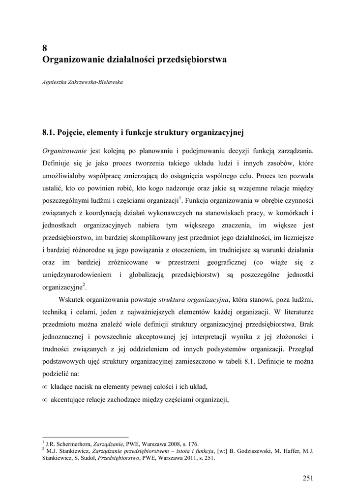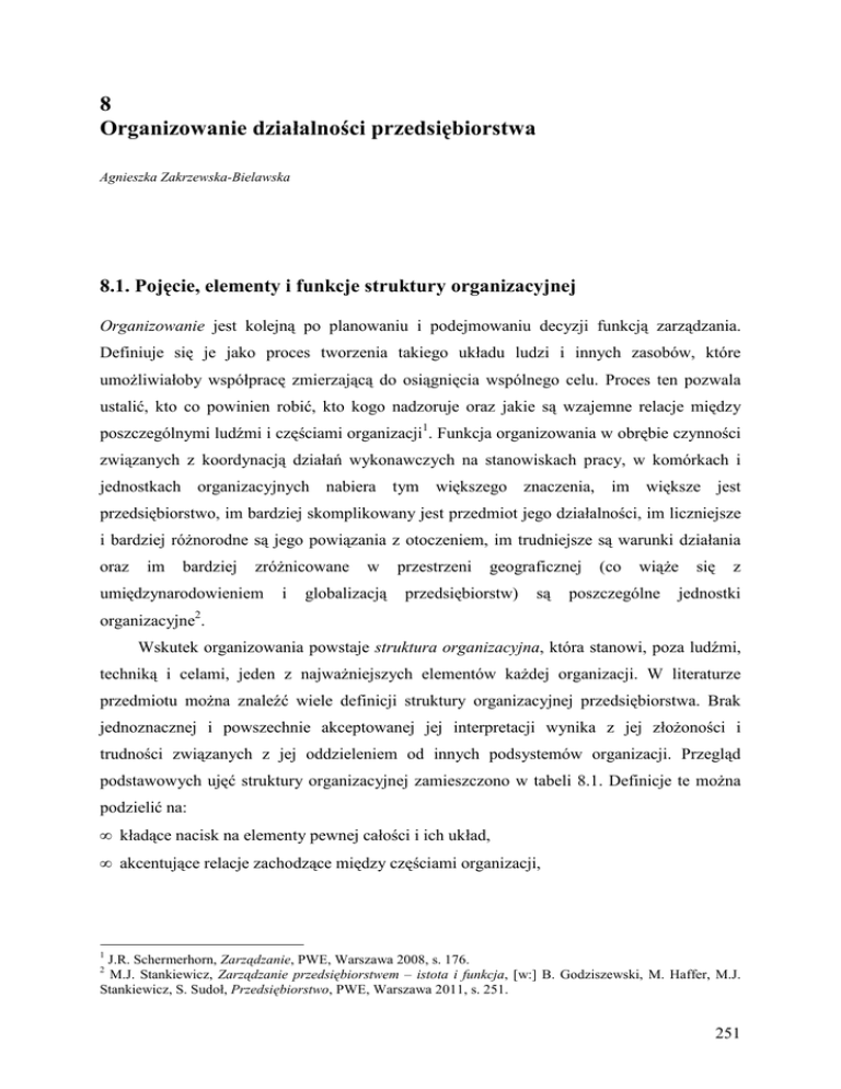 8 Organizowanie działalności przedsiębiorstwa Agnieszka Zakrzewska-Bielawska 8.1. Pojęcie, elementy i funkcje struktury organizacyjnej Organizowanie jest kolejną po planowaniu i podejmowaniu decyzji funkcją zarządzania. Definiuje się je jako proces tworzenia takiego układu ludzi i innych zasobów, które umożliwiałoby współpracę zmierzającą do osiągnięcia wspólnego celu. Proces ten pozwala ustalić, kto co powinien robić, kto kogo nadzoruje oraz jakie są wzajemne relacje między poszczególnymi ludźmi i częściami organizacji1. Funkcja organizowania w obrębie czynności związanych z koordynacją działań wykonawczych na stanowiskach pracy, w komórkach i jednostkach organizacyjnych nabiera tym większego znaczenia, im większe jest przedsiębiorstwo, im bardziej skomplikowany jest przedmiot jego działalności, im liczniejsze i bardziej różnorodne są jego powiązania z otoczeniem, im trudniejsze są warunki działania oraz im bardziej zróżnicowane umiędzynarodowieniem i w globalizacją przestrzeni geograficznej przedsiębiorstw) są (co wiąże poszczególne się z jednostki organizacyjne2. Wskutek organizowania powstaje struktura organizacyjna, która stanowi, poza ludźmi, techniką i celami, jeden z najważniejszych elementów każdej organizacji. W literaturze przedmiotu można znaleźć wiele definicji struktury organizacyjnej przedsiębiorstwa. Brak jednoznacznej i powszechnie akceptowanej jej interpretacji wynika z jej złożoności i trudności związanych z jej oddzieleniem od innych podsystemów organizacji. Przegląd podstawowych ujęć struktury organizacyjnej zamieszczono w tabeli 8.1. Definicje te można podzielić na: • kładące nacisk na elementy pewnej całości i ich układ, • akcentujące relacje zachodzące między częściami organizacji, 1 J.R. Schermerhorn, Zarządzanie, PWE, Warszawa 2008, s. 176. M.J. Stankiewicz, Zarządzanie przedsiębiorstwem – istota i funkcja, [w:] B. Godziszewski, M. Haffer, M.J. Stankiewicz, S. Sudoł, Przedsiębiorstwo, PWE, Warszawa 2011, s. 251. 2 251 • podkreślające zarówno układ elementów przedsiębiorstwa, jak i relacje zachodzące między nimi3. Tabela 8.1. Definicje struktury organizacyjnej w ujęciu wybranych autorów Autor Definicja R.W. Griffin zestaw elementów konstrukcyjnych, które mogą być użyte do ukształtowania organizacji; wynik ich wykorzystania w postaci konkretnego układu elementów organizacji i ich wzajemnych powiązań H. Mintzberg sposób podziału pracy na różne zadania i ich koordynacja J.A. Pearce, R.B. Robinson jr sformalizowane rozmieszczenie relacji między odpowiedzialnością za zadania, ludźmi i zasobami organizacji Strategor całość funkcji i relacji określających w sposób sformalizowany misję, jaką każda komórka organizacyjna powinna wypełniać oraz zasady współpracy między poszczególnymi częściami organizacji M.J. Hatch J. Zieleniewski J. Walas-Trębacz, M. Tyrańska, A. Stabryła stosunki zachodzące pomiędzy częściami zorganizowanej całości ogół stosunków między elementami jakieś całości i między nimi a całością, rozpatrywany pod określonym kątem układ zależności funkcjonalnych i hierarchicznych zachodzących stanowiskami, komórkami i jednostkami organizacyjnymi wyższego stopnia; między ustrój określający sposób funkcjonowania przedsiębiorstwa i warunkujący osiągnięcie założonych celów R. Rutka rozmieszczenie elementów oraz zbiór określonych relacji zachodzących między elementami organizacji bez uwzględnienia jakości tych elementów, czyli tego, czym są te elementy M. Bielski całokształt stosunków między elementami organizacji: ludźmi i składnikami rzeczowymi oraz sposób ich uporządkowania, co pozwala wyróżnić strukturę rzeczy (strukturę elementów organizacji) oraz strukturę procesów (sekwencji zdarzeń) Opracowano na podstawie: R.W. Griffin, Podstawy zarządzania organizacjami, WN PWN, Warszawa 2010, s. 342; H. Mintzberg: Structure in fives: Designing effective organizations, Prentice Hall, Englewood Cliffs 1993, s. 26; J.A. Pearce, R.B. Robinson jr, Strategic management, McGraw-Hill, New York 2007, s. 328; Strategor, Zarządzanie firmą. Strategie, struktury, decyzje, tożsamość, PWE, Warszawa 2001, s. 281; M.J. Hatch, Teoria organizacji, WN PWN, Warszawa 2002, s. 167; J. Zieleniewski, Organizacja i zarządzanie, PWN, Warszawa1976, s. 43; J. Walas-Trebacz, M. Tyrańska, A. Stabryła, Koncepcja sformalizowanej struktury organizacyjnej, [w:] Doskonalenie struktur organizacyjnych przedsiębiorstw w gospodarce opartej na wiedzy, red. A. Stabryła, C.H. Beck, Warszawa 2009, s. 18; R. Rutka, Organizacja, [w:] Zarządzanie organizacjami, red. A. Czermiński, M. Czerska, B. Nogalski, R. Rutka, J. Apanowicz, TNOiK, Toruń 2002, s. 183; M. Bielski, Organizacja. Istota, struktury, procesy, Wydawnictwo Uniwersytetu Łódzkiego, Łódź 1997, s. 168–169. Struktura organizacyjna to układ elementów tworzących pewną całość (organizację) i ich wzajemnych relacji, które służą integracji celów i zadań organizacji wynikających ze strategii i technologii procesów wykonawczych z ludźmi i sposobami oddziaływania na nich podczas pracy. 3 Więcej na ten temat: A. Zakrzewska-Bielawska, Relacje między strategią a strukturą organizacyjną w przedsiębiorstwach sektora wysokich Technologii, „Zeszyty Naukowe Politechniki Łódzkiej” 2011, nr 1095, s. 181–183. 252 Przy takim rozumieniu struktury organizacyjnej należy określić elementy, które wchodzą w jej skład, jak również rozmaite relacje, które między nimi zachodzą. Do podstawowych elementów struktury organizacyjnej zalicza się4: stanowisko pracy, komórki organizacyjne (liniowe, sztabowe i pomocnicze) oraz szczeble zarządzania. Natomiast podstawowe relacje zachodzące między nimi, określane mianem więzi organizacyjnych, to: więź służbowa, więź funkcjonalna, więź techniczna oraz więź informac