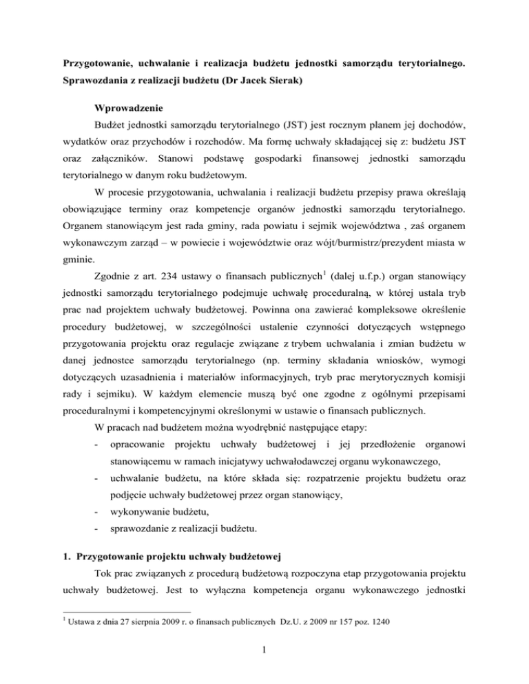 Przygotowanie, uchwalanie i realizacja budżetu jednostki samorządu terytorialnego. Sprawozdania z realizacji budżetu (Dr Jacek Sierak) Wprowadzenie Budżet jednostki samorządu terytorialnego (JST) jest rocznym planem jej dochodów, wydatków oraz przychodów i rozchodów. Ma formę uchwały składającej się z: budżetu JST oraz załączników. Stanowi podstawę gospodarki finansowej jednostki samorządu terytorialnego w danym roku budżetowym. W procesie przygotowania, uchwalania i realizacji budżetu przepisy prawa określają obowiązujące terminy oraz kompetencje organów jednostki samorządu terytorialnego. Organem stanowiącym jest rada gminy, rada powiatu i sejmik województwa , zaś organem wykonawczym zarząd – w powiecie i województwie oraz wójt/burmistrz/prezydent miasta w gminie. Zgodnie z art. 234 ustawy o finansach publicznych 1 (dalej u.f.p.) organ stanowiący jednostki samorządu terytorialnego podejmuje uchwałę proceduralną, w której ustala tryb prac nad projektem uchwały budżetowej. Powinna ona zawierać kompleksowe określenie procedury budżetowej, w szczególności ustalenie czynności dotyczących wstępnego przygotowania projektu oraz regulacje związane z trybem uchwalania i zmian budżetu w danej jednostce samorządu terytorialnego (np. terminy składania wniosków, wymogi dotyczących uzasadnienia i materiałów informacyjnych, tryb prac merytorycznych komisji rady i sejmiku). W każdym elemencie muszą być one zgodne z ogólnymi przepisami proceduralnymi i kompetencyjnymi określonymi w ustawie o finansach publicznych. W pracach nad budżetem można wyodrębnić następujące etapy: - opracowanie projektu uchwały budżetowej i jej przedłożenie organowi stanowiącemu w ramach inicjatywy uchwałodawczej organu wykonawczego, - uchwalanie budżetu, na które składa się: rozpatrzenie projektu budżetu oraz podjęcie uchwały budżetowej przez organ stanowiący, - wykonywanie budżetu, - sprawozdanie z realizacji budżetu. 1. Przygotowanie projektu uchwały budżetowej Tok prac związanych z procedurą budżetową rozpoczyna etap przygotowania projektu uchwały budżetowej. Jest to wyłączna kompetencja organu wykonawczego jednostki 1 Ustawa z dnia 27 sierpnia 2009 r. o finansach publicznych Dz.U. z 2009 nr 157 poz. 1240 1 samorządu terytorialnego2. Projekt uchwały jest przyjmowany w drodze zarządzenia wójta (burmistrza, prezydenta miasta) lub uchwały zarządu (powiatu, województwa). Powinien być opracowany z uwzględnieniem określonych przez ustawodawcę w art. 235 u.f.p elementów obligatoryjnych i fakultatywnych uchwały budżetowej. Równolegle zarząd przedkłada uzasadnienie do projektu uchwały budżetowej oraz inne materiały określone w uchwale proceduralnej. Prognozowane dochody budżetowe powinny być zamieszczone: - w układzie działów klasyfikacji budżetowej, zgodnie z Polską Klasyfikacją Działalności, - w podziale na dochody bieżące i majątkowe (ogółem i w ramach każdego działu), - ze wskazaniem źródeł dochodów bieżących i majątkowych. Z punktu widzenia gospodarowania finansami istotne jest wyszczególnienie dochodów majątkowych, do których zgodnie z art. 235.ust 3 u.f.p. zalicza się: - dotacje i środki przeznaczone na inwestycje, które mogą pochodzić z budżetu państwa, funduszy celowych, od innych jednostek samorządu terytorialnego oraz z funduszy Unii Europejskiej i innych źródeł zagranicznych; - dochody ze sprzedaży majątku, których przedmiotem mogą być nieruchomości, przedmioty materialne oraz trwałe aktywa finansowe, - dochody z tytułu przekształcenia prawa użytkowania wieczystego w prawo własności. Przez dochody bieżące budżetu jednostki samorządu terytorialnego rozumie się dochody budżetowe niebędące dochodami majątkowymi. Wydatki budżetowe odzwierciedlają realizację funkcji, celów i zadań władz publicznych wynikających z przepisów prawa i programów polityki oraz planów finansowych sektora finansów publicznych. W planie wydatków jednostki samorządu terytorialnego w poszczególnych działach i rozdziałach klasyfikacji budżetowej stosuje się podział na wydatki bieżące i majątkowe (art. 236 u.f.p). Dla celów analitycznych odrębnie powinny być wyodrębnione koszty obsługi zadłużenia. Do wydatków majątkowych zalicza się: wydatki na zakup i objęcie akcji oraz wniesienie wkładów do spółek prawa handlowego, a także wydatki inwestycyjne oraz dotacje celowe na finansowanie lub dofinansowanie kosztów realizacji inwestycji. Wydatkami bieżącymi są wszystkie, które nie są wydatkami majątkowymi. W planie wydatków bieżących wyodrębnia się : 2 Zgodnie z art. 233 ustawy o finansach publicznych. Zasada ta jest także sformułowana w ustawach ustrojowych, a mianowicie w art. 52 ust. 1 i art. 60 ust. 2 pkt 4 ustawy o samorządzie gminnym, art. 55 ust. 1 ustawy o samorządzie powiatowym. i art. 66 ust. 1 ustawy o samorządzie województwa 2 1) wydatki jednostek budżetowych, w tym na: wynagrodzenia i składki od nich naliczane, oraz na realizację statutowych zadań; 2) dotacje na zadania bieżące; 3) świadczenia na rzecz osób fizycznych; 4) wydatki na programy finansowane z udziałem środków unijnych3, 5) wypłaty z tytułu poręczeń i gwarancji udzielonych przez JST, przypadające do spłaty w danym roku budżetowym; 6) obsługę długu jednostki samorządu terytorialnego. Organ stanowiący jednostki samorządu terytorialnego może ustalić większą szczegółowość planu dochodów i planu wydatków (zgodnie z uchwałą proceduralną).. Zgodnie z przepisami art. 238 ust. 1 u.f.p organ wykonawczy przedkłada organowi stanowiącemu w terminie do dnia 15 listopada roku poprzedzającego rok budżetowy projekt uchwały budżetowej wraz z uzasadnieniem. W tym samym czasie jest on przekazywany także regionalnej izbie obrachunkowej (RIO) w celu zaopiniowania. Organ nadzoru dokonuje oceny z punktu widzenia zgodności z prawem, wyłą