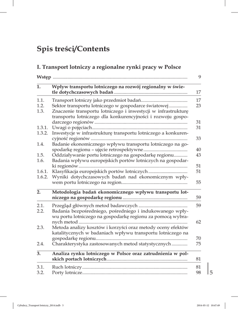 Spis treści/Contents I. Transport lotniczy a regionalne rynki pracy w Polsce Wstęp............................................................................................................... 1. Wpływ transportu lotniczego na rozwój regionalny w świetle dotychczasowych badań............................................................. 1.1. 1.2. 1.3. Transport lotniczy jako przedmiot badań....................................... Sektor transportu lotniczego w gospodarce światowej................ Znaczenie transportu lotniczego i inwestycji w infrastrukturę transportu lotniczego dla konkurencyjności i rozwoju gospodarczego regionów............................................................................. Uwagi o pojęciach............................................................................... Inwestycje w infrastrukturę transportu lotniczego a konkurencyjność regionów................................................................................ Badanie ekonomicznego wpływu transportu lotniczego na gospodarkę regionu – ujęcie retrospektywne..................................... Oddziaływanie portu lotniczego na gospodarkę regionu............ Badania wpływu europejskich portów lotniczych na gospodarki regionów.......................................................................................... Klasyfikacja europejskich portów lotniczych................................. Wyniki dotychczasowych badań nad ekonomicznym wpływem portu lotniczego na region...................................................... 1.3.1. 1.3.2. 1.4. 1.5. 1.6. 1.6.1. 1.6.2. 2. Metodologia badań ekonomicznego wpływu transportu lotniczego na gospodarkę regionu...................................................... 2.1. 2.2. Przegląd głównych metod badawczych......................................... Badania bezpośredniego, pośredniego i indukowanego wpływu portu lotniczego na gospodarkę regionu za pomocą wybranych metod.......................................................................................... Metoda analizy kosztów i korzyści oraz metody oceny efektów katalitycznych w badaniach wpływu transportu lotniczego na gospodarkę regionu........................................................................... Charakterystyka zastosowanych metod statystycznych.............. 2.3. 2.4. 9 17 17 23 31 31 33 40 43 51 51 55 59 59 62 70 75 3. Analiza rynku lotniczego w Polsce oraz zatrudnienia w polskich portach lotniczych................................................................... 81 3.1. 3.2. Ruch lotniczy....................................................................................... Porty lotnicze....................................................................................... 81 98 Cybulscy_Transport lotniczy_2014.indb 5 5 2014-05-12 10:47:49 Spis treści/Contents 3.3. 3.4. 3.5. Organizacja badań w portach lotniczych i charakterystyka respondentów......................................................................................... 106 Bezpośrednie efekty zatrudnieniowe wśród respondentów....... 111 Efekty ekonomiczne i tendencje zmian........................................... 119 4. Wpływ bezpośredni, pośredni i indukowany wybranych polskich regionalnych portów lotniczych na rynki pracy............... 123 4.1. 4.2. Charakterystyka analizowanych portów lotniczych..................... Analiza bezpośredniego wpływu wybranych regionalnych portów na regionalne rynki pracy................................................... Port Lotniczy Kraków-Balice............................................................ Port Lotniczy Katowice-Pyrzowice.................................................. Port Lotniczy Wrocław-Strachowice............................................... Porty lotnicze Bydgoszcz-Szwederowo oraz Szczecin-Goleniów...................................................................................................... Porty lotnicze jako pracodawcy na tle największych przedsiębiorstw z sektora przemysłu, handlu i usług w regionach.......... Wpływ pośredni i indukowany....................................................... Metoda S. Huderek-Glapskiej........................................................... Metoda keynesowska......................................................................... 4.2.1. 4.2.2. 4.2.3. 4.2.4. 4.2.5. 4.3. 4.3.1. 4.3.2. 123 127 129 133 136 139 142 145 145 150 5. Znaczenie transportu lotniczego dla funkcjonowania przedsiębiorstw z województwa dolnośląskiego.................................. 153 5.1. 5.2. 5.3. 5.4. 5.5. Cele i metoda badania........................................................................ Charakterystyka respondentów....................................................... Wyniki badań...................................................................................... Główne wnioski.................................................................................. Wpływ Portu Lotniczego Wrocław-Strachowice na gospodarkę turystyczną regionu .......................................................................... 6. Taksonomiczna ocena sytuacji społeczno-gospodarczej na obszarze oddziaływania portów lotniczych na rynek pracy – wyniki badań...................................................................................... 193 153 154 158 187 188 Zakończenie.................................................................................................... 213 Załączniki ........................................................................................................ 219 Spis rysunków................................................................................................. 235 Spis tabel........................................................................................................... 237 6 Cybulscy_Transport lotniczy_2014.indb 6 2014-05-12 10:47:49 Spis treści/Contents II. The Impact of Air Transport on Regional