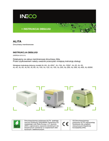ALITA Dmuchawy membranowe INSTRUKCJA OBSŁUGI (WERSJA 2012.01) Dziękujemy za zakup membranowej dmuchawy Alita. Przed użytkowaniem należy uważnie przeczytać niniejszą instrukcję obsługi. Niniejsza instrukcja dotyczy modeli AL-6A, AL-6SA*, AL-15A, AL-15SA*, AL-20, AL-30, AL-40, AL-50, AL-60, AL-80, AL-100, AL-120, AL-150, AL-200, AL-250, AL-300, AL-400, AL-500W. Dmuchawy/pompy próżniowe ALITA spełniają warunki Dyrektywy 2002/95WE Parlamentu Europejskiego oraz Rady Europy z 27 stycznia 2003 o ograniczeniu używania określonych niebezpiecznych substancji w urządzeniach elektrycznych i elektronicznych. CE Dmuchawy/pompy próżniowe ALITA odpowiadają Dyrektywie dla urządzeń maszynowych Wspólnoty Europejskiej (WE). IN-ECO, spol. s r.o.; Alita - Návod na obsluhu SPIS TREŚCI Definicje .............................................................................................................. 3 1.1 Informacje ogólne .......................................................................................... 3 2 Bezpieczeństwo .................................................................................................. 3 3 Zastosowanie ..................................................................................................... 4 3.1 Informacje ogólne .......................................................................................... 4 3.2 Warunki używania ......................................................................................... 4 4 Instalacja ............................................................................................................ 6 4.1 Instalacja ....................................................................................................... 6 5 Eksploatacja ....................................................................................................... 6 5.1 Rozpoczęcie eksploatacji .............................................................................. 6 5.2 Eksploatacja .................................................................................................. 6 6 Kontrola i konserwacja ....................................................................................... 6 6.1 Kontrola ......................................................................................................... 6 6.2 Konserwacja .................................................................................................. 7 6.3 Przechowywanie............................................................................................ 7 7 Serwis ................................................................................................................. 7 7.1 Schemat montażowy dmuchawy ................................................................... 8 8 Części zapasowe i akcesoria............................................................................ 10 8.1 Filtr powietrza .............................................................................................. 10 8.2 Ciśnieniomierz ............................................................................................. 10 9 Likwidacja odpadów ......................................................................................... 10 10 Gwarancja ........................................................................................................ 11 1 [email protected] 2 www.in-eco.eu/pl/ IN-ECO, spol. s r.o.; Alita - Návod na obsluhu 1 DEFINICJE 1.1 INFORMACJE OGÓLNE Instrukcja Niniejsza instrukcja obsługi jest własnością intelektualną firmy IN-ECO, spółka z o.o. Więcej informacji o spółce i jej produktach można uzyskać na stronach www.in-eco.eu/pl/. Dmuchawa Pod pojęciem dmuchawy w niniejszej instrukcji rozumie się dmuchawę membranową, nazywaną również czasami powietrzną pompą liniową, Alita. Niektóre modele mogą być używane jako dmuchawa lub jako pompa próżniowa. Gaz (powietrze) Pod pojęciem gazu w niniejszej instrukcji rozumie się powietrze, czysty gaz, mieszankę powietrza i gazu lub mieszankę gazów. W tym samym znaczeniu w niniejszej instrukcji jest używane pojęcie powietrza. Autoryzowany serwis IN-ECO Pod pojęciem autoryzowanego serwisu IN-ECO w niniejszej instrukcji rozumie się centrum serwisowe spółki IN-ECO, spółka z o.o. W celu uzyskania bardziej szczegółowych informacji (informacje kontaktowe) zobacz www.in-eco.eu/pl/. 2 BEZPIECZEŃSTWO Dmuchawę mogą obsługiwać wyłącznie osoby pouczone według niniejszej instrukcji i odpowiednich przepisów bezpieczeństwa. Niefachowe obchodzenie się z dmuchawą jak również z urządzeniem elektrycznym może powodować zarówno ciężkie jak i śmiertelne urazy! Przed rozpoczęciem jakiejkolwiek manipulacji z dmuchawą należy dokładnie przeczytać niniejszą instrukcję. Instrukcję należy zrozumieć jednoznacznie. Przestrzegać wszystkich poleceń zawartych w instrukcji i umieścić ją na widocznym miejscu w pobliżu używania dmuchawy. Podczas instalacji oraz eksploatacji przestrzegać odpowiednich przepisów bezpieczeństwa. Dmuchawę podłączyć do sieci elektrycznej o napięciu 220 – 240 V / 50 Hz (60 Hz). Niebezpieczeństwo porażenia prądem elektrycznym! Przed jakąkolwiek konserwacją lub naprawą należy odłączyć dmuchawę od sieci elektrycznej, aby uniknąć porażenia prądem elektrycznym! Kabel sieciowy Kabel sieciowy nie może nigdy biec w pobliżu ani nie może stykać się z gorącymi częściami urządzenia lub z innymi źródłami ciepła. Nie wolno dopuścić, aby kabel sieciowy leżał na ostrych krawędziach lub rogach. Nigdy nie łamać ani nie giąć kabla sieciowego. Przedłużacze Używać tylko trójżyłowych przedłużaczy, posiadających wtyczkę z trzema kołkami z kołkiem uziemiającym i gniazdo z trzema otworami umożliwiające wetknięcie wtyczki dmuchawy. Upewnić się, czy przedłużacz nie jest uszkodzony. Jeśli jest używany przedłużacz, wtedy musi być dostosowany do prądu ele