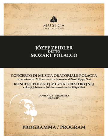 CONCERTO DI MUSICA ORATORIALE POLACCA in occasione del V Centenario della nascita di San Filippo Neri KONCERT POLSKIEJ MUZYKI ORATORYJNEJ z okazji Jubileuszu 500-lecia urodzin św. Filipa Neri DOMENICA / NIEDZIELA 25.X.2015 PROGRAMMA / PROGRAM Nel quadro del cinquecentesimo anniversario della nascita di San Filippo Neri, saremo testimoni di un evento musicale straordinario che si svolgerà nella Chiesa di Santa Maria in Vallicella (Chiesa Nuova) a Roma. La cappella musicale che opera presso la Congregazione dei Padri Filippini del Sacro Monte a Gostyń presenterà le composizioni che fanno parte di un patrimonio musicale risalente alla fine del XVIII e l’inizio del XIX secolo, conservato nella biblioteca del santuario. I musicisti e i solisti – Marzena Michałowska – soprano, Sławomir Bronk – controtenore, Tomasz Krzysica – tenore – interpreteranno, tra l’altro, le opere di Józef Zeidler, detto il “Mozart polacco”. Il compositore, legato a Gostyń per la maggior parte della sua vita, è considerato uno dei migliori rappresentanti del classicismo in Polonia. Nell’interpretazione degli artisti polacchi ascolteremo i frammenti del suo Stabat Mater, La preghiera per la pioggia, Veni Creator e Pastorella. A completare il programma del concerto ci sarà la Sinfonia ex F di Antoni Habel. Questo compositore di talento e violinista è stato primo violino nella cappella di Gniezno. La sua musica, come quella di Zeidler nel santuario di Gostyń, accompagnava la liturgia e solennizzava le celebrazioni religiose a cavallo del XVIII e XIX secolo. Nel concerto dedicato a San Filippo Neri non possono mancare le forme musicali originarie dell’Oratorio romano cinquecentesco. I musicisti della Capella Sacromontana e i solisti accompagnati dall’apprezzato violinista italiano Valerio Losito, attivo presso la Chiesa di Santa Maria in Vallicella, eseguiranno le Laudi – canti di lode, provenienti dalla Biblioteca della Congregazione dei Padri Filippini presso la Chiesa Nuova. Ne ascolteremo due – Amor senza misura e Vanità di vanità – composte da Filippo Neri. Il programma presentato domenica 25 ottobre, nel corso del concerto nella Chiesa di Santa Maria in Vallicella a Roma, è soltanto una esigua parte del ricco patrimonio di opere dei compositori polacchi che orbitavano attorno alla Congregazione dei Padri Filippini di Sacro Monte a Gostyń. Dal 2006 l’Associazione Amanti della Musica Sacromontana „Józef Zeidler” si propone di riportare alla luce questa musica polacca dimenticata. Grazie al festival Musica Sacromontana e ai cd con la musica di compositori come Józef Zeidler e Antoni Habel scopriamo quanto importanti per la cultura polacca siano stati il Santuario e le tradizioni musicali dei Filippini del Sacro Monte a Gostyń. Vi aspettiamo, Wojciech Czemplik Maggiori informazioni su www.jozefzeidler.eu Direttore artistico del Festival MUSICA SACROMONTANA W ramach obchodów pięćsetnej rocznicy urodzin św. Filipa Neri, w Kościele Santa Maria in Vallicella (ChiesaNuova) w Rzymie będziemy świadkami niezwykłego wydarzenia muzycznego. Kapela Muzyczna działająca przy Kongregacji Księży Filipinów na Świętej Górze w Gostyniu zaprezentuje fragmenty zachowanego w klasztornej bibliotece dziedzictwa muzycznego z przełomu XVIII i XIX wieku. Muzycy oraz soliści – Marzena Michałowska – sopran, Sławomir Bronk – kontratenor, Tomasz Krzysica – tenor – wykonają miedzy innymi utwory Józefa Zeidlera nazywanego polskim Mozartem. Ten kompozytor, związany przez większą część życia z Gostyniem, uznawany jest za jednego z najwybitniejszych przedstawicieli polskiego klasycyzmu. W interpretacji artystów z Polski usłyszymy fragmenty Stabat Mater, Modlitwy o deszcz, Veni Creator oraz Pastorellę autorstwa kompozytora. Dopełnieniem koncertu będzie wykonanie Symfonii ex F – Antoniego Habla. Ten uzdolniony kompozytor i skrzypek pełnił funkcję koncertmistrza Kapeli Gnieźnieńskiej i jego muzyka, podobnie jak muzyka Zeidlera na Świętej Górze, służyła oprawie liturgii oraz uświetnianiu uroczystości kościelnych na przełomie XVIII i XIX wieku. W koncercie dedykowanym św. Filipowi Neri nie może zabraknąć form muzycznych, których początek bierze się z XVI-wiecznego rzymskiego Oratorium. Muzycy Kapeli Świętogórskiej i soliści wspomagani przez wybitnego włoskiego skrzypka Valerio Losito, działającego przy kościele Santa Maria in Vallicella, wykonają Laudy – pieśni pochwalne, pochodzące z biblioteki przy Kongregacji Księży Filipinów Chiesa Nuova w Rzymie. Usłyszymy dwie z nich – Amor senzamisura oraz Vanità di vanità – autorstwa samego Filipa Neri. Zaprezentowany podczas koncertu w niedzielę, 25 października o godz. 21.00 w Kościele Santa Maria in Vallicelli w Rzymie program to zaledwie mały wycinek bogatego dorobku kompozytorów polskich skupionych wokół Kongregacji Księży Filipinów na Świętej Górze. Odkrywaniem tej zapomnianej polskiej muzyki zajmuje się od 2006 roku Stowarzyszenie Miłośników Muzyki Świętogórskiej im. Józefa Zeidlera. Za sprawą Festiwalu Musica Sacromontana oraz wydawanych płyt kompaktowych z muzyką takich kompozytorów jak Józef Zeidler czy Antoni Habel dowiadujemy się, jak ważne były Sanktuarium oraz muzyczne tradycje filipińskie na Świętej Górze koło Gostynia. Serdecznie zapraszam Wojciech Czemplik Więcej o nas na www.jozefzeidler.eu dyrektor artystyczny Festiwalu MUSICA SACROMONTANA CAPELLA SACROMONTANA KAPELA ŚWIĘTOGÓRSKA DOMENICA NIEDZIELA 25.X.2015 Violino I / Skrzypce I – Andrzej Ładomirski, Łukasz Nazarczuk, Kinga Dąbrowska Violino II / Skrzypce II – Joanna Tulińska-Ładomirska, Valerio Losito, Wojciech Czemplik Viola / Altówka – Barbara Mądry Violoncello / Wiolonczela – Żaneta Magryta, Anna Kulak Contrabbasso / Kontrabas – Piotr Politowski Flauti / Flety – Monika Kobayashi, Wioletta Buraczewska Organo / Organy – Andrzej Henryk Bączyk SO