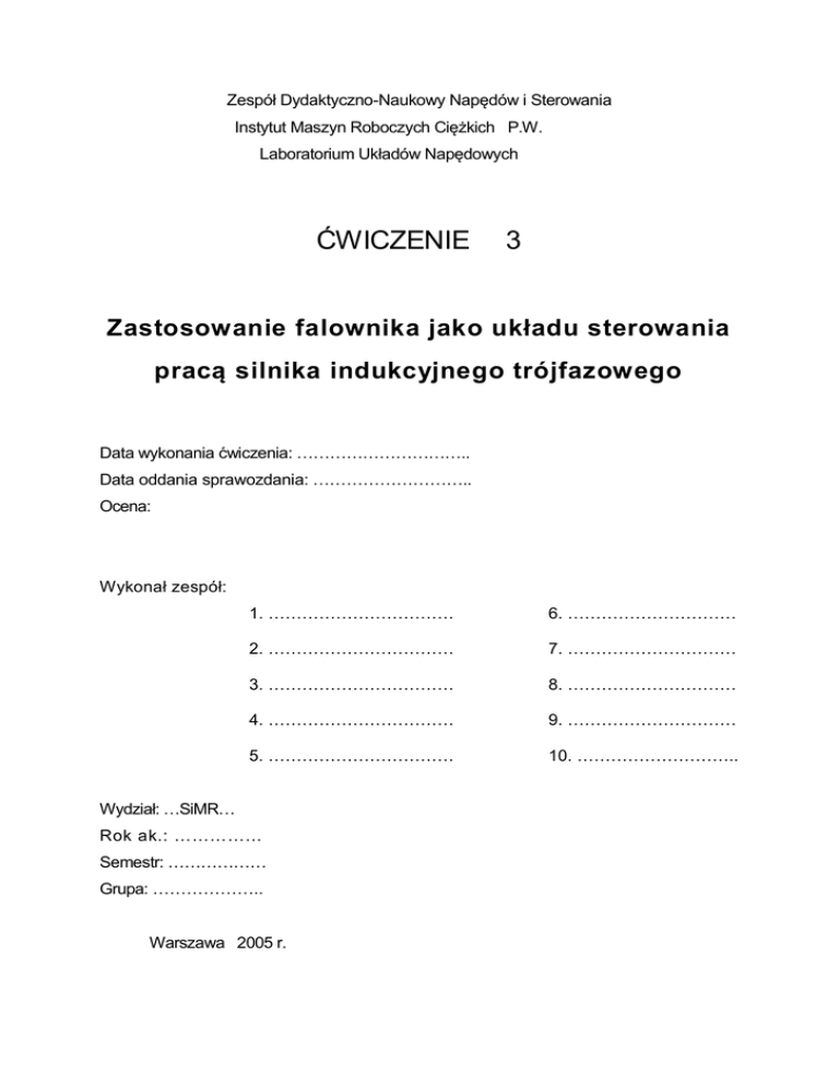 Zespół Dydaktyczno-Naukowy Napędów i Sterowania Instytut Maszyn Roboczych Ciężkich P.W. Laboratorium Układów Napędowych ĆWICZENIE 3 Zastosowanie falownika jako układu sterowania pracą silnika indukcyjnego trójfazowego Data wykonania ćwiczenia: ………………………….. Data oddania sprawozdania: ……………………….. Ocena: Wykonał zespół: 1. …………………………… 6. ………………………… 2. …………………………… 7. ………………………… 3. …………………………… 8. ………………………… 4. …………………………… 9. ………………………… 5. …………………………… 10. ……………………….. Wydział: …SiMR… Rok ak.: …………… Semestr: ……………… Grupa: ……………….. Warszawa 2005 r. 1. Cel i zakres ćwiczenia Celem ćwiczenia jest przypomnienie podstawowych zasad klasycznego sterowania silnikami indukcyjnymi asynchronicznymi i synchronicznymi z magnesami trwałymi oraz zapoznanie się z zasadami pracy sterowników i falowników w zastosowaniu do sterowania pracą wspomnianych silników indukcyjnych na przykładzie sterowania pracą silnika indukcyjnego asynchronicznego budowy klatkowej. 2. Silnik asynchroniczny – przypomnienie podstawowych informacji. 2.1 Budowa silnika asynchronicznego. Budowę silnika asynchronicznego przedstawiono na rysunku 1.: Rys. 1. Schemat budowy silnika indukcyjnego Część nieruchoma (stojan) ma kształt wydrążonego wewnątrz walca. W wewnętrznej przestrzeni stojana znajduje się część wirująca maszyny zwana wirnikiem, również w kształcie walca. Obwód magnetyczny stojana i wirnika jest wykonany w postaci rdzenia. Na wewnętrznej stronie rdzenia stojana i zewnętrznej stronie rdzenia wirnika wykonane są na całej długości specjalne rowki zwane żłobkami, w których umieszczone są uzwojenia. Najczęściej stosowane są silniki indukcyjne trójfazowe. tzn. takie, które posiadają trójfazowe uzwojenie stojana. 2.2 Metody sterowania silników indukcyjnych asynchronicznych trójfazowych Podstawą do projektowania każdego układu sterowania silnika jest osiąganie zadanych stanów ustalonych. Dotyczy to możliwości zmian: prędkości obrotowej, momentu rozwijanego przez silnik podczas rozruchu i w stanach ustalonych oraz prądu podczas rozruchu. Przedstawione wielkości opisują zależności zdefiniowane jako: - prędkość obrotowa wirnika : nw ns (1 s), (1) [1] prędkość obrotowa synchroniczna (prędkość wirowania pola magnetycznego): - ns 60 f , p (1.1) gdzie: f - częstotliwość napięcia zasilającego, s - poślizg: p - liczba par biegunów; ns nw 100% ns M - moment obrotowy: R2' s 28.6 2 U1 , ns ' 2 2 R R1 2 X 1 X 2' s 28.6 2 U1 ns Mr - moment rozruchowy: Mk - moment krytyczny: poślizgu krytycznym: (1.2) sk R 1 R2' X ' 2 2 R 1 X ' 2 2 (2) , 14.3 U12 , n s X 1 X 2' występujący przy (2.2) R2' , X 1 X 2' (2.3) gdzie: R2’ - rezystancja wirnika odniesiona do obwodu stojana, R1 - rezystancja stojana, X1 - reaktancja stojana, X2’ - reaktancja wirnika odniesiona do obwodu stojana, U1 napięcie zasilania silnika; Ir - prąd rozruchowy: R U1 X ' 2 2 1 R ' 1 X2 2 , I r (4 8) I n (3) gdzie : In - prąd znamionowy silnika. Powyższe równania wskazują, że: metody sterowania prędkością obrotową i momentem obrotowym można podzielić na sterowanie przez zmianę częstotliwości napięcia zasilającego stojan lub przez zmianę poślizgu. metody sterowania (zmniejszenia) prądu rozruchowego można podzielić na sterowanie wynikające ze zmniejszenia napięcia zasilającego stojan lub zwiększenie rezystancji wirnika. Wybór metody sterowania pracą silnika indukcyjnego asynchronicznego zależy od jego mocy znamionowej i budowy wirnika. 2.2.1. Silniki pierścieniowe W silnikach pierścieniowych istnieje możliwość obniżenia prądu rozruchowego i powiększenia momentu rozruchowego wynikająca z włączenia w obwód wirnika rezystorów rozruchowych Rr. Jak wynika z wzoru (3) ze wzrostem rezystancji R2’ maleje prąd rozruchowy. Zmiana tej rezystancji powoduje również zmianę wartości poślizgu krytycznego (2.3), co doprowadza do wzrostu momentu rozruchowego, nawet do wartości Mr = Mk. Z tego powodu silniki pierścieniowe stosuje się w napędach o ciężkich warunkach rozruchowych. W celu utrzymania podczas rozruchu rozwijanego przez silnik momentu obrotowego na odpowiednim poziomie, rezystancja Rr regulowana jest stopniowo. W procesie rozruchu poszczególne stopnie, a po jego zakończeniu cały rezystor wyłącza się i uzwojenie wirnika zwiera się. W równaniu opisującym moment krytyczny (maksymalny) (2.2) nie występuje rezystancja wirnika, czyli moment ten nie zależy od tej rezystancji. Natomiast poślizg, przy którym występuje ten moment jest zależny od rezystancji wirnika. Gdy rezystancję wirnika zwiększy się o Rd nastąpi zmiana położenia momentu krytycznego. Powoduje to zmianę nachylenia roboczej części charakterystyki M=f(n) silnika i zmianę prędkości obrotowej ustalonego punktu pracy. Prąd rozruchowy można zmniejszać również zaniżając na czas rozruchu napięcie zasilające stojan [3]. Powoduje to jednak znaczne obniżenie momentu rozruchowego, krytycznego i obrotowego (M = c U12). 2.2.2. Silniki klatkowe Reguły sterowania silnikiem indukcyjnym asynchronicznym klatkowym są analogiczne jak dla silnika pierścieniowego. Konstrukcja wirnika silnika indukcyjnego asynchronicznego klatkowego wyklucza jednak możliwość włączania w jego obwód rezystorów dodatkowych. Sterowanie silnikiem zachodzi więc w obwodzie stojana. W przypadku silnika klatkowego małej mocy rozruch dokonuje się przez bezpośrednie włączenie uzwojenia stojana na znamionowe napięcie sieci zasilającej. W silnikach większej mocy, gdy prąd rozruchowy może wywołać niebezpieczne przeciążenie źródła i sieci zasilającej, stosuje się specjalne układy zapewniające obn