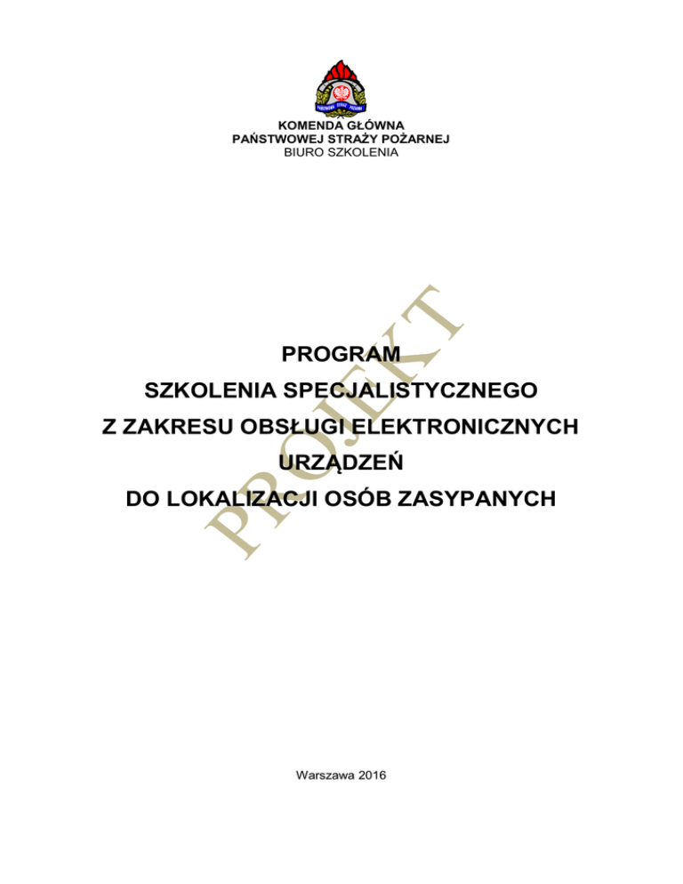 KOMENDA GŁÓWNA PAŃSTWOWEJ STRAŻY POŻARNEJ BIURO SZKOLENIA PROGRAM SZKOLENIA SPECJALISTYCZNEGO Z ZAKRESU OBSŁUGI ELEKTRONICZNYCH URZĄDZEŃ DO LOKALIZACJI OSÓB ZASYPANYCH Warszawa 2016 Opracowanie merytoryczne: bryg. Robert Kłębczyk bryg. Piotr Gancarczyk mł. kpt. Adam Piętka asp. sztab. Krzysztof Gruca Konsultacja merytoryczna: st. bryg. Sławomir Wojta – SA PSP w Krakowie Konsultacje metodyczne: mgr Magdalena Stajszczak – KGPSP Warszawa Niniejszy program zastępuje „Program kursu specjalistycznego z zakresu obsługi elektronicznych urządzeń do lokalizacji osób zasypanych dla strażaków Państwowej Straży Pożarnej” zatwierdzony 14 kwietnia 2005 r. 2 Spis treści: strona I. Założenia dydaktyczno-wychowawcze ............................................................................ 4 1. Cel szkolenia ............................................................................................................ 4 2. Sylwetka absolwenta ................................................................................................ 4 3. Warunki przyjęcia na szkolenie................................................................................. 4 II. Realizacja procesu dydaktycznego ................................................................................. 5 1. Organizacja szkolenia .............................................................................................. 5 2. Zalecenia i wskazówki metodyczne .......................................................................... 5 3. Plan nauczania ......................................................................................................... 7 III. Treści kształcenia ........................................................................................................... 7 1. Urządzenia nasłuchowe do lokalizacji....................................................................... 8 2. Urządzenia wizyjne do lokalizacji.............................................................................. 9 3. Zasady poszukiwania osób uwięzionych .................................................................10 IV. Literatura .......................................................................................................................11 Zalączniki 3 Warszawa, dnia marca 2016 r. ZATWIERDZAM .......................................... I. ZAŁOŻENIA DYDAKTYCZNO-WYCHOWAWCZE 1. Cel szkolenia Celem szkolenia jest przygotowanie słuchacza do skutecznego i bezpiecznego prowadzenia działań ratowniczych podczas awarii i katastrof z wykorzystaniem elektronicznych urządzeń służących do lokalizacji osób zasypanych na skutek zawałów. 2. Sylwetka absolwenta Po ukończeniu szkolenia słuchacz powinien: a) w sferze poznawczej: − omawiać charakterystyki materiałów budowlanych, − tłumaczyć wybrane zagadnienia z zakresu akustyki, − tłumaczyć wybrane zagadnienia z zakresu optyki, − omawiać zasady eksploatacji urządzeń do lokalizacji osób, b) w sferze praktycznej: − rozpoznawać i dokonywać oceny sytuacji w miejscu prowadzenia działań ratowniczych, − dobierać metody poszukiwania osób, − przeprowadzać pomiary przy użyciu urządzeń do lokalizacji osób zasypanych, − wykorzystywać własności urządzeń technicznych do lokalizacji osób w różnych sytuacjach i warunkach, − postępować zgodnie z zasadami eksploatacji urządzeń do lokalizacji osób, − prowadzić poszukiwania osób, c) w sferze motywacyjnej, mieć ukształtowane postawy: − odpowiedzialności za życie ludzi, − odpowiedzialności za bezpieczeństwo swoje i kolegów, − odpowiedzialności za stan techniczny sprzętu i urządzeń, − odpowiedzialności za bezpieczeństwo konstrukcji budowlanych. 3. Warunki przyjęcia na szkolenie Warunkiem przyjęcia na szkolenie jest skierowanie, którego wzór określa załącznik nr 1, potwierdzające określone w skierowaniu wymagania oraz zaliczenie testu wstępnego z tematyki objętej szkoleniem z zakresu organizacji działań poszukiwawczo – ratowniczych. Niezaliczenie testu powoduje niedopuszczenie do szkolenia. Test wstępny składa się z co najmniej 20 zadań zamkniętych wielokrotnego wyboru z jedną prawidłową odpowiedzią. Test uznaje się za zaliczony, jeżeli kandydat na szkolenie uzyskał co najmniej 75 % prawidłowych odpowiedzi. 4 II. REALIZACJA PROCESU DYDAKTYCZNEGO 1. Organizacja szkolenia a) Szkolenie organizowane jest przez szkoły Państwowej Straży Pożarnej oraz ośrodki szkolenia w komendach wojewódzkich Państwowej Straży Pożarnej. b) Szkolenie może być połączone ze szkoleniem z zakresu organizacji działań poszukiwawczo-ratowniczych. c) Połączone szkolenia można realizować po spełnieniu wymagań określonych dla każdego ze szkoleń. d) Podstawą organizacji procesu dydaktycznego jest plan nauczania. Podstawową formą nauczania jest lekcja, której odpowiada jedna godzina dydaktyczna trwająca 45 minut. e) Na realizację programu szkolenia przewidziano 28 godzin dydaktycznych. − zajęcia dydaktyczne – 27 godzin dydaktycznych, − test końcowy – 1 godzina dydaktyczna. f) W trakcie szkolenia dokonuje się oceny osiągnięć słuchaczy, zgodnie z kartą umiejętności zawartą w załączniku nr 2. g) Oceny dokonują instruktorzy prowadzący zajęcia praktyczne. h) Na zakończenie szkolenia przeprowadzany jest test złożony z 20 zadań zamkniętych, wielokrotnego wyboru z jedną prawidłową odpowiedzią. Zadania oceniane są w skali 0 – 1. i) Punkty uzyskane z testu wpisywane są do karty umiejętności. j) Warunkiem ukończenia szkolenia jest obecność na 100% zajęć przewidzianych programem szkolenia oraz uzyskanie minimum 75% punktów możliwych do uzyskania w karcie umiejętności. k) W razie nie przystąpienia do testu z uzasadnionej przyczyny, słuchacz może do niego przystąpić w dodatkowym terminie wyznaczonym przez organizatora szkolenia. l) Słuchacze, którzy nie spełnili warun