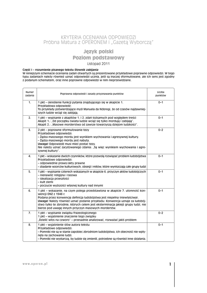 KRYTERIA OCENIANIA ODPOWIEDZI Próbna Matura z OPERONEM i „Gazetą Wyborczą” Język polski Poziom podstawowy Listopad 2011 Część I – rozumienie pisanego tekstu Słownik zabijania W niniejszym schemacie oceniania zadań otwartych są prezentowane przykładowe poprawne odpowiedzi. W tego typu zadaniach należy również uznać odpowiedzi ucznia, jeśli są inaczej sformułowane, ale ich sens jest zgodny z podanym schematem, oraz inne poprawne odpowiedzi w nim nieprzewidziane. Numer zadania Poprawna odpowiedź i zasady przyznawania punktów Liczba punktów 1. 1 pkt – określenie funkcji pytania znajdującego się w akapicie 1. Przykładowa odpowiedź: To przykłady potwierdzające myśl Manuela da Nóbregi, że od czasów najdawniejszych ludzie wciąż się zabijają. 0–1 2. 1 pkt – wypisanie z akapitów 1. i 2. zdań tożsamych pod względem treści Akapit 1.: „Od początku świata ludzie wciąż się tylko mordują i zabijają”. Akapit 2.: „Masowe morderstwa od zawsze towarzyszą dziejom ludzkości”. 0–1 3. 2 pkt – poprawne sformułowanie tezy Przykładowe odpowiedzi: – Żądza masowego mordu jest wynikiem wychowania i agresywnej kultury. – Żądza masowego mordu jest nabyta. Uwaga! Odpowiedź musi mieć postać tezy. Nie należy uznać zacytowanego zdania: „Są więc wynikiem wychowania i agresywnej kultury”. 0–2 4. 1 pkt – wskazanie dwóch czynników, które pozwolą rozwiązać problem ludobójstwa Przykładowe odpowiedzi: – odpowiednie prawo/akty prawne – zbadanie wzorców kulturowych, obsesji i mitów, które wyniszczają całe grupy ludzi 0–1 5. 1 pkt – wypisanie czterech wskazanych w akapicie 6. przyczyn aktów ludobójczych – nienawiść religijna i rasowa – idealizacja przeszłości – kult ziemi – poczucie wyższości własnej kultury nad innymi 0–1 6. 1 pkt – wskazanie, na czym polega przedstawiona w akapicie 7. ułomność konwencji ONZ z 1948 r. Podana przez konwencję definicja ludobójstwa jest niepełna (niewłaściwa). Uwaga! Należy również uznać podanie przykładu: Konwencja uznaje za ludobójstwo tylko te zbrodnie, których celem jest eksterminacja jakiejś grupy ludzi, nie bierze pod uwagę innych przyczyn masowych morderstw. 0–1 7. 1 pkt – wypisanie związku frazeologicznego 1 pkt – wyjaśnienie znaczenie tego związku „Dzielić włos na czworo” – przesadnie analizować, rozważać jakiś problem 0–2 8. 1 pkt – wyjaśnienie słów autora tekstu Przykładowe odpowiedzi: – Pomniki nie są w stanie zapobiec zbrodniom ludobójstwa, ich obecność nie wpłynęła na zachowanie ludzi. – Pomniki nie wystarczą, by ludzie się zmienili, potrzebne są również inne działania. 0–1 w w w. o p e r o n . p l 1 Język polski. Poziom podstawowy Próbna Matura z OPERONEM i „Gazetą Wyborczą” Numer zadania 9. Liczba punktów Poprawna odpowiedź i zasady przyznawania punktów 2 pkt – określenie dwóch funkcji cudzysłowów użytych w akapicie 11. 1 pkt – określenie jednej funkcji cudzysłowu użytego w akapicie 11. – wyróżnienie tytułów książek – podkreślenie metaforycznego (ironicznego) znaczenia wyrażenia 0–2 10. 2 pkt – podanie czterech poprawnych odpowiedzi 1 pkt – podanie trzech lub dwóch poprawnych odpowiedzi Odpowiedź: I, I, O, O 0–2 11. 1 pkt – poprawne wskazanie numeru akapitu akapit 3. 0–1 12. 1 pkt – określenie celu przywołania w tekście wielu faktów historycznych Przykładowe odpowiedzi: – Fakty są potwierdzeniem argumentacji. – Ułatwiają zrozumienie omawianych problemów. – Wskazują na wagę omawianego zagadnienia. 0–1 13. 1 pkt – określenie formy gramatycznej czasownika rozpoczynającego akapit 13. „wydaje się” – nieosobowa forma czasownika 1 pkt – wyjaśnienie, jaką funkcję pełni ten czasownik Autor tekstu, używając tej formy, sugeruje, że to nie tylko jego zdanie, ale opinia większej grupy ludzi. 0–2 14. 1 pkt – określenie funkcji ostatniego akapitu Przykładowe odpowiedzi: – Ostatni akapit to puenta. – Ostatni akapit stanowi podsumowanie. 0–1 15. 1 pkt – wymienienie czterech podanych w tekście przykładów zbrodni ludobójstwa Przykładowe odpowiedzi: – zbrodnie nazistów, zwolenników leninizmu i maoizmu – wypędzenie z Sudanu ciemnoskórych mieszkańców Darfuru, wymordowanie 500 tys. osób – II wojna światowa – Katyń, Holocaust – zbrodnie Pol Pota w Kambodży – rzeź Tutsi w Ruandzie – masakra w Kenii 0–1 Razem 20 w w w. o p e r o n . p l 2 Język polski. Poziom podstawowy Próbna Matura z OPERONEM i „Gazetą Wyborczą” Część II – pisanie własnego tekstu w związku z tekstem literackim zamieszczonym w arkuszu Temat 1. Postaci z innych światów. Dokonaj analizy i interpretacji podanych fragmentów Makbeta Williama Szekspira oraz Nie-Boskiej komedii Zygmunta Krasińskiego i przedstaw, jaką funkcję pełnią w tych utworach postaci fantastyczne. Zwróć uwagę na ich wpływ na dalsze losy bohaterów. I. Rozwinięcie tematu (maksymalnie 25 pkt) 1. Rozpoznanie wstępne – Makbet (0–2 pkt) Na przykład: a) umiejscowienie fragmentu w utworze (przed zabójstwem Duncana), b) Makbet – przedstawienie bohatera sceny: wierny rycerz króla Duncana, wracający z wyprawy wojennej, c) Banquo – przedstawienie postaci: przyjaciel i towarzysz Makbeta, d) określenie miejsca wydarzeń – wrzosowisko. 2. Analiza fragmentu – Makbet (0–5 pkt) Na przykład: a) przedstawienie wyglądu czarownic (np. „zwiędłe, w dziwacznych szatach”, „każda przykłada sękaty palec do zapadłych ust”), b) działania wiedźm (np. „rzucałam zarazę”, „rozpętałam cyklony”), c) wiedźmy – istoty złe, złośliwe, bawią się ludźmi, ich celem jest przynoszenie ludziom szkody („urok niech narobi szkód”), d) wiedźmy wiedzą, na kogo czekają („Słychać bębnów granie! To Makbet!”), e) przepowiednia dana Makbetowi, f) przepowiednia dana Banquowi, g) zachowanie Makbet