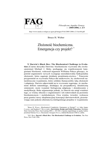 Filozoficzne Aspekty Genezy — 2005/2006, t. 2/3 http://www.nauka-a-religia.uz.zgora.pl/images/FAG/2005-2006.t.2-3/art.06.pdf Bruce H. Weber Złożoność biochemiczna. Emergencja czy projekt? * W Darwin’s Black Box: The Biochemical Challenge to Evolution [Czarna skrzynka Darwina: biochemiczne wyzwanie dla ewolucjonizmu] Michael J. Behe, posługując się współczesnymi kategoriami biochemii, wskrzesił argument Williama Paleya głoszący, że pośród organizmów żywych występuje nieredukowalna funkcjonalna złożoność, która sugeruje działanie projektanta-stwórcy. 1 Ponownie przypomniał on wyzwanie Paleya dla naukowców, by zaoferowali naturalistyczne wyjaśnienie, które solidnie tłumaczyłoby taką złożoność i adaptację. Darwin odpowiadał na to wyzwanie sugerując, że mechanizm doboru naturalnego, działający na przypadkową, dziedziczną zmienność, może wyjaśnić biologiczną adaptację i dziedziczenie z modyfikacją. Behe argumentuje jednak, że Darwin nie mógł wiedzieć tego, co wiemy obecnie o organizmach i ich rodowodach na poziomie biochemicznym i molekularnym. Owa wiedza, twierdzi, wykracza poza granice mocy eksplanacyjnej koncepcji darwinowskich, pozostawiając nam jedynie alternatywę inteligentnego projektu w wyjaśnieniu * Bruce H. WEBER, „Biochemical Complexity: Emergence or Design?”, w: John Angus CAMPBELL and Stephen C. MEYER (eds.), Darwinism, Design and Public Education, Michigan State University Press, East Lansing 2003, s. 455-462. Z języka angielskiego za zgodą Autora przełożył Dariusz SAGAN. Recenzent: Grzegorz NOWAK, Zakład Biochemii UMCS, Lublin. 1 M.J. BEHE, Darwin’s Black Box: The Biochemical Challenge to Evolution, The Free Press, New York 1996. 122 Bruce H. Weber, Złożoność biochemiczna. Emergencja czy projekt? emergencji nowych i złożonych struktur oraz zjawisk zachodzących w systemach żywych. Zamierzam rozważyć, czy złożoność biochemiczna, tak jak przedstawia ją Behe, rzeczywiście jest nieredukowalna – a jej emergencja wymyka się analizie naukowej. Behe nie zaprzecza, że dobór naturalny może oddziaływać na populacje, powodując zmiany w częstościach występowania genu. Nie zaprzecza również występowaniu mutacji. Uznaje on fakt, że mutacje w białkowych sekwencjach aminokwasów świadczą o dziedziczeniu z modyfikacją. Do tego stopnia zgadza się on z poglądem, że biochemia popiera istnienie zmiany ewolucyjnej. Jednakże systemy białek i enzymów, wykonujących poszczególne czynności biologiczne, jak wić bakteryjna, transdukcja sygnałów przez błony, transport przez błony i w obrębie komórek, krzepnięcie krwi, układ immunologiczny oraz powstawanie i regulacja metabolizmu, Behe postrzega jako złożone ze zbyt wielu składników, które musiałyby precyzyjnie ze sobą oddziaływać, by wyewoluowały w chaotycznym, stopniowym procesie doboru naturalnego. Nie chodzi o to, że pierwotne oko czy wić mogły nie zyskać przewagi selekcyjnej, ale raczej o to, że otrzymanie nawet tak prymitywnych struktur wymagałoby wielu zmian molekularnych, nie posiadających żadnej wartości funkcjonalnej, zanim wszystkie konieczne składniki molekularne nie byłyby obecne. Dlatego przytaczane przez Behe’ego złożone układy biochemiczne nie mogłyby powstać inaczej niż na podstawie projektu – tak samo jak w przypadku pułapki na myszy, której Behe używa jako analogii zastępującej zegar Paleya. Z założenia odrzuca on jakiekolwiek inne alternatywy. Daje do zrozumienia, że współcześni ewolucjoniści w celu obrony paradygmatu darwinowskiego ową nieredukowalną złożoność albo ignorują, albo wyjaśniają przy pomocy „takich sobie bajeczek”. Behe często wspiera się domniemanym faktem braku podejmowania przez biologów ewolucyjnych prób dostarczenia wiarygodnych wyjaśnień przyczynowych emergencji takich złożonych układów adaptacyjnych. Nie uznaje też pracy rzeczywiście wykonanej przez dar- Filozoficzne Aspekty Genezy — 2005/2006, t. 2/3 123 winowską wspólnotę badawczą. Ignoruje on właściwie cały obszar obecnych badań nad samoorganizacją, nad zjawiskiem emergencji. Udzielono licznych odpowiedzi Behe’emu – mieli w tym udział również biochemicy, łącznie ze mną – które odnosiły się do tego, jak naprawdę powinien on przedstawić obecny stan literatury przy uwzględnieniu podanych przez niego konkretnych przykładów. 2 W rzeczywistości opublikowano próby wyjaśnienia zagadnień, takich jak powstanie wici, układu krzepnięcia krwi czy biochemicznej podstawy procesu widzenia. Należy przyznać, że przedstawienie tego, w jaki sposób aktualne dane biologii molekularnej sugerują procesy duplikacji genu, tasowania domen i eksonów oraz ewolucji dywergentnej nie wyjaśnia, jak niekompletne systemy zyskują przewagę selekcyjną. Obecnie jesteśmy jednak na etapie gromadzenia wystarczającej ilości danych na podstawie sekwencji DNA i trójwymiarowych struktur białek, by w niedalekiej przyszłości przeprowadzać liczne testy przypuszczalnych wyjaśnień ewolucyjnych, co do których można by się spodziewać, że nie będą „takimi sobie bajeczkami”. Behe argumentuje na przykład, że wyjaśnienie pochodzenia układu immunologicznego znajduje się poza zasięgiem darwinizmu z powodu ogromnej złożoności tego systemu i dużej liczby genów potrzebnych do jego utworzenia. Jednakże ostatnio ujawnione odkrycie funkcji transpozaz RAG i transpozonów w układach immunologicznych u współcześnie żyjących kręgowców oraz możliwego wpływu, jaki mogło mieć wprowadzenie takiej aktywności na emergencję układu immunologicznego u kręgowców, ukazuje ryzykowność założenia, że ewolucjonizm nie potrafi wyjaśnić złożoności jakiegokolwiek systemu. 3 Można już utworzyć program badawczy, który dzięki analizom sekwencji i symulacjom komputerowym zbada przypuszczalne drogi 2 B.H. WEBER, „Irreducible Complexity and the Problem of