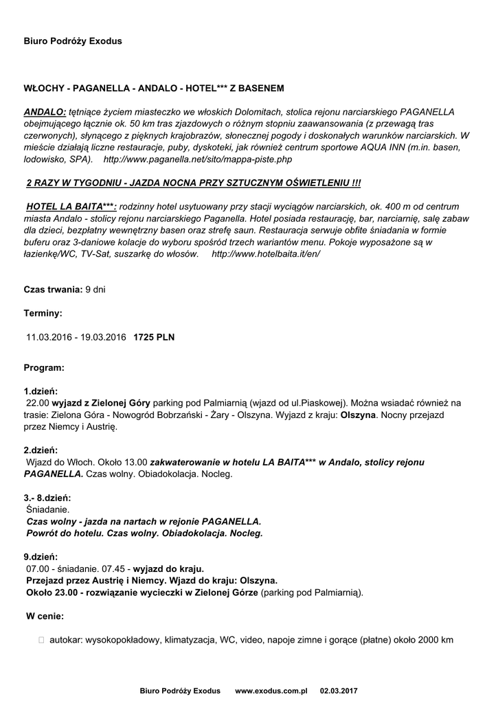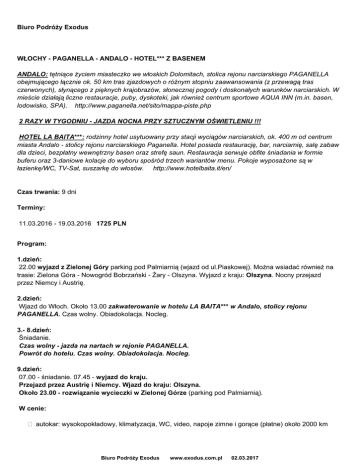 Biuro Podróży Exodus WŁOCHY - PAGANELLA - ANDALO - HOTEL*** Z BASENEM ANDALO: tętniące życiem miasteczko we włoskich Dolomitach, stolica rejonu narciarskiego PAGANELLA obejmującego łącznie ok. 50 km tras zjazdowych o różnym stopniu zaawansowania (z przewagą tras czerwonych), słynącego z pięknych krajobrazów, słonecznej pogody i doskonałych warunków narciarskich. W mieście działają liczne restauracje, puby, dyskoteki, jak również centrum sportowe AQUA INN (m.in. basen, lodowisko, SPA). http://www.paganella.net/sito/mappa-piste.php 2 RAZY W TYGODNIU - JAZDA NOCNA PRZY SZTUCZNYM OŚWIETLENIU !!! HOTEL LA BAITA***: rodzinny hotel usytuowany przy stacji wyciągów narciarskich, ok. 400 m od centrum miasta Andalo - stolicy rejonu narciarskiego Paganella. Hotel posiada restaurację, bar, narciarnię, salę zabaw dla dzieci, bezpłatny wewnętrzny basen oraz strefę saun. Restauracja serwuje obfite śniadania w formie buferu oraz 3-daniowe kolacje do wyboru spośród trzech wariantów menu. Pokoje wyposażone są w łazienkę/WC, TV-Sat, suszarkę do włosów. http://www.hotelbaita.it/en/ Czas trwania: 9 dni Terminy: 11.03.2016 - 19.03.2016 1725 PLN Program: 1.dzień: 22.00 wyjazd z Zielonej Góry parking pod Palmiarnią (wjazd od ul.Piaskowej). Można wsiadać również na trasie: Zielona Góra - Nowogród Bobrzański - Żary - Olszyna. Wyjazd z kraju: Olszyna. Nocny przejazd przez Niemcy i Austrię. 2.dzień: Wjazd do Włoch. Około 13.00 zakwaterowanie w hotelu LA BAITA*** w Andalo, stolicy rejonu PAGANELLA. Czas wolny. Obiadokolacja. Nocleg. 3.- 8.dzień: Śniadanie. Czas wolny - jazda na nartach w rejonie PAGANELLA. Powrót do hotelu. Czas wolny. Obiadokolacja. Nocleg. 9.dzień: 07.00 - śniadanie. 07.45 - wyjazd do kraju. Przejazd przez Austrię i Niemcy. Wjazd do kraju: Olszyna. Około 23.00 - rozwiązanie wycieczki w Zielonej Górze (parking pod Palmiarnią). W cenie: autokar: wysokopokładowy, klimatyzacja, WC, video, napoje zimne i gorące (płatne) około 2000 km Biuro Podróży Exodus www.exodus.com.pl 02.03.2017 noclegi: 7 x hotel***, pokoje 2,3-osobowe z łaz/WC, TV wyżywienie: 7 x śniadanie (bufet) + 7 x obiadokolacja (serwowana, do wyboru spośród trzech wariantów menu) basen kryty i siłownia w hotelu opieka pilota BP EXODUS ubezpieczenie NW, KL, bagaż podatek VAT Dodatkowe opłaty: napoje do obiadokolacji dodatkowe ubezpieczenie narciarskie OC SKI - ok. 50 zł strefa saun w hotelu - 3 eur/wejście obowiązkowa kaucja zwrotna za ski-pass - ok. 5 eur dopłata do pokoju 1-osobowego - 360 zł zniżki: dzieci w wieku 2-6 lat (jako 3. i 4. osoba w pokoju z 2 osobami dorosłymi) - 300 zł zniżki młodzież w wieku 6-16 lat (jako 3. i 4. osoba w pokoju z 2 osobami dorosłymi lub rówieśnikami) - 100 zł zniżki dorośli w pokoju 4-osobowym - po 100 zł zniżki ski-pass PAGANELLA (6 dni): dorośli - 144 eur seniorzy - 122 eur (urodzeni przed 30.11.1950) młodzież - 101 eur (urodzeni po 30.11.1999) dzieci - 72 eur (urodzeni po 30.11.2007) Uwaga: Przy zakupie karnetu narciarskiego obowiązkowo wymagany jest paszport lub dowód osobisty. Podczas długich przejazdów autokar zatrzymuje się co ok. 4 godziny na postoje ok. 15-20 min. Biuro nie bierze odpowiedzialności za punkty programu niezrealizowane z przyczyn obiektywnych. Biuro Podróży Exodus www.exodus.com.pl 02.03.2017