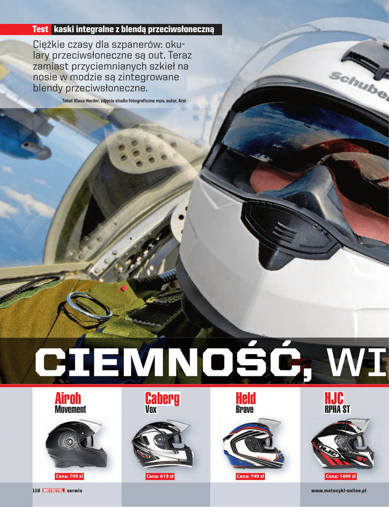 Test kaski integralne z blendą przeciwsłoneczną Ciężkie czasy dla szpanerów: okulary przeciwsłoneczne są out. Teraz zamiast przyciemnianych szkieł na nosie w modzie są zintegrowane blendy przeciwsłoneczne. Tekst Klaus Herder, zdjęcia studio fotograficzne mps, autor, Arai CIEMNOŚĆ, WI Airoh Caberg Held HJC Cena: 799 zł Cena: 619 zł Cena: 749 zł Cena: 1499 zł Movement 116 serwis Vox Brave RPHA ST www.motocykl-online.pl M Ostatni konserwatysta Dlatego blenda przeciwsłoneczna w kasku robi furorę. Może nie wygląda tak kozacko, jak Ray-Bany albo Aviatory na nosie harleyowca, ale wystarczy szybki ruch lewej ręki i stanie się jasność (lub ciemność). A że producenci kasków nie są w ciemię bici, zrozumieli, że bez blendy ani rusz. Wymiękł nawet Shoei, który jeszcze do niedawna dałby sobie rękę uciąć, że blendy nigdy mieć nie będzie. Wśród konserwatystów, którzy blend w kaskach nie mają, pozostał tylko Arai. Według szacunków ekspertów więcej niż połowa wszystkich sprzedanych nowych kasków integralnych ma wspomnianą blendę. Kaski integralne bez blendy to domena zawodników i gości lubiących latać na torze, bo zamiast niej po prostu montują przyciemnianą szybkę. No, chyba że mówimy o niskiej półce cenowej, w której liczy się każda złotówka, a blenda przecież kosztuje. Niemniej coraz więcej motocyklistów kupuje kaski integralne z blendą i właśnie dlatego postanowiliśmy przyjrzeć im się bliżej. Z premedytacją pominęliśmy ceny garnków. Chodziło nam o to, by sprawdzić, czy cena faktycznie ma coś wspólne- go (a jeśli tak, to na ile) z jakością blendy. Nieco uprzedzając wyniki, możemy powiedzieć: i tak, i nie. Wytyczne dotyczące kasków dawały duże pole do popisu: miał to być dostępny obecnie model seryjny, spełniający wymagania normy ECE-R 22.05, skierowany do grupy motocyklistów, którzy lubią jazdę mieszaną: sport i turystykę. Na udział w teście zdecydowało się ośmiu producentów. Nie jest to oszałamiająca liczba, niemniej pozwala wyrobić sobie zdanie o rynku, pokazując, co można obecnie kupić w przedziale 620–2200 zł. Oprócz dobrze znanych garnków, jak Schuberth S2, do walki stanęły nowości, jak HJC RPHA ST. Jak zwykle na końcową klasyfikację złożyły się wyniki testów laboratoryjnych oraz praktyczna ocena naszych ludzi. Stanowisko pomiarowe w TÜV Rheinland w Kolonii wyraźnie wykazało, że w ostatnich latach producenci mocno popracowali nad poprawą bezpieczeństwa garnków i efektywnością tłumienia siły uderzeń. Podczas naszego pierwszego testu kasków przy zastosowaniu zaostrzonych kryteriów oceny, wiele modeli podczas uderzenia w prawą stronę kasku z prędkością 7,5 m/s osiągało przyspieszenia o wartości znacznie powyżej 200 g (wartość graniczna dla ECE wynosi 275 g). Tym razem – pomijając jeden wyjątek – uzyskaliśmy wyniki poniżej 200 g. Chroń swą skroń Bardzo ważna dla oceny kasku była wartość HIC (Head Injury Criterion, czyli kryterium uszkodzeń głowy; więcej o nim na str. 124), dla którego wyznaczyliśmy zaporową – jak się wydawało – wielkość 1000. Kaskom HJC i Airoha niewiele brakowało do zmieszczenia się w tej granicy. Pozostałe kaski także uzyskały porządne wartości. Podczas uderzenia w brodę DZĘ CIEMNOŚĆ Rocc 550 Full Carbon Cena: 869 zł 2014/5 Schuberth Shark X-lite Cena: 2199 zł Cena: 1099 zł Cena: 1649 zł S2 Speed-R X-702GT serwis 117 Ciąg dalszy na str. 122 otto ludzi noszących okulary przeciwsłoneczne: „Nigdy nie jest za ciemno, żeby być cool”. Nie do końca się z tym zgodzimy, bo czasem jednak jest. Jeśli jechałeś kiedyś w piękny słoneczny dzień krętą górską drogą z okularami przeciwsłonecznymi na nosie, to z pewnością pamiętasz wjazd do gęstego lasu czy do tunelu. Nawet mocno wytrenowane oczy nie wystarczą, żebyś widział, dokąd jedziesz. Problem z okularami polega właśnie na tym, że wystarczy nagła zmiana oświetlenia i jesteśmy niemal jak dzieci we mgle. * – 5 żółtych gwiazdek = bardzo dobry; 4 gwiazdki = dobry; 3 gwiazdki = dostateczny; 2 gwiazdki = ostatecznie; 1 gwiazdka = nie! Test kasków z blendą AIROH AAIRO IROOH MOVEMENT CABERG CAB BERG VOX HELD HEL LD BRAVE Importer: Powerbike, www.powerbike.pl, [email protected], tel. 61 65 35 750 Cena: 799 zł (z grafiką 849 zł) Rozmiary: XS do XL Masa: 1420 ±50 g/1446 g (wg producenta/zważony rozmiar XL) Kolory: czarny mat, dziewięć grafik Skorupa: poliwęglan Zapięcie: microlock Kraj produkcji: Włochy; homologacja: E 3 (Włochy) Wyposażenie: szyba z pinlockiem, podbródek, torba Importer: Rapid Motocykle, www.rapid-motocykl.pl, tel. 61 8 720 720 Cena: 619 zł (z grafiką 699 zł) Rozmiary: XS do XXL Masa: 1450 ±50 g/1635 g (wg producenta/zważony rozmiar XL) Kolory: biały, czarny mat, siedem grafik Skorupa: poliwęglan Zapięcie: microlock Kraj produkcji: Włochy; homologacja: E 3 (Włochy) Wyposażenie: przygotowanie pod pinlocka, podbródek, nosek, pokrowiec Importer: Powerbike, www.powerbike.pl, [email protected], tel. 61 65 35 750 Cena: 749 zł (na zamówienie) Rozmiary: XS do XXL Masa: 1530 ±50 g/1555 g (wg producenta/zważony rozmiar XL) Kolory: czarny, czarny mat, pięć grafik Skorupa: włókno szklane Zapięcie: microlock Kraj produkcji: Wietnam; homologacja: E 13 (Luksemburg) Wyposażenie: przygotowanie pod pinlocka, podbródek, nosek, pokrowiec Łatwe wkładanie i zdejmowanie; dobre dopasowanie, mocno siedzi na głowie, miła w dotyku wyściółka; dobra aerodynamika; bardzo dobra wentylacja górnej części głowy, dobra wentylacja części szczękowej; praktyczny i dobrze funkcjonujący zapadkowy mechanizm wizjera, bardzo łatwa wymiana szyby; niekonwencjonalna obsługa blendy przeciwsłonecznej (przycisk i dźwigienka), ale po przyzwyczajeniu bardzo praktyczna; bardzo dobre wartości tłumienia uderzeń Łatwe wkładanie; komfortowa wyściółka; dobra aerodynamika; dobrze d