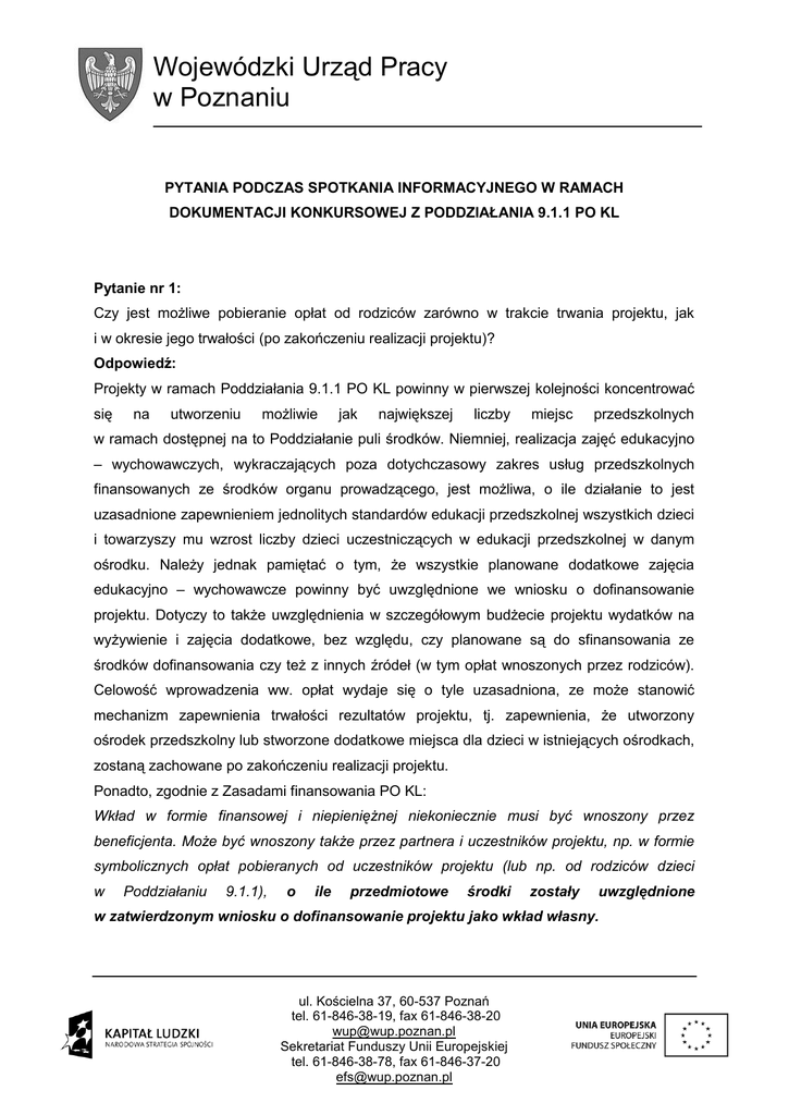 Wojewódzki Urząd Pracy w Poznaniu PYTANIA PODCZAS SPOTKANIA INFORMACYJNEGO W RAMACH DOKUMENTACJI KONKURSOWEJ Z PODDZIAŁANIA 9.1.1 PO KL Pytanie nr 1: Czy jest możliwe pobieranie opłat od rodziców zarówno w trakcie trwania projektu, jak i w okresie jego trwałości (po zakończeniu realizacji projektu)? Odpowiedź: Projekty w ramach Poddziałania 9.1.1 PO KL powinny w pierwszej kolejności koncentrować się na utworzeniu możliwie jak największej liczby miejsc przedszkolnych w ramach dostępnej na to Poddziałanie puli środków. Niemniej, realizacja zajęć edukacyjno – wychowawczych, wykraczających poza dotychczasowy zakres usług przedszkolnych finansowanych ze środków organu prowadzącego, jest możliwa, o ile działanie to jest uzasadnione zapewnieniem jednolitych standardów edukacji przedszkolnej wszystkich dzieci i towarzyszy mu wzrost liczby dzieci uczestniczących w edukacji przedszkolnej w danym ośrodku. Należy jednak pamiętać o tym, że wszystkie planowane dodatkowe zajęcia edukacyjno – wychowawcze powinny być uwzględnione we wniosku o dofinansowanie projektu. Dotyczy to także uwzględnienia w szczegółowym budżecie projektu wydatków na wyżywienie i zajęcia dodatkowe, bez względu, czy planowane są do sfinansowania ze środków dofinansowania czy też z innych źródeł (w tym opłat wnoszonych przez rodziców). Celowość wprowadzenia ww. opłat wydaje się o tyle uzasadniona, ze może stanowić mechanizm zapewnienia trwałości rezultatów projektu, tj. zapewnienia, że utworzony ośrodek przedszkolny lub stworzone dodatkowe miejsca dla dzieci w istniejących ośrodkach, zostaną zachowane po zakończeniu realizacji projektu. Ponadto, zgodnie z Zasadami finansowania PO KL: Wkład w formie finansowej i niepieniężnej niekoniecznie musi być wnoszony przez beneficjenta. Może być wnoszony także przez partnera i uczestników projektu, np. w formie symbolicznych opłat pobieranych od uczestników projektu (lub np. od rodziców dzieci w Poddziałaniu 9.1.1), o ile przedmiotowe środki zostały uwzględnione w zatwierdzonym wniosku o dofinansowanie projektu jako wkład własny. ul. Kościelna 37, 60-537 Poznań tel. 61-846-38-19, fax 61-846-38-20 [email protected] Sekretariat Funduszy Unii Europejskiej tel. 61-846-38-78, fax 61-846-37-20 [email protected] Wpłaty od rodziców muszą znaleźć potwierdzenie w wydatkach kwalifikowalnych projektu, Beneficjent ma zatem obowiązek wykazać we wnioskach o płatność wydatki poniesione z otrzymanych od rodziców wpłat. Ponadto, zgodnie ze słowniczkiem pojęć zawartym w Wytycznych dotyczących kwalifikowania wydatków w ramach PO KL przychód oznacza każdy wpływ środków finansowych w ramach projektu ze sprzedaży, wynajmu, usług, opłat wpisowych lub innych równoważnych opłat oraz kar umownych z tytułu nieprawidłowej realizacji umowy zawartej z wykonawcą lub innej umowy związanej z realizacją projektu. Jednocześnie w Zasadach finansowania PO KL doprecyzowano, że przychód stanowią opłaty wpisowe lub inne równoważne opłaty nie będące wkładem własnym w projekcie. Wobec powyższego, należy uznać, że wpłaty dokonywane przez rodziców na wyżywienie i dodatkowe zajęcia w ramach projektu 9.1.1 PO KL będą stanowiły przychód projektu, o ile nie zostały przewidziane we wniosku o dofinansowanie projektu i nie zostały rozliczone w ramach wkładu własnego. Pytanie nr 2: Prowadzę przedszkole od września 2012 r. Prowadzone są w nim dodatkowe zajęcia. Chcę w ramach projektu przyjąć nowe dzieci do przedszkola oraz zorganizować dodatkowe zajęcia, w których będą uczestniczyły dzieci dotychczas uczęszczające do przedszkola. Czy jest możliwość pobierania czesnego od dzieci nieobjętych projektem? Odpowiedź: Tak, jednakże za zajęcia dodatkowe, które są finansowane ze środków projektowych nie ma możliwości pobierania dodatkowo opłat od rodziców. Pytanie nr 3: Prowadzę punkt przedszkolny, do którego uczęszcza obecnie 25 dzieci. Planuję zwiększyć liczbę dzieci i tym samym zmienić organizację placówki – z punktu przedszkolnego na przedszkole. Czy mogę aplikować do drugiego typu operacji w ramach Poddziałania 9.1.1 PO KL? Odpowiedź: Zgodnie z zapisami Dokumentacji konkursowej dla konkursu zamkniętego w ramach Poddziałania 9.1.1 PO KL typ drugi projektu obejmuje wsparcie istniejących przedszkoli (w tym również funkcjonujących innych form wychowania przedszkolnego) w zakresie wygenerowania dodatkowych miejsc przedszkolnych, przyczyniające się do wzrostu całkowitej liczby miejsc w przedszkolach i/lub innych formach wychowania przedszkolnego podlegających pod jeden organ prowadzący i umiejscowionych na terenie danej gminy. Punkt przedszkolny, o którym mowa w pytaniu, czyli ul. Kościelna 37, 60-537 Poznań tel. 61-846-38-19, fax 61-846-38-20 [email protected] Sekretariat Funduszy Unii Europejskiej tel. 61-846-38-78, fax 61-846-37-20 [email protected] inna forma wychowania przedszkolnego, faktycznie istnieje. Przekształcenie go w przedszkole z jednoczesnym utworzeniem dodatkowych oddziałów stanowi wsparcie już istniejących punktów przedszkolnych i dlatego powinno być objęte drugim typem projektu. Typ pierwszy projektu dotyczy sytuacji, w której udzielane jest wsparcie na uruchomienie, a nie na poszerzenie skali działania placówki. Pytanie nr 4: Planujemy stworzyć nowe miejsca w przedszkolu oraz uruchomić dodatkowe zajęcia. Ile dzieci musimy przyjąć do przedszkola, aby projekt był możliwy do realizacji? Odpowiedź: Należy przeprowadzić diagnozę, z której wynika, jakie jest zapotrzebowanie na usługi przedszkolne. Działania w ramach projektu powinny obligatoryjnie przyczynić się do wzrostu całkowitej liczby miejsc w przedszkolu i/lub innych formach wychowania przedszkolnego. Nie ma kryterium dotyczącego minimalnej oraz maksymalnej liczby dzieci, które mają zostać objęte wsparciem. Należy również zwrócić uwag