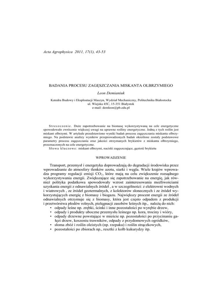 Acta Agrophysica 2011, 17(1), 43-53 BADANIA PROCESU ZAGĘSZCZANIA MISKANTA OLBRZYMIEGO Leon Demianiuk Katedra Budowy i Eksploatacji Maszyn, Wydział Mechaniczny, Politechnika Białostocka ul. Wiejska 45C, 15-351 Białystok e-mail: [email protected] S t r e s z c z e n i e . Duże zapotrzebowanie na biomasę wykorzystywaną na cele energetyczne spowodowało zwrócenie większej uwagi na uprawne rośliny energetyczne. Jedną z tych roślin jest miskant olbrzymi. W artykule przedstawiono wyniki badań procesu zagęszczania miskanta olbrzymiego. Na podstawie analizy wyników przeprowadzonych badań określone zostały podstawowe parametry procesu zagęszczania oraz jakości otrzymanych brykietów z miskanta olbrzymiego, przeznaczonych na cele energetyczne. S ł o wa k l u c z o w e : miskant olbrzymi, naciski zagęszczające, gęstość brykietu WPROWADZENIE Transport, przemysł i energetyka doprowadzają do degradacji środowiska przez wprowadzanie do atmosfery tlenków azotu, siarki i węgla. Wiele krajów wprowadza programy regulacji emisji CO 2 , które mają na celu zwiększenie rozsądnego wykorzystywania energii. Zwiększające się zapotrzebowanie na energię, jak również polityka podatkowa spowodowały wzrost zainteresowania możliwościami uzyskania energii z odnawialnych źródeł , a w szczególności: z elektrowni wodnych i wiatrowych , ze źródeł geotermalnych, z kolektorów słonecznych i ze źródeł wykorzystujących energię z biomasy i biogazu. Największy procent energii ze źródeł odnawialnych otrzymuje się z biomasy, która jest często odpadem z produkcji i przetwórstwa płodów rolnych, pielęgnacji zasobów leśnych itp., należą do nich: • odpady leśne np. zrębki, ścinki i inne pozostałości po wyrębie drzew, • odpady i produkty uboczne przemysłu leśnego np. kora, trociny i wióry, • odpady drzewne powstające w mieście np. pozostałości po przycinaniu gałęzi drzew, koszeniu trawników, odpady z przydomowych ogródków, • słoma zbóż i roślin oleistych (np. rzepaku) i roślin strączkowych, • pozostałości po zbiorach np., resztki z kolb kukurydzy itp. 44 L. DEMIANIUK Innym rodzajem biomasy mogą być uprawne rośliny energetyczne. Rozporządzenia Ministra Gospodarki z dnia 14.08.2008r. mają zachęcić energetykę do inwestowania w rozwój upraw energetycznych, które w Polsce rozwijają się zbyt wolno pomimo dużej powierzchni nieużytków. Rośliny energetyczne powinny charakteryzować się dużym przyrostem rocznym, wysoką wartością opałową, znaczną odpornością na choroby i szkodniki jak również niewielkimi wymaganiami glebowymi. Uprawa powinna być użytkowana przez okres 15-20 lat. Do najczęściej uprawianych roślin energetycznych należą: wierzba, malwa pensylwańska, miskant olbrzymi, słonecznik bulwiasty. Miskant olbrzymi znany również pod nazwą miskant chiński, trzciną chińską lub trawą słoniową jest jednym z przykładów rośliny, która w ostatnich latach szczególnie zainteresowała naukowców szukających nowych, odnawialnych źródeł energii i roślinnych surowców dla przemysłu. Przeciętna wydajność kilkuletniej plantacji kształtuje się na poziomie 20 ton biomasy z 1ha przy wilgotności ok. 20%. Wartość opałowa takiego paliwa wynosi od 14 do 17 MJ·kg-1. (Roszewski 1996) a po spaleniu pozostaje ok. 2% popiołu (El Bassam 1996). Materiał roślinny posiada przeważnie bardzo małą gęstość nasypową (od około 60-80 kg·m-3 – np. łuska gryki do 280 kg·m-3 – trociny z drzew) i jest bardzo niewygodnym materiałem do transportu i spalania w liniach automatycznych. Najlepszym sposobem zwiększenia gęstości nasypowej, zmniejszenia objętości, nadania określonego kształtu materiałowi roślinnemu jest poddanie go brykietowaniu lub granulowaniu. METODYKA BADAŃ Metodykę badań procesu zagęszczania miskanta olbrzymiego w układzie roboczym tłok – komora zamknięta przedstawiono na rysunku 1. Opis stanowisk badawczych Badania doświadczalne nad przebiegiem procesu brykietowania (zagęszczania) przeprowadzono na stanowisku przedstawionym na rysunku 2. Stanowisko to pozwala na badanie następujących parametrów mających istotny wpływ na proces zagęszczania: • nacisków zagęszczających (osiowych), • nacisków zagęszczanego materiału na ścianki boczne matrycy (naciski boczne), • nacisków zagęszczanego materiału na dno matrycy (zamkniętej), • szybkości zagęszczania (przesuwu tłoka zagęszczającego), • wysokości warstwy zagęszczanego materiału, • nacisków osiowych wewnątrz brykietu, • rozkładu nacisków na promieniu tłoka zagęszczającego. BADANIE PROCESU ZAGĘSZCZANIA MISKANTA OLBRZYMIEGO 45 rozdrobniony miskant olbrzymi comminuted giant miscantus przygotowanie materiału do brykietownie suszenie drying nawilżanie humidification prepatration of briquetting material określenie wilgotności determing of moisture content badanie procesu zagęszczania w komorze zamkniętej investigation of compressing proces in closed chamber naciski zagęszczające densifikation pressure gotowy brykiet finished briquette badanie jakości brykietu briquette quality evaluation określenie gęstości brykietu determining of briquette density określenie siły rozkruszania na powierzchni bocznej brykietu determining of crushing strength on side surface of the briquette opracowanie wyników data handling wnioski conclusion Rys. 1. Schemat realizacji badań Fig. 1. Diagram of the research realisation W stanowisku wykorzystano prasę hydrauliczną 5 typu PYE 63 S1 o nacisku maksymalnym 630 kN. Zapewnia ona równomierne przemieszczanie tłoka prasującego 3 podczas zagęszczania surowca w założonym zakresie (0-250 MPa). Na 46 L. DEMIANIUK tłoku prasującym 3, powyżej części roboczej, naklejono pełny pomiarowy mostek tensometryczny służący do pomiaru osiowych sił zagęszczania. Na stole prasy 6 umocowano głowicę pomiarową 1 z nadstawką 2. Do pomiaru na