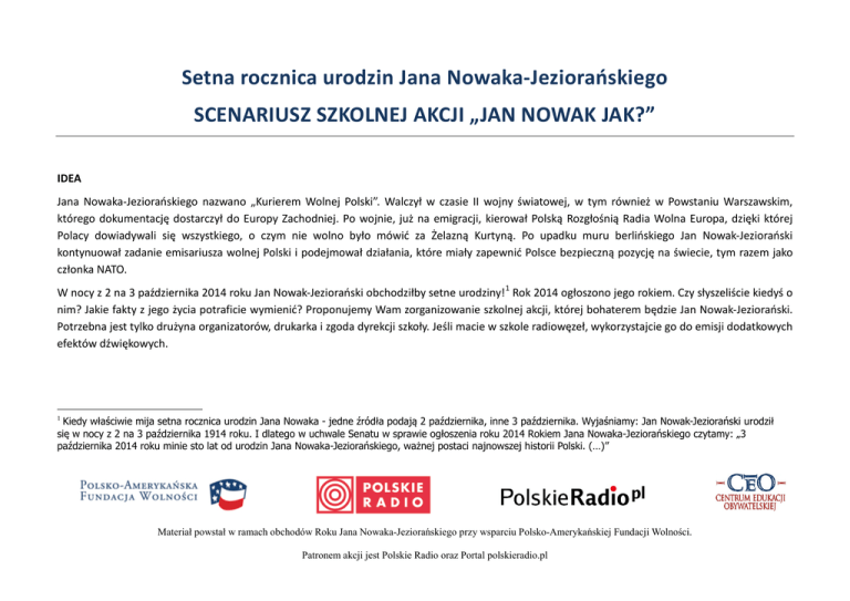 Setna rocznica urodzin Jana Nowaka-Jeziorańskiego SCENARIUSZ SZKOLNEJ AKCJI „JAN NOWAK JAK?” IDEA Jana Nowaka-Jeziorańskiego nazwano „Kurierem Wolnej Polski”. Walczył w czasie II wojny światowej, w tym również w Powstaniu Warszawskim, którego dokumentację dostarczył do Europy Zachodniej. Po wojnie, już na emigracji, kierował Polską Rozgłośnią Radia Wolna Europa, dzięki której Polacy dowiadywali się wszystkiego, o czym nie wolno było mówić za Żelazną Kurtyną. Po upadku muru berlińskiego Jan Nowak-Jeziorański kontynuował zadanie emisariusza wolnej Polski i podejmował działania, które miały zapewnić Polsce bezpieczną pozycję na świecie, tym razem jako członka NATO. W nocy z 2 na 3 października 2014 roku Jan Nowak-Jeziorański obchodziłby setne urodziny! 1 Rok 2014 ogłoszono jego rokiem. Czy słyszeliście kiedyś o nim? Jakie fakty z jego życia potraficie wymienić? Proponujemy Wam zorganizowanie szkolnej akcji, której bohaterem będzie Jan Nowak-Jeziorański. Potrzebna jest tylko drużyna organizatorów, drukarka i zgoda dyrekcji szkoły. Jeśli macie w szkole radiowęzeł, wykorzystajcie go do emisji dodatkowych efektów dźwiękowych. Kiedy właściwie mija setna rocznica urodzin Jana Nowaka - jedne źródła podają 2 października, inne 3 października. Wyjaśniamy: Jan Nowak-Jeziorański urodził się w nocy z 2 na 3 października 1914 roku. I dlatego w uchwale Senatu w sprawie ogłoszenia roku 2014 Rokiem Jana Nowaka-Jeziorańskiego czytamy: „3 października 2014 roku minie sto lat od urodzin Jana Nowaka-Jeziorańskiego, ważnej postaci najnowszej historii Polski. (…)” 1 Materiał powstał w ramach obchodów Roku Jana Nowaka-Jeziorańskiego przy wsparciu Polsko-Amerykańskiej Fundacji Wolności. Patronem akcji jest Polskie Radio oraz Portal polskieradio.pl DZIAŁANIE TERMIN: 2 lub 3 października 2014 r. – Setne urodziny Jana Nowaka-Jeziorańskiego UWAGA! Pierwszy krok akcji należy wykonać już pod koniec września. MIEJSCE: cała szkoła CZAS TRWANIA: cały dzień (lub krócej, w zależności od możliwości organizatorów) POTRZEBNE MATERIAŁY: - komputer z dostępem do internetu, - drukarka - tablica i kreda - karton, nożyczki, szpilki CEL: jak największa liczba uczniów pozna Jana Nowaka-Jeziorańskiego Materiał powstał w ramach obchodów Roku Jana Nowaka-Jeziorańskiego przy wsparciu Polsko-Amerykańskiej Fundacji Wolności. Patronem akcji jest Polskie Radio oraz Portal polskieradio.pl PRZEBIEG AKCJI: Przygotujcie biografię Jana Nowaka-Jeziorańskiego (fakty, zdjęcia i cytaty). Przedstawcie go jako polskiego bohatera XX wieku. Możecie skorzystać ze strony jezioranski.org Zawieście przygotowaną infografikę lub tekst w bardzo widocznym miejscu w szkole, np. na ścianie w najczęściej odwiedzanych przez uczniów miejscu. Pamiętajcie, aby podpisać wystawę „Setne urodziny Jana Nowaka-Jeziorańskiego – 3 października 2014 r.”. Możecie informacje o Janie Nowaku podawać w formie ciekawostek w szkolnym radiowęźle lub na szkolnym fanpage’u na Facebooku. Następnie przygotujcie międzyklasowy konkurs wiedzy o Janie Nowaku-Jeziorańskim. Organizację musicie ustalić z nauczycielami. Pamiętajcie też o nagrodzie. Może nauczyciele zgodzą się, aby klasa, która wygra, miała możliwość przełożenia jednego sprawdzianu albo dodatkowej wycieczki do kina? Pomyślcie nad organizacją wydarzenia. Możecie zostawiać zadania w salach lekcyjnych i po każdej lekcji zbierać rozwiązania od klas. Możecie wywieszać zadania na przerwach w jednym miejscu w szkole lub zadawać pytania przez radiowęzeł. Wybierzcie wariant, który wydaje Wam się najłatwiejszy do wykonania. Zadbajcie o to, aby poinformować nauczycieli i uczniów o tym, na czym polega Wasza gra. W dniu gry w miejscu widocznym przy wejściu do szkoły zawieście plakat informujący o akcji. Możecie wykorzystać grafikę „Jan Nowak jak?” Przed konkursem usuńcie wystawę i informacje o Janie Nowaku-Jeziorańskim i sprawdźcie, ile zapamiętali uczniowie Waszej szkoły. W widocznym miejscu w szkole (najlepiej tym, w którym wcześniej wywiesiliście biografię) wywieście ranking klas. Po każdej lekcji/przerwie aktualizujcie ranking. Zwycięzców ogłoście następnego dnia i wręczcie symboliczne nagrody na najbliższym apelu szkolnym. Materiał powstał w ramach obchodów Roku Jana Nowaka-Jeziorańskiego przy wsparciu Polsko-Amerykańskiej Fundacji Wolności. Patronem akcji jest Polskie Radio oraz Portal polskieradio.pl JAK WYKORZYSTAĆ RADIOWĘZEŁ? Jeśli w szkole jest radiowęzeł, koniecznie wykorzystajcie go do Waszej akcji. Informujcie o akcji przez radiowęzeł (najlepiej kilka razy w ciągu dnia). Możecie przygotować też zadanie, np. puścić przemówienie JNJ i zapytać o czym mówi oraz w którym to mogło być roku, albo wyemitować sygnał Radia Wolna Europa (znajdziecie go na stronie Radia Wolności). JAK WYMYŚLIĆ ZADANIA I PYTANIA? Zadania muszą być bardzo krótkie i różnorodne. W zadaniach korzystajcie z informacji, które wcześniej wisiały na korytarzu szkolnym. Możecie też dać klasom szansę zdobycie punktów bonusowych. Ogłoście, że przyznacie dodatkowe punkty za przebranie nawiązujące do działalności i fragmentu biografii Jana Nowaka-Jeziorańskiego lub za zebranie rodzinnych wspomnień o Radiu Wolna Europa. Wiele ciekawostek znajdziecie na fanpage’u: https://www.facebook.com/jezioranski.org Poniżej podajemy przykłady zadań: 1. Narysujcie na tablicach w klasach (lub na plakacie) znak NATO i zapytajcie, co miał z nim wspólnego JNJ. 2. Jeśli macie taką możliwość, poproście uczniów, aby wykonali zdjęcie pokazujące misję kuriera z Warszawy JNJ. Zdjęcia wrzućcie na szkolnego facebooka. 3. Wymyślcie, czego życzyłby sobie Jan Nowak-Jeziorański, gdyby świętował swoje setne urodziny. (życzenia wrzućcie na Facebooka: https://www.facebook.com/jezioranski.org) 4. Jak naprawdę nazyw