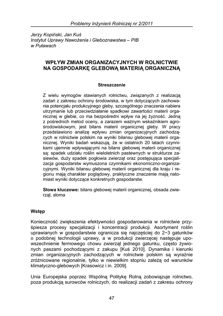 Problemy Inżynierii Rolniczej nr 2/2011 Jerzy Kopiński, Jan Kuś Instytut Uprawy Nawożenia i Gleboznawstwa – PIB w Puławach WPŁYW ZMIAN ORGANIZACYJNYCH W ROLNICTWIE NA GOSPODARKĘ GLEBOWĄ MATERIĄ ORGANICZNĄ Streszczenie Z wielu wymogów stawianych rolnictwu, związanych z realizacją zadań z zakresu ochrony środowiska, w tym dotyczących zachowania potencjału produkcyjnego gleby, szczególnego znaczenia nabiera utrzymanie lub przeciwdziałanie spadkowi zawartości materii organicznej w glebie, co ma bezpośredni wpływ na jej żyzność. Jedną z pośrednich metod oceny, a zarazem ważnym wskaźnikiem agrośrodowiskowym, jest bilans materii organicznej gleby. W pracy przedstawiono analizę wpływu zmian organizacyjnych zachodzących w rolnictwie polskim na wyniki bilansu glebowej materii organicznej. Wyniki badań wskazują, że w ostatnich 20 latach czynnikami ujemnie wpływającymi na bilans glebowej materii organicznej są: spadek udziału roślin wieloletnich pastewnych w strukturze zasiewów, duży spadek pogłowia zwierząt oraz postępująca specjalizacja gospodarstw wymuszona czynnikami ekonomiczno-organizacyjnymi. Wyniki bilansu glebowej materii organicznej dla kraju i regionu mają charakter poglądowy, praktyczne znaczenie mają natomiast wyniki dotyczące konkretnych gospodarstw. Słowa kluczowe: bilans glebowej materii organicznej, obsada zwierząt, słoma Wstęp Konieczność zwiększenia efektywności gospodarowania w rolnictwie przyśpiesza procesy specjalizacji i koncentracji produkcji. Asortyment roślin uprawianych w gospodarstwie ogranicza się najczęściej do 2−3 gatunków o podobnej technologii uprawy, a w produkcji zwierzęcej następuje upowszechnienie fermowego chowu zwierząt jednego gatunku, często żywionych paszami pochodzącymi z zakupu [Kuś 2010]. Dynamika i kierunki zmian organizacyjnych zachodzących w rolnictwie polskim są wyraźnie zróżnicowane regionalnie, tylko w niewielkim stopniu zależą od warunków klimatyczno-glebowych [Krasowicz i in. 2009]. Unia Europejska poprzez Wspólną Politykę Rolną zobowiązuje rolnictwo, poza produkcją surowców rolniczych, do realizacji zadań z zakresu ochrony 47 Jerzy Kopiński, Jan Kuś środowiska i krajobrazu, a także trwałego utrzymania żyzności i urodzajności gleb [Krasowicz 2005]. Podstawowym wskaźnikiem żyzności gleby jest zawartość glebowej materii organicznej, powszechnie określanej jako próchnica. Jej ubytki, powstające w następstwie uprawy roślin, muszą być wyrównywane nawożeniem obornikiem lub innymi nawozami naturalnymi i organicznymi, w tym również słomą [Maćkowiak 1998]. Utrzymanie dodatniego lub, co najmniej, zrównoważonego bilansu glebowej materii organicznej (próchnicy) jest jedną z podstawowych miar poprawności gospodarowania w rolnictwie [Kuś, Krasowicz 2001]. Celem opracowania była analiza wpływu zmian organizacyjnych zachodzących w rolnictwie polskim na kształtowanie się bilansu glebowej materii organicznej. Materiał i metody badań Podstawę przeprowadzonej analizy stanowiły dane GUS z lat 1980–2009 dotyczące: powierzchni uprawy poszczególnych roślin, struktury zasiewów, produkcji słomy oraz pogłowia zwierząt inwentarskich w jednostkach przeliczeniowych (DJP) 1) . Do analizy wykorzystano również dane z wszystkich województw z lat 2007–2009 oraz informacje z 33 gospodarstw, współpracujących z IUNG-PIB. Bilans materii organicznej gleby opracowano w uproszczony sposób, wykorzystując współczynniki jej degradacji i reprodukcji, zaproponowane przez Eicha i Kundlera [Fotyma, Mercik 1995]. Rośliny okopowe i kukurydza silnie zubażają glebę, natomiast motylkowate wieloletnie i ich mieszanki z trawami wzbogacają ją w materię organiczną (tab. 1). Średni współczynnik reprodukcji lub degradacji glebowej materii organicznej dla Polski, województw oraz badanych gospodarstw wyliczono według wzoru: (% pow . zbóż × −0,53) + (% pow . okopowych × −1,40) + (...) Współczynnik degradacji = ∑ powierzchnia zasiewów (%) Reprodukcję glebowej materii organicznej ze stosowania obornika obliczono przyjmując, że duża jednostka przeliczeniowa (DJP) produkuje w ciągu roku 10 t obornika o zawartości 25% suchej masy. W przypadku ujemnego bilansu glebowej materii organicznej założono, że będzie on równoważony przyorywaniem odpowiedniej ilości słomy [Kuś i in. 2006]. Wyniki badań i dyskusja W ciągu ostatnich 30 lat znacznie zmieniła się struktura zasiewów głównych roślin uprawnych oraz pogłowia zwierząt (tab. 2 i 3). Nabrały one dużego tempa 1) Duża Jednostka Przeliczeniowa – wg MRiRW na podstawie załącznika do rozporządzenia Rady Ministrów z 9.11.2004 r. (Dz.U. 2004 nr 257 poz. 2573). 48 Wpływ zmian organizacyjnych w rolnictwie... Tabela 1. Współczynniki reprodukcji (+) i degradacji (−) glebowej substancji organicznej Table 1. Reproduction (+) and degradation (−) coefficients of soil organic matter Współczynnik [t·ha–1] Coefficient −0,53 Wyszczególnienie Specification Zboża i oleiste Cereals and oil crops Kukurydza i warzywa Maize and vegetables −1,15 Okopowe Root crops −1,40 Strączkowe Leguminous plants +0,35 Motylkowate wieloletnie Perennial legumes +1,95 Trawy Grasses +1,05 Międzyplony na zielony nawóz Intercrops for green manure +0,70 Nawożenie obornikiem (s.m.) Manure fertilization (dm) +0,35 Przyorana słoma (s.m.) Straw ploughed-in (dm) +0,21 Źródło: opracowanie własne na podstawie Eicha i Kundlera [Fotyma, Mercik 1995]. Source: own elaboration based on Eich i Kundler [Fotyma, Mercik 1995] data. szczególnie po urynkowieniu gospodarki w 1990 r., a w ostatnich latach w wyniku procesów dostosowawczych do standardów polityki rolnej Unii Europejskiej [Krasowicz i in 2009]. Niektóre kierunki produkcji zwierzęcej przestały być opłacalne, co spowodowało spadek pogłowia zwierząt (tab. 3) i zapotrzebowania na niektóre rodzaje pasz. W żywieniu trzody chl
