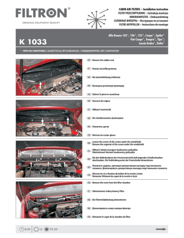 CABIN AIR FILTERS – Installation instruction FILTRY PRZECIWPYŁKOWE – Instrukcja montażu INNERAUMFILTER – Einbauanleitung САЛОННЫЕ ФИЛЬТРЫ – Инструкция по установке FILTRE ANTIPOLLEN – Instructions de montage Alfa Romeo 145*, 146*, 155*, Coupe*, Spider* Fiat Coupe*, Tempra*, Tipo*; Lancia Dedra*, Delta* K 1033 * – WITH AIR-CONDITIONED; Z KLIMATYZACJĄ; MIT KLIMAANLAGE ; С КОНДИЦИОНЕРОМ; AVEC CLIMATISATION Remove the rubber seal Usunąć uszczelkę gumową Die Gummidichtung entfernen Вытащить резиновую прокладку Enlever le joint en caoutchouc Unscrew the wipers Odkręcić wycieraczki Die Scheibenwischer abschrauben Отвинтить щетки Dévisser les essuie-glaces Loosen the screws of the screen under the windshield. Remove the segment of the screen under the windshield Odkręcić wkręty mocujące maskownicy podszybia. Zdemontować element maskownicy podszybia Die den Abdeckrahmen des Fensterunterteils befestigenden Schaftschrauben abschrauben. Die Verkleidung unter der Frontscheibe demontieren Отвинтить шурупы, крепящие декоративную накладку подстекольного элемента. Демонтировать декоративную накладку подстекольного элемента Dévisser les vis a fixation du boîtier de la recette à tiroir. Démonter l’élément du capot de la recette à tiroir Remove the cover from the filter chamber Zdemontować osłonę komory filtra Die Filterteilabdeckung demontieren Демонтировать кожух камеры фильтра Démonter le capot de la chambre du filtre 0:20 13 TX-20 CABIN AIR FILTERS – Installation instruction FILTRY PRZECIWPYŁKOWE – Instrukcja montażu · INNERAUMFILTER – Einbauanleitung · САЛОННЫЕ ФИЛЬТРЫ – Инструкция по установке · FILTRE ANTIPOLLEN – Instructions de montage K 1033 1165-2x K 1165A-2x PL Ostrożnie usunąć zabrudzony filtr, następnie zamontować nowy oraz wykonać powyższe czynności w kolejności odwrotnej GB Gently remove the old filter, put in the new one and carry out the opposite to all the previously mentioned operations in the reversed order RUS WIX-FILTRON SP. Z O.O. UL. WROCŁAWSKA 145, 63-800 GOSTYŃ, POLAND Осторожно удалить загрязненный фильтр, затем вмонтировать новый и выполнить те же действия в обратной последовательности F Enlever soigneusement le filtre usé, en installer un nouveau et réaliser les opérations mentionnées ci-dessus dans l’ordre inverse D Das verschmutzte Filter vorsichtig abnehmen, das neue einlegen und die oben genannten Arbeitsschritte in umgekehrter Reihenfolge durchführen TEL.:+48 65 572 89 00 FAX: +48 65 572 89 22 www.filtron.eu e-mail: [email protected]