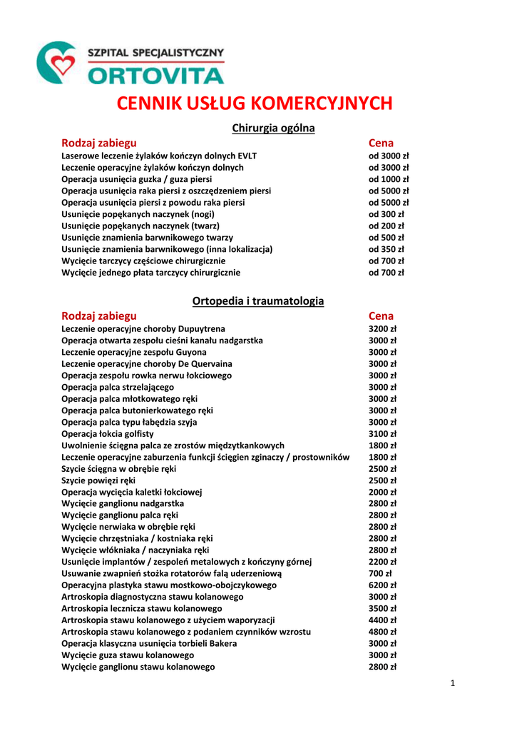 CENNIK USŁUG KOMERCYJNYCH Chirurgia ogólna Rodzaj zabiegu Cena Laserowe leczenie żylaków kończyn dolnych EVLT Leczenie operacyjne żylaków kończyn dolnych Operacja usunięcia guzka / guza piersi Operacja usunięcia raka piersi z oszczędzeniem piersi Operacja usunięcia piersi z powodu raka piersi Usunięcie popękanych naczynek (nogi) Usunięcie popękanych naczynek (twarz) Usunięcie znamienia barwnikowego twarzy Usunięcie znamienia barwnikowego (inna lokalizacja) Wycięcie tarczycy częściowe chirurgicznie Wycięcie jednego płata tarczycy chirurgicznie od 3000 zł od 3000 zł od 1000 zł od 5000 zł od 5000 zł od 300 zł od 200 zł od 500 zł od 350 zł od 700 zł od 700 zł Ortopedia i traumatologia Rodzaj zabiegu Cena Leczenie operacyjne choroby Dupuytrena Operacja otwarta zespołu cieśni kanału nadgarstka Leczenie operacyjne zespołu Guyona Leczenie operacyjne choroby De Quervaina Operacja zespołu rowka nerwu łokciowego Operacja palca strzelającego Operacja palca młotkowatego ręki Operacja palca butonierkowatego ręki Operacja palca typu łabędzia szyja Operacja łokcia golfisty Uwolnienie ścięgna palca ze zrostów międzytkankowych Leczenie operacyjne zaburzenia funkcji ścięgien zginaczy / prostowników Szycie ścięgna w obrębie ręki Szycie powięzi ręki Operacja wycięcia kaletki łokciowej Wycięcie ganglionu nadgarstka Wycięcie ganglionu palca ręki Wycięcie nerwiaka w obrębie ręki Wycięcie chrzęstniaka / kostniaka ręki Wycięcie włókniaka / naczyniaka ręki Usunięcie implantów / zespoleń metalowych z kończyny górnej Usuwanie zwapnień stożka rotatorów falą uderzeniową Operacyjna plastyka stawu mostkowo-obojczykowego Artroskopia diagnostyczna stawu kolanowego Artroskopia lecznicza stawu kolanowego Artroskopia stawu kolanowego z użyciem waporyzacji Artroskopia stawu kolanowego z podaniem czynników wzrostu Operacja klasyczna usunięcia torbieli Bakera Wycięcie guza stawu kolanowego Wycięcie ganglionu stawu kolanowego 3200 zł 3000 zł 3000 zł 3000 zł 3000 zł 3000 zł 3000 zł 3000 zł 3000 zł 3100 zł 1800 zł 1800 zł 2500 zł 2500 zł 2000 zł 2800 zł 2800 zł 2800 zł 2800 zł 2800 zł 2200 zł 700 zł 6200 zł 3000 zł 3500 zł 4400 zł 4800 zł 3000 zł 3000 zł 2800 zł 1 Operacja kolana skoczka Artroskopowa operacja więzadła krzyżowego przedniego (ACL) Artroskopowa operacja więzadła krzyżowego przedniego (ACL) z użyciem implantu Artroskopowa operacja więzadła krzyżowego przedniego (ACL) z użyciem implantu i podaniem komórek Artroskopowa operacja więzadła krzyżowego przedniego (ACL) z podaniem czynników wzrostu Rekonstrukcja więzadła krzyżowego przedniego (ACL) Rekonstrukcja rewizyjna więzadła krzyżowego przedniego (ACL) Rekonstrukcja rewizyjna więzadła krzyżowego przedniego (ACL) z użyciem implantu Rekonstrukcja rewizyjna więzadła pobocznego piszczelowego (MCL) Rekonstrukcja rewizyjna więzadła pobocznego piszczelowego (MCL) z podaniem czynników wzrostu Artroskopowa operacja łąkotki Artroskopowe szycie łąkotki Artroskopowe częściowe usunięcie łąkotki Artroskopowe całkowite usunięcie łąkotki Operacyjna korekcja niestabilności rzepki Operacja wycięcia kaletki przedrzepkowej Artroskopowe leczenie chondromalacji rzepki Artroskopowe oczyszczenie powierzchownych uszkodzeń chrząstki Artroskopowa chondrektomia Artroskopowe usunięcie ciał wolnych ze stawu kolanowego Leczenie chrząstki stawowej metodą mikrozłamań Debridement stawu w chorobie zwyrodnieniowej kolana Usunięcie implantów / zespoleń metalowych z kończyny dolnej Operacja palucha koślawego / halluksa Operacja palucha koślawego z użyciem implantów Operacja palca młoteczkowatego stopy Operacja palca młotkowatego stopy Operacja otwarta zerwanego ścięgna Achillesa Operacja naderwanego ścięgna Achillesa Operacja uszkodzonego więzozrostu strzałkowo-piszczelowego Rekonstrukcja więzadła strzałkowo-skokowego przedniego (ATFL) Leczenie operacyjne niestabilności stawu skokowego Leczenie operacyjne niestabilności stawu skokowego z użyciem czynników wzrostu Usunięcie zespoleń metalowych w obrębie stopy Usunięcie zmian podskórnych w obrębie stopy Wycięcie chrzęstniaka stopy Wycięcie kostniaka stopy Wycięcie kostniako-chrzęstniaka stopy Wycięcie kostniako-mięsaka stopy Usunięcie guza kostnego stopy Wycięcie ganglionu stopy Leczenie osteoporozy lekiem Bonviva Nakłucie stawu - aspiracja lub wstrzyknięcie leku (mały staw lub kaletka Punkcja stawu Leczenie złamań - opatrunek unieruchamiający Leczenie zwichnięć - opatrunek unieruchamiający 4500 zł 7000 zł 8200 zł 8700 zł 8200 zł 7500 zł 7000 zł 8200 zł 7000 zł 7200 zł 5500 zł 5500 zł 5500 zł 5500 zł 5500 zł 3000 zł 4000 zł 4000 zł 4000 zł 4000 zł 4000 zł 4500 zł 2200 zł 4500 zł 6000 zł 2700 zł 2700 zł 3500 zł 3500 zł 3700 zł 7500 zł 5500 zł 6200 zł 2400 zł 2400 zł 3000 zł 3000 zł 3000 zł 3000 zł 3500 zł 3000 zł 3500 zł 100 zł 150 zł 150 zł 150 zł 2 Chirurgia dziecięca Rodzaj zabiegu Cena Podcięcie chirurgiczne wędzidełka wargi Podcięcie chirurgiczne wędzidełka języka Leczenie wnętrostwa u dziecka Operacja wodniaka jądra u dziecka Rozklejenie warg sromowych mniejszych u dziecka Plastyka ujścia cewki moczowej u dziecka Plastyka naprawcza prącia u dziecka Leczenie żylaków powrózka nasiennego u dziecka Operacja spodziectwa u dziecka Wydłużenie wędzidełka prącia u dziecka Podcięcie wędzidełka penisa u dziecka Obrzezanie u dziecka Leczenie operacyjne stulejki u dziecka Zabieg odklejenia napletka u dziecka Operacja przepukliny pępkowej u dziecka Operacja przepukliny pachwinowej u dziecka Operacja przepukliny kresy białej u dziecka Usunięcie tłuszczaka u dziecka Usunięcie kaszaka u dziecka Usunięcie włókniaka u dziecka Usunięcie ziarniniaka naczyniowego u dziecka Usunięcie znamienia barwnikowego u dziecka Usunięcie guzka u dziecka Usunięcie czyraka u dziecka Nacięcie i