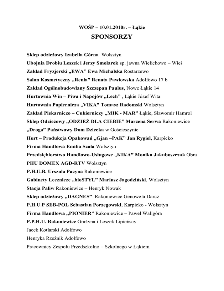 WOŚP – 10.01.2010r. – Łąkie SPONSORZY Sklep odzieżowy Izabella Górna Wolsztyn Ubojnia Drobiu Leszek i Jerzy Smolarek sp. jawna Wielichowo – Wieś Zakład Fryzjerski „EWA” Ewa Michalska Rostarzewo Salon Kosmetyczny „Renia” Renata Pawłowska Adolfowo 17 b Zakład Ogólnobudowlany Szczepan Paulus, Nowe Łąkie 14 Hurtownia Win – Piwa i Napojów „Lech” , Łąkie Józef Wita Hurtownia Papiernicza „VIKA” Tomasz Radomski Wolsztyn Zakład Piekarniczo – Cukierniczy „MIK - MAR” Łąkie, Sławomir Hamrol Sklep Odzieżowy „ODZIEŻ DLA CIEBIE” Marzena Serwa Rakoniewice „Droga” Państwowy Dom Dziecka w Gościeszynie Hurt – Produkcja Opakowań „Gjan –PAK” Jan Rygiel, Karpicko Firma Handlowa Emilia Szała Wolsztyn Przedsiębiorstwo Handlowo-Usługowe „KIKA” Monika Jakuboszczak Obra PHU DOMEX AGD-RTV Wolsztyn P.H.U.B. Urszula Pacyna Rakoniewice Gabinety Lecznicze „bioSTYL” Mariusz Jagodziński, Wolsztyn Stacja Paliw Rakoniewice – Henryk Nowak Sklep odzieżowy „DAGNES” Rakoniewice Genowefa Darcz P.H.U.P SEB-POL Sebastian Porzegowski, Karpicko - Wolsztyn Firma Handlowa „PIONIER” Rakoniewice – Paweł Waligóra P.P.H.U. Rakoniewice Grażyna i Leszek Lipieńscy Jacek Kotlarski Adolfowo Henryka Rzeźnik Adolfowo Pracownicy Zespołu Przedszkolno – Szkolnego w Łąkiem.