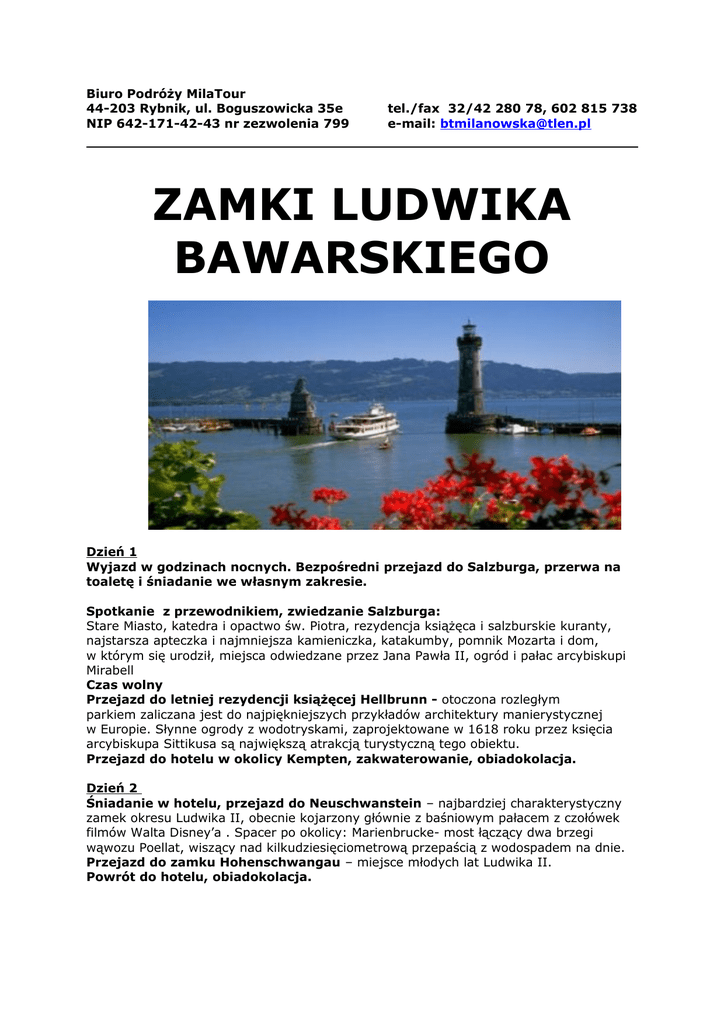 Biuro Podróży MilaTour 44-203 Rybnik, ul. Boguszowicka 35e NIP 642-171-42-43 nr zezwolenia 799 tel./fax 32/42 280 78, 602 815 738 e-mail: [email protected] ZAMKI LUDWIKA BAWARSKIEGO Dzień 1 Wyjazd w godzinach nocnych. Bezpośredni przejazd do Salzburga, przerwa na toaletę i śniadanie we własnym zakresie. Spotkanie z przewodnikiem, zwiedzanie Salzburga: Stare Miasto, katedra i opactwo św. Piotra, rezydencja książęca i salzburskie kuranty, najstarsza apteczka i najmniejsza kamieniczka, katakumby, pomnik Mozarta i dom, w którym się urodził, miejsca odwiedzane przez Jana Pawła II, ogród i pałac arcybiskupi Mirabell Czas wolny Przejazd do letniej rezydencji książęcej Hellbrunn - otoczona rozległym parkiem zaliczana jest do najpiękniejszych przykładów architektury manierystycznej w Europie. Słynne ogrody z wodotryskami, zaprojektowane w 1618 roku przez księcia arcybiskupa Sittikusa są największą atrakcją turystyczną tego obiektu. Przejazd do hotelu w okolicy Kempten, zakwaterowanie, obiadokolacja. Dzień 2 Śniadanie w hotelu, przejazd do Neuschwanstein – najbardziej charakterystyczny zamek okresu Ludwika II, obecnie kojarzony głównie z baśniowym pałacem z czołówek filmów Walta Disney’a . Spacer po okolicy: Marienbrucke- most łączący dwa brzegi wąwozu Poellat, wiszący nad kilkudziesięciometrową przepaścią z wodospadem na dnie. Przejazd do zamku Hohenschwangau – miejsce młodych lat Ludwika II. Powrót do hotelu, obiadokolacja. Dzień 3 Śniadanie w hotelu, przejazd do Linderhof – najmniejszego, pod względem architektonicznym, ale jednocześnie najbardziej uroczego zamku Ludwika Bawarskiego. Po południu przejazd kolejką na Zugspitze - najwyższy szczyt w Alpach, znajdujący się po stronie Niemiec. Spacer po uroczej alpejskiej miejscowości GarmischPartenkirchen – miejsce zawodów narciarskich w Turnieju Czterech skoczni. Powrót do hotelu, obiadokolacja. Dzień 4 Śniadanie w hotelu, przejazd malowniczym szlakiem nad Jeziorem Bodeńskim: Spacer po romantycznym miasteczku Meersburg, położonym u stóp Alp Szwajcarskich, otoczonym sadami i winnicami. Przeprawa promowa na Mainauwyspa kwiatów z niepowtarzalnym ogrodem botanicznym Powrót do hotelu, obiadokolacja. Dzień 5 Śniadanie w hotelu, przejazd do Monachium, zwiedzanie stolicy Bawarii: Olimpiapark – miejsce igrzysk olimpijskich z 1972 roku, Rezydencja Książąt Bawarskich, Ratusz, kościół NMP, kościół św. Michała. Przerwa na obiad i wyjazd w drogę powrotna do Polski. _______________________________________________________________ Cena: 1.290,00 zł/osoby (kalkulacja dla grupy minimum 40-osobowej) Cena • • • • zawiera: Transport autokarem Opłaty drogowe i parkingowe Pilot na całej trasie imprezy Przewodnik miejscowy • 4 noclegi • 4 śniadania • 5 obiadokolacje • Ubezpieczenie • Podatek VAT Bilety wstępu dodatkowo płatne ok. 60 euro/osoby.
