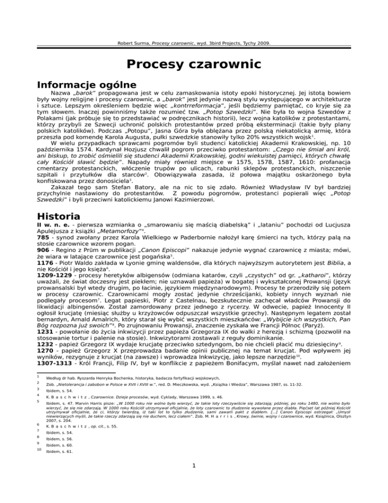 Robert Surma, Procesy czarownic, wyd. 3bird Projects, Tychy 2009. Procesy czarownic Informacje ogólne Nazwa „barok” propagowana jest w celu zamaskowania istoty epoki historycznej. Jej istotą bowiem były wojny religijne i procesy czarownic, a „barok” jest jedynie nazwą stylu występującego w architekturze i sztuce. Lepszym określeniem będzie więc „kontrreformacja”, jeśli będziemy pamiętać, co kryje się za tym słowem. Inaczej powinniśmy także rozumieć tzw. „Potop Szwedzki”. Nie była to wojna Szwedów z Polakami (jak próbuje się to przedstawiać w podręcznikach historii), lecz wojna katolików z protestantami, którzy przybyli ze Szwecji uchronić polskich protestantów przed próbą eksterminacji (takie były plany polskich katolików). Podczas „Potopu”, Jasna Góra była oblężana przez polską niekatolicką armię, która przeszła pod komendę Karola Augusta, pułki szwedzkie stanowiły tylko 20% wszystkich wojsk 1. W wielu przypadkach sprawcami pogromów byli studenci katolickiej Akademii Krakowskiej, np. 10 października 1574. Kardynał Hozjusz chwalił pogrom przeciwko protestantom: „Czego nie śmiał ani król, ani biskup, to zrobić ośmielili się studenci Akademii Krakowskiej, godni wiekuistej pamięci, których chwałę cały Kościół sławić będzie”. Napady miały również miejsce w 1575, 1578, 1587, 1610: profanacja cmentarzy protestanckich, włóczenie trupów po ulicach, rabunki sklepów protestanckich, niszczenie szpitali i przytułków dla starców 2. Obowiązywała zasada, iż połowa majątku oskarżonego była konfiskowana przez donosiciela3. Zakazał tego sam Stefan Batory, ale na nic to się zdało. Również Władysław IV był bardziej przychylnie nastawiony do protestantów. Z powodu pogromów, protestanci popierali więc „Potop Szwedzki” i byli przeciwni katolickiemu Janowi Kazimierzowi. Historia II w. n. e. - pierwsza wzmianka o „smarowaniu się maścią diabelską” i „lataniu” pochodzi od Lucjusza Apulejusza z książki „Metamorfozy”4. 785 - synod zwołany przez Karola Wielkiego w Paderbornie nałożył karę śmierci na tych, którzy palą na stosie czarownice wzorem pogan. 906 - Regino z Prüm w publikacji „Canon Episcopi” nakazuje jedynie wygnać czarownicę z miasta; mówi, że wiara w latające czarownice jest pogańska 5. 1176 - Piotr Waldo zakłada w Lyonie gminę waldensów, dla których najwyższym autorytetem jest Biblia, a nie Kościół i jego księża6. 1209-1229 - procesy heretyków albigensów (odmiana katarów, czyli „czystych” od gr. „katharoi”, którzy uważali, że świat doczesny jest piekłem; nie uznawali papieża) w bogatej i wykształconej Prowansji (język prowansalski był wtedy drugim, po łacinie, językiem międzynarodowym). Procesy te przerodziły się potem w procesy czarownic. Czarownicami mogły zostać jedynie chrześcijanki, kobiety innych wyznań nie podlegały procesom7. Legat papieski, Piotr z Castelnau, bezskutecznie zachęcał władców Prowansji do likwidacji albingensów. Został zamordowany przez jednego z rycerzy. W odwecie, papież Innocenty II ogłosił krucjatę (miesiąc służby u krzyżowców odpuszczał wszystkie grzechy). Następnym legatem został bernardyn, Arnald Amalrich, który starał się wybić wszystkich mieszkańców: „Wybijcie ich wszystkich, Pan Bóg rozpozna już swoich”8. Po zrujnowaniu Prowansji, znaczenie zyskała we Francji Północ (Paryż). 1231 - powołanie do życia inkwizycji przez papieża Grzegorza IX do walki z herezją i schizmą (pozwolił na stosowanie tortur i palenie na stosie). Inkwizytorami zostawali z reguły dominikanie. 1232 - papież Grzegorz IX wydaje krucjatę przeciwko sztedyngom, bo nie chcieli płacić mu dziesięciny 9. 1270 - papież Grzegorz X przeprowadza badanie opinii publicznej na temat krucjat. Pod wpływem jej wyników, rezygnuje z krucjat (na zawsze) i wprowadza Inkwizycję, jako lepsze narzędzie 10. 1307-1313 - Król Francji, Filip IV, był w konflikcie z papieżem Bonifacym, myślał nawet nad założeniem 1 2 3 4 5 6 7 8 9 10 Według dr hab. Ryszarda Henryka Bochenka, historyka, badacza fortyfikacji wojskowych, Zob. „Nietolerancja i zabobon w Polsce w XVII i XVIII w.”, red. D. Mieczkowska, wyd. „Książka i Wiedza”, Warszawa 1987, ss. 11-32. Ibidem, s. 54. K. B a s c h w i t z , Czarownice. Dzieje procesów, wyd. Cyklady, Warszawa 1999, s. 46. Ibidem, s. 47. Marvin Harris pisze: „W 1000 roku nie wolno było wierzyć, że takie loty rzeczywiście się zdarzają; później, po roku 1480, nie wolno było wierzyć, że się nie zdarzają. W 1000 roku Kościół utrzymywał oficjalnie, że loty czarownic to złudzenie wywołane przez diabła. Pięćset lat później Kościół utrzymywał oficjalnie, że ci, którzy twierdzą, iż taki lot to tylko złudzenie, sami zawarli pakt z diabłem. [...] Canon Episcopi ostrzegał: „Umysł niewierzących myśli, że takie rzeczy zdarzają się nie duchem, lecz ciałem”. Zob. M. H a r r i s , Krowy, świnie, wojny i czarownice, wyd. Książnica, Olsztyn 2007, s. 204. K. B a s c h w i t z , op. cit., s. 55. Ibidem, s. 54. Ibidem, s. 56. Ibidem, s. 60. Ibidem, s. 61. 1 Robert Surma, Procesy czarownic, wyd. 3bird Projects, Tychy 2009. własnego kościoła państwowego. Uwolnił wielu więźniów z Prowansji i rozpoczął proces zakonu templariuszy (podlegali papieżowi) za pomocą swojej własnej Inkwizycji. Papież Bonifacy obłożył go klątwą. Po śmierci Bonifacego, papieżem został zależny od Filipa Klemens V, który przeniósł siedzibę papieską do Avinionu i dokończył proces templariuszy oskarżonych o: bałwochwalstwo, orgie, satanizm. Wielu spalono na stosie w Paryżu 11. Następny papież, Jan XXII, ma obsesję na punkcie czarów, napędza spiralę obłędu w Prowansji, szczególnie w Tuluzie. Oskarża ludzi o orgie szatańskie, czczenie czarnego kozła, latanie w powietrzu. 1350 - wytępienie sekty biczowników 