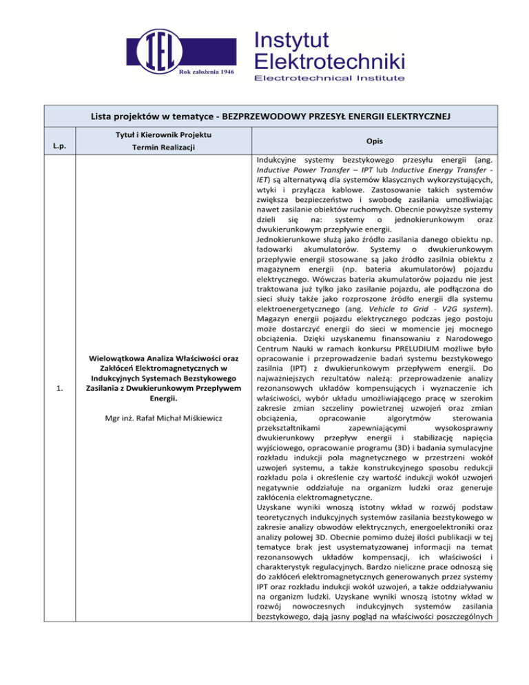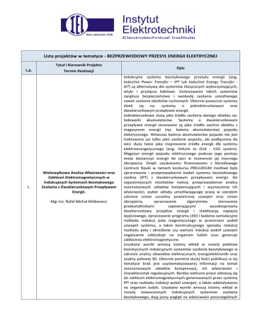 Lista projektów w tematyce - BEZPRZEWODOWY PRZESYŁ ENERGII ELEKTRYCZNEJ Tytuł i Kierownik Projektu L.p. 1. Termin Realizacji Wielowątkowa Analiza Właściwości oraz Zakłóceń Elektromagnetycznych w Indukcyjnych Systemach Bezstykowego Zasilania z Dwukierunkowym Przepływem Energii. Mgr inż. Rafał Michał Miśkiewicz Opis Indukcyjne systemy bezstykowego przesyłu energii (ang. Inductive Power Transfer – IPT lub Inductive Energy Transfer IET) są alternatywą dla systemów klasycznych wykorzystujących, wtyki i przyłącza kablowe. Zastosowanie takich systemów zwiększa bezpieczeństwo i swobodę zasilania umożliwiając nawet zasilanie obiektów ruchomych. Obecnie powyższe systemy dzieli się na: systemy o jednokierunkowym oraz dwukierunkowym przepływie energii. Jednokierunkowe służą jako źródło zasilania danego obiektu np. ładowarki akumulatorów. Systemy o dwukierunkowym przepływie energii stosowane są jako źródło zasilnia obiektu z magazynem energii (np. bateria akumulatorów) pojazdu elektrycznego. Wówczas bateria akumulatorów pojazdu nie jest traktowana już tylko jako zasilanie pojazdu, ale podłączona do sieci służy także jako rozproszone źródło energii dla systemu elektroenergetycznego (ang. Vehicle to Grid - V2G system). Magazyn energii pojazdu elektrycznego podczas jego postoju może dostarczyć energii do sieci w momencie jej mocnego obciążenia. Dzięki uzyskanemu finansowaniu z Narodowego Centrum Nauki w ramach konkursu PRELUDIUM możliwe było opracowanie i przeprowadzenie badań systemu bezstykowego zasilnia (IPT) z dwukierunkowym przepływem energii. Do najważniejszych rezultatów należą: przeprowadzenie analizy rezonansowych układów kompensujących i wyznaczenie ich właściwości, wybór układu umożliwiającego pracę w szerokim zakresie zmian szczeliny powietrznej uzwojeń oraz zmian obciążenia, opracowanie algorytmów sterowania przekształtnikami zapewniającymi wysokosprawny dwukierunkowy przepływ energii i stabilizację napięcia wyjściowego, opracowanie programu (3D) i badania symulacyjne rozkładu indukcji pola magnetycznego w przestrzeni wokół uzwojeń systemu, a także konstrukcyjnego sposobu redukcji rozkładu pola i określenie czy wartość indukcji wokół uzwojeń negatywnie oddziałuje na organizm ludzki oraz generuje zakłócenia elektromagnetyczne. Uzyskane wyniki wnoszą istotny wkład w rozwój podstaw teoretycznych indukcyjnych systemów zasilania bezstykowego w zakresie analizy obwodów elektrycznych, energoelektroniki oraz analizy polowej 3D. Obecnie pomimo dużej ilości publikacji w tej tematyce brak jest usystematyzowanej informacji na temat rezonansowych układów kompensacji, ich właściwości i charakterystyk regulacyjnych. Bardzo nieliczne prace odnoszą się do zakłóceń elektromagnetycznych generowanych przez systemy IPT oraz rozkładu indukcji wokół uzwojeń, a także oddziaływaniu na organizm ludzki. Uzyskane wyniki wnoszą istotny wkład w rozwój nowoczesnych indukcyjnych systemów zasilania bezstykowego, dają jasny pogląd na właściwości poszczególnych 2. Bezstykowy układ ładowania baterii superkondensatorów dla pojazdów o napędzie elektrycznym Dr inż. Artur Moradewicz elementów systemu oraz tworzą podstawę do metodycznego projektowania tych skomplikowanych systemów. Osoba do kontaktu: mgr inż. Rafał Miśkiewicz, email 1: [email protected] email 2: [email protected] Tel: 22 11 25 274. Poszukiwanie nowych rozwiązań dla systemów zasilania i ładowania magazynów energii jest przedmiotem badań w wielu jednostkach naukowo badawczych na świecie. Szczególnym zainteresowaniem cieszą się projekty związane z motoryzacją i ładowaniem/doładowywaniem baterii pojazdów elektrycznych. Coraz częściej podkreśla się też potrzebę, budowy bezstykowego systemu ładowania, ze względu na masową dostępność społeczeństwa do tych urządzeń w przyszłości. Stawia się przed nimi takie wymagania jak: bezpieczeństwo, ergonomia użytkowania i krótki czas ładowania baterii. Celem prac badawczych i rozwojowych był projekt i wykonanie modelu laboratoryjnego bezstykowego układu energoelektronicznego o mocy 25 kW do szybkiego ładowania baterii superkondensatorów pojazdów elektrycznych. System bezstykowego ładowania ze względu na swą budowę, strona pierwotna montowana przy stacji (np. ściana, podłoże) i wtórna zainstalowana na pojeździe, dodatkowa izolacja pomiędzy stroną pierwotną i wtórną oraz brak dostępu do przewodów wysokonapięciowych, zwiększa bezpieczeństwo i ergonomię stacji/punktu ładowania. Skrócenie czasu ładowania związane jest ze zwiększeniem mocy oraz prądu ładowania. Większy prąd ładowania to większy przekrój i ciężar przewodów zasilających. System zasilania bezstykowego w sposób naturalny rozwiązuje ten problem. Opracowano i wykonano model układu ładowania baterii superkondensatorów bazujący na bezstykowym przesyle energii poprzez sprzężenie indukcyjne o mocy do 25kW. System przyłączony jest do sieci 3x400V poprzez prostownik aktywny AC/DC/AC zasilający falownik rezonansowy. Przekształtnik wejściowy AC/DC/AC zapewnia sinusoidalny dwukierunkowy pobór oraz zwrot prądu do sieci energetycznej, przy cosϕ = 1. Przekształtnik wyjściowy systemu, zainstalowany po stronie wtórnej, zapewnia programowalne dopasowanie napięciowe do przyłączonego obciążenia. Przekształtniki systemu zbudowano na bazie tranzystorów półprzewodnikowych. Zastosowanie techniki rezonansowej oraz wysokich częstotliwości zapewnia wysokosprawny (ponad 90%) przesył energii nawet przy odległości uzwojenia wtórnego od pierwotnego rzędu 25 cm. Rozwiązanie takie zapewnia bezpieczeństwo, mobilność oraz redukcję ciężaru części ładowarki umieszczonej na pojeździe elektrycznym. Opracowany system Bezstykowego Przesyłu Energii zapewnia pod względem konstrukcyjnym separację galwaniczną pomiędzy odbiornikiem a siecią