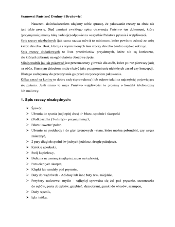 Szanowni Państwo! Druhny i Druhowie! Nauczeni doświadczeniem zdajemy sobie sprawę, że pakowanie rzeczy na obóz nie jest takie proste. Stąd zamiast zwykłego spisu otrzymują Państwo ten dokument, który (przynajmniej mamy taką nadzieje) odpowie na wszystkie Państwa pytania i wątpliwości. Spis rzeczy niezbędnych (jak sama nazwa mówi) to minimum, które powinno zabrać ze sobą każde dziecko. Brak, którejś z wymienionych tam rzeczy dziecko bardzo szybko odczuje. Spis rzeczy dodatkowych to lista przedmiotów przydatnych, które nie są konieczne, ale których zabranie na ogół ułatwia obozowe życie. Miniporadnik jak się pakować jest przeznaczony głownie dla osób, które po raz pierwszy jadą na obóz. Starszym dzieciom może służyć jako przypomnienie niektórych zasad czy koncepcji. Dlatego zachęcamy do przeczytania go przed rozpoczęciem pakowania. Kilka zasad na koniec to dobre rady (sprawdzone) lub odpowiedzi na najczęściej pojawiające się pytania. Jeśli mimo to maja Państwo wątpliwości to prosimy o kontakt telefoniczny lub mailowy. 1. Spis rzeczy niezbędnych: Śpiwór, Ubrania do spania (najlepiej dres) -> bluza, spodnie i skarpetki (Podkoszulki (T-shirty) – przynajmniej 5, Bluza i sweter/ polar, Ubranie na podchody i do gier terenowych –stare, które można pobrudzić, czy wręcz zniszczyć, 2 pary długich spodni (w jednych jedziesz, drugie pakujesz), Krótkie spodenki, Strój kąpielowy, Bielizna na zmianę (najlepiej zapas na tydzień), Para ciepłych skarpet, Klapki lub sandały pod prysznic, Buty do wędrówek - Adidasy lub inne buty tzw. miejskie, Przybory toaletowe: mydło - najlepiej sprawdza się żel pod prysznic, szczoteczka do zębów, pasta do zębów, grzebień, dezodorant, gumki do włosów, szampon, Duży ręcznik, Igła i nitka, Pełne umundurowanie -> bluza mundurowa, spódnica/ spodenki mundurowe, pas harcerski, beret z lilijką, chusta i suwak, pagony z piątkami i oznaczeniem stopni, sznur funkcyjny (kto posiada), getry. Nie dotyczy osób spoza ZHP. Krem do opalania z filtrem minimum 10, Nakrycie głowy do ochrony przed słońcem, Peleryna przeciwdeszczowa, Aktualna legitymacja szkolna, Latarka z kompletem baterii na zmianę, Chusteczki higieniczne (min. 4 paczki), Kurtka, Mały plecaczek na wędrówki, Prosimy o zwrócenie uwagi na spójniki. Jeśli występuje lub, oznacza to, że można zabrać którąś z tych rzeczy, i sygnalizuje obowiązek zabrania wszystkich wymienionych. 1. Spis rzeczy dodatkowych: Gumowce – chociaż zakładamy, że nie będzie padać. ☺ Kubek (nietłukący), menażkę lub miskę metalową, sztućce, Lina / sznurek, Kompas/ busola, Instrument muzyczny, Lusterko, Śpiewnik, Okulary przeciwsłoneczne, Kieszonkowe (sugerujemy kwotę nie większą niż 80zł), Zeszyt, coś do pisania, Krem po opalaniu, Piórnik z wyposażeniem. 3. Miniporadnik jak się pakować: 1. Dziecko powinno brać udział w pakowaniu i samo wkładać rzeczy – unika się wtedy problemów z pakowaniem na obozie, to co rodzice ułożyli w plecaku nie mieści się gdy dziecko samo się pakuje... Zdążają się również sytuacje, że dziecko nie rozpoznaje, że dana rzecz należy do niego. 2. Pieniądze najlepiej podzielić na mniejsze kwoty i schować w kilku miejscach. 3. Poleca się zrobienie listy spakowanych rzeczy, którą następnie zabiera się na obóz. Ułatwia to pakowanie na koniec obozu. 4. Na dół plecaka powinny trafić najcięższe i największe rzeczy. Do samego dna i pleców plecaka powinno przylegać coś miękkiego (np. polar, sweter). Inaczej kanciaste przedmioty będą się wbijać podczas marszu (plecy) lub podziurawią materiał (spód). 5. Należy zadbać o równomierne rozłożenie ciężaru. Ciężki przedmiot położony na przedniej ścianie plecaka (nie przy plecach) powoduje odchylanie osoby do tyłu. Nosząc plecak człowiek samorzutnie powinien pochylać się do przodu, przekładając ciężar na biodra. 6. Rzeczy drobne i przydatne należy spakować do kieszeni lub ułożyć na samej górze plecaka. 7. Rzeczy ciężkie, ale o niedużych gabarytach dobrze spakować w środku (pomiędzy śpiworem, a kubeczkiem ;)). 8. Dobrym rozwiązaniem jest spakowanie małych, łatwo ulegających uszkodzeniom przedmiotów do małego plecaka (podręcznego), 9. W kubku lub menażce istnieje tzw. martwa przestrzeń. Można ją wykorzystać na zapakowanie choćby kilku par skarpetek czy igły z nitką. 10. Dobrym zwyczajem jest pakowanie rzeczy ulęgających zamoczeniu/ zabrudzeniu w worki lub siatki. Nikt nie zamierza trzymać ubrania nie na półkach, ale można wyobrazić sobie sytuacje, że niechcący ktoś straci stertę ubrań na ziemię... Opcja tania – zapakować takie rzeczy w worki na śmieci, opcja droższa ale pewniejsza - duże foliowe worki z zapięciem strunowym (duży rozmiar w sam raz na stertę ubrań – 6 worków kosztuje ok. 5 zł). 11. Liny/ sznurka można użyć do przytroczenia czegoś na zewnątrz plecaka (np. pałatki, butów). Ważne jest, aby taki przedmiot był umiejscowiony albo na górze plecaka, albo pod nim lub z boku. Jeśli wybieramy ostatnią opcję to należy zadbać o przytroczenie czegoś dla przeciwwagi z drugiej strony. Tak aby było spełnione podkreślenie z punktu nr 5. 12. Mundur (jako bluza i spódnica/ spodenki) najlepiej pąkować na samej górze, na nim mały ręcznik i dopiero drobne, lekkie przedmioty. Nic tak się nie mnie jak mundur... 13. Co możesz spakuj na siebie. Bierzesz bojówki? Zapakuj coś do ich kieszeni, załóż pas harcerski. I oczywiście ubierz je na siebie w dniu wyjazdu. ☺ 14. Dobrze zapakowany plecak powinien albo stać (bez podpierania) lub lekko przechylać się w stronę szelek. Jeśli tak nie jest należy zmienić układ rzeczy. 15. Jeśli plecak ma regulacje należy go wyregulować dopiero po spakowaniu. Najpierw poluzuj wszystkie paski i szelki. Potem wyregulujemy rozstaw (wysokość) szelek do wzrostu (tylko niektóre plecaki maja tak
