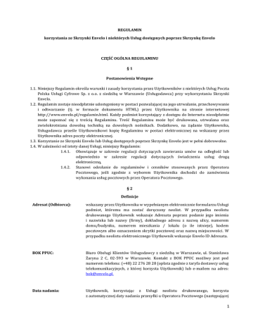 REGULAMIN korzystania ze Skrzynki Envelo i niektórych Usług dostępnych poprzez Skrzynkę Envelo CZĘŚĆ OGÓLNA REGULAMINU §1 Postanowienia Wstępne 1.1. Niniejszy Regulamin określa warunki i zasady korzystania przez Użytkowników z niektórych Usług Poczta Polska Usługi Cyfrowe Sp. z o.o. z siedzibą w Warszawie (Usługodawca) przy wykorzystaniu Skrzynki Envelo. 1.2. Regulamin zostaje nieodpłatnie udostępniony w postaci pozwalającej na jego utrwalanie, przechowywanie i odtwarzanie (tj. w formacie dokumentu HTML) przez Użytkownika na stronie internetowej http://www.envelo.pl/regulamin.html. Każdy podmiot korzystający z dostępu do Internetu nieodpłatnie może zapoznać się z treścią Regulaminu. Treść Regulaminu może być drukowana, utrwalana oraz zwielokrotniana dowolną techniką na dowolnych nośnikach. Dodatkowo, na żądanie Użytkownika, Usługodawca prześle Użytkownikowi kopię Regulaminu w postaci elektronicznej na wskazany przez Użytkownika adres poczty elektronicznej. 1.3. Korzystanie ze Skrzynki Envelo lub Usług dostępnych poprzez Skrzynkę Envelo jest w pełni dobrowolne. 1.4. W zależności od istoty danej Usługi, niniejszy Regulamin: 1.4.1. Obowiązuje w zakresie regulacji dotyczących zawierania umów na odległość lub odpowiednio w zakresie regulacji dotyczących świadczenia usług drogą elektroniczną, 1.4.2. Stanowi odesłanie do regulaminów i cenników stosowanych przez Operatora Pocztowego, jeśli zgodnie z wyborem Użytkownika dochodzi do zamówienia wykonania usług pocztowych przez Operatora Pocztowego. §2 Definicje Adresat (Odbiorca): wskazany przez Uzytkownika w wypełnianym elektronicznie formularzu Usługi podmiot, ktoremu ma zostac doręczony neolist. W przypadku neolistu drukowanego Uzytkownik wskazuje Adresata poprzez podanie jego imienia i nazwiska lub nazwy (firmy), dokładnego adresu z nazwą ulicy, numerem domu/budynku, numerem mieszkania / lokalu (o ile istnieje), kodem pocztowym albo oznaczeniem skrytki pocztowej oraz nazwą miejscowosci. W przypadku neolistu elektronicznego Uzytkownik wskazuje Envelo ID Adresata. BOK PPUC: Biuro Obsługi Klientów Usługodawcy z siedzibą w Warszawie, ul. Stanisława Żaryna 2 C, 02-593 w Warszawie. Kontakt z BOK PPUC możliwy jest pod numerem telefonu: (+48) 22 276 28 28 (opłata zgodnie z taryfa dostawcy usług telekomunikacyjnych, z której korzysta Użytkownik) lub e-mailem na adres: [email protected]. Data nadania: Użytkownik, korzystając z Usługi neolistu drukowanego, korzysta z automatycznej daty nadania przesyłki u Operatora Pocztowego (następującej 1 w ciągu dwóch dni roboczych po dniu zawarcia Umowy o Usługę Neolistu drukowanego). Zawierając Umowę o Usługę Neolistu drukowanego Użytkownik będący Konsumentem wyraża zgodę na wykonanie przez Usługodawcę Usługi Neolistu drukowanego przed upływem 14-dniowego terminu na odstąpienie przez Konsumenta od umowy zawieranej na odległość i tym samym rezygnuje z ustawowego prawa do odstąpienia od Umowy o Usługę Neolistu drukowanego, (jeśli takie prawo mu przysługuje). Dane Użytkownika: wszelkie dane tekstowe, graficzne, zdjęcia, w tym również dane osobowe, które Użytkownik przetwarza w ramach korzystania ze Skrzynki Envelo lub wprowadza w trakcie zamawiania Usługi (zakupu neolistu) np. dane Adresata lub jako nadawcy wpisywane w wypełnianym elektronicznie formularzu Usługi Neolistu dostępnym w ramach Skrzynki Envelo lub dane Użytkownika w ramach Mojego Konta. Envelo (lub Platforma Envelo): prowadzona przez Usługodawcę platforma internetowa (w tym również webserwisy), w postaci zorganizowanego systemu teleinformatycznego (w rozumieniu regulacji dotyczących świadczenia usług drogą elektroniczną, obejmującego w szczególności sprzęt komputerowy, serwery, urządzenia peryferyjne, oprogramowanie i treści / content), utrzymywana przez Usługodawcę oraz dostępna pod adresem internetowym http://www.envelo.pl, w ramach, której Użytkownik może korzystać ze Skrzynki Envelo oraz dostępna jest m.in. Usługa neolistu. Envelo ID: indywidualny, dziewięciocyfrowy numer nadawany w sposób zautomatyzowany każdemu Użytkownikowi Skrzynki Envelo podczas jej zakładania (aktywowania) przez Użytkownika. Envelo ID jest jednocześnie identyfikatorem Użytkownika i jego adresem wirtualnym na Platformie Envelo. Moje Konto: funkcjonalna część Skrzynki Envelo współtworząca elektroniczny profil Użytkownika na Envelo, w ramach której Użytkownik podaje (oraz odpowiednio modyfikuje zgodnie ze stanem faktycznym) swoje podstawowe dane identyfikujące Użytkownika. Konto Zaufane: Skrzynka Envelo Użytkownika, którego tożsamość została potwierdzona, dzięki weryfikacji danych i dokumentów urzędowych potwierdzających status danego podmiotu (w placówce Poczty Polskiej S.A. lub przez uprawnionego Pracownika Usługodawcy lub podmiotu z Grupy Kapitałowej Poczty Polskiej S.A.). W wyniku weryfikacji, Envelo ID zostaje w sposób potwierdzony powiązane z danym podmiotem, tworząc internetową tożsamość danego Użytkownika Konta Zaufanego. W szczególności kontaktując się z Użytkownikiem Konta Zaufanego ma się pewność, że jego tożsamość została potwierdzona. Jeden podmiot może mieć jedno Konto Zaufane, przy czym osoba fizyczna może założyć Konto Zaufane dla siebie jako Konsumenta oraz drugie Konto Zaufane dla siebie jako 2 Przedsiębiorcy, jeśli prowadzi działalność gospodarczą (z odpowiednio innymi danymi podawanymi w ramach Mojego Konta każdej ze Skrzynek Envelo). Usługa neolistu: usługa polegająca na przygotowaniu przez Użytkownika zalogowanego do Skrzynki Envelo treści neolistu w wersji elektronicznej na Envelo, a następnie nadaniu jej do Adresata zgodnie z dyspozycją Użytkownika: w wersji elektronicznej w ramach Platformy Envelo lub drukowanej u Operatora Pocztowego. Usługodawca informuje, ze w zaleznosci od wyboru dokonanego przez Uzytkownika w trakcie wypełnia