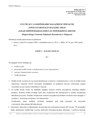 GCEZ w Głogowie Załącznik Nr 3 do Zarządzenia Nr 01/06 /2012 z dnia 18. czerwca 2012 roku Dyrektora GCEZ I NS TR UK C J A GOSPODARKI MAJĄTKIEM TRWAŁYM, INWENATARYZACJI MAJĄTKU ORAZ ZASAD ODPOWIEDZIALNOŚCI ZA POWIERZONE MIENIE Głogowskiego Centrum Edukacji Zawodowej w Głogowie Instrukcja została opracowana na podstawie: 1. ustawy z dnia 29 września 1994r. o rachunkowości (j.t. Dz.U. z 2002r. Nr 76, poz. 694 z późn. zm.). CZĘŚĆ I – ZASADY OGÓLNE §1 Na majątek GCEZ składają się: środki trwałe, pozostałe środki trwałe w użytkowaniu (w tym wyposażenie), wartości niematerialne i prawne, środki pieniężne. 1. Środki trwałe wycenia się wg zasad określonych w ustawie o rachunkowości, z tym że środki trwałe stanowiące własność GCEZ otrzymane nieodpłatnie na podstawie decyzji właściwego organu wyceniane są wg wartości określonej w decyzji. 2. Za środki trwałe uważa się składniki majątku, których wartość początkową określają odrębne przepisy. Wartość środka trwałego może być zwiększona lub zmniejszona w wyniku zarządzanej aktualizacji wyceny. Ponadto zwiększenie wartości początkowej środków trwałych może nastąpić w związku z inwestycją związaną z ich ulepszeniem. Zwiększenie stanu środków trwałych następuje pod datą przyjęcia do używania z inwestycji, datą zakupu lub datą decyzji. 3. Ujawnione nadwyżki ewidencjonuje się pod datą ich zinwentaryzowania lub wyceny. W przypadku braku dokumentu źródłowego wycenę nadwyżki inwentaryzacyjnej dokonuje 3 osobowa komisja N.Ż. Instrukcja gospodarki majątkiem trwałym, inwentaryzacji majątku oraz zasad odpowiedzialności za powierzone mienie 1 GCEZ w Głogowie powołana przez Dyrektora jednostki. W skład komisji powinna wchodzić co najmniej jedna osoba posiadająca wiedzę branżową. 4. Umorzenie środków trwałych zgodnie ze stawkami amortyzacyjnymi określonymi w ustawie z dnia 15.02.1992r. o podatku dochodowym od osób prawnych księgowane jest na koniec każdego roku budżetowego. Grunty nie podlegają umorzeniu. Ewidencja środków trwałych prowadzona jest za pomocą programu komputerowego „Inwentarz Optivum”. Środki trwałe, WNiP oraz pozostałe środki trwałe i wyposażenie w używaniu wycenia się wg cen 5. zakupu brutto (łącznie z podatkiem VAT). 6. Pozostałe środki trwałe o wartości nie przekraczającej wielkości stanowiącej dolną granicę środka trwałego umarza się w pełnej wartości poprzez spisanie w koszty w miesiącu przyjęcia do używania. Ewidencją ilościowo-wartościową obejmuje się środki trwałe (wyposażenie), których dolną granicę 7. ustala się w wysokości 400 zł. Bez względu na wartość, ewidencją ilościowo-wartościową obejmuje się składniki majątkowe zaliczone do pozostałych środków trwałych dotyczące: Środki dydaktyczne Odzież i umundurowanie (normatywny okres używania dłuższy niż 1 rok) Meble i dywany 8. Dla zestawów komputerowych, drukarek, skanerów, aparatów fotograficznych i kamer, zestawów nagłaśniających itp. wskazuje się osobę odpowiedzialną za użytkowany sprzęt za pomocą programu komputerowego Inwentarz. 9. Faktury i rachunki na podstawie których dokonano zakupu pozostałych środków trwałych (wyposażenia) winny być dokładnie opisane z podaniem użytkownika i zawierające klauzulę „wpisano do ewidencji programu …………., osoba odpowiedzialna ……… ”. 10. Zakupione książki dla celów dydaktycznych podlegają ewidencji w bibliotece. N.Ż. Instrukcja gospodarki majątkiem trwałym, inwentaryzacji majątku oraz zasad odpowiedzialności za powierzone mienie 2 GCEZ w Głogowie CZĘŚĆ II – ODPOWIEDZIALNOŚĆ ZA SKŁADNIKI MIENIA §1 1. Odpowiedzialność za należyte zabezpieczenie majątku GCEZ ponosi Dyrektor jednostki lub inna osoba upoważniona przez Dyrektora, na którym również ciąży obowiązek nadzoru nad właściwą eksploatacją majątku i zabezpieczeniem go przed kradzieżą i zniszczeniem. 2. Odpowiedzialność za właściwą eksploatację i ochronę składników majątkowych w czasie godzin pracy ponoszą pracownicy, których pieczy składniki te powierzono w związku z zajmowanym stanowiskiem. §2 1. Pozostałe środki trwałe objęte ewidencją ilościowo – wartościową wyposażenia biurowego winny być przypisane do każdego pomieszczenia z osobna i ujęte w spisie inwentarzowym. 2. Spis inwentarzowy, oprócz nazwy pomieszczenia, powinien określać rodzaj, ilość składników wyposażenia, ich numer inwentarzowy (dot. majątku podlegającego ewidencji ilościowowartościowej oraz wyposażenia o niskiej wartości). Spis inwentarzowy umieszcza się w widocznym miejscu w formie wykazu) w każdym pomieszczeniu (wzór załącznik 1) 3. Wszelkie zmiany w stanie wyposażenia danego pomieszczenia biurowego lub innego mogą nastąpić za wiedzą: Dyrektora GCEZ, osoby upoważnionej przez dyrektora do nadzoru nad właściwą eksploatacją majątku. Zgłoszenie zmian odbywa się w formie pisemnej. Zmiany te każdorazowo powinny być odnotowane w spisie inwentarzowym i w przypadku zmian w środkach trwałych lub środkach trwałych pozostałych w używaniu – powinny być zgłoszone do księgowości. §3 1. Pracownikom GCEZ może być powierzony na podstawie dowodu „OT, PT lub MT” sprzęt biurowy do użytku indywidualnego. Otrzymując taki sprzęt pracownik podpisuje oświadczenie o odpowiedzialności materialnej za powierzone mu mienie i zobowiązuje się do jego zwrotu gdy N.Ż. Instrukcja gospodarki majątkiem trwałym, inwentaryzacji majątku oraz zasad odpowiedzialności za powierzone mienie 3 GCEZ w Głogowie ustanie potrzeba jego użytkowania (załącznik nr 0). Oświadczenie te przechowuje się w aktach osobowych oraz w księgowości (kserokopia). 2. Obowiązkiem pracowników, z którymi rozwiązywany jest stosunek pracy jest uzyskanie adnotacji na karcie obiegowej dostępnej w dziale kadr. §4 1. Dyrektor GCEZ