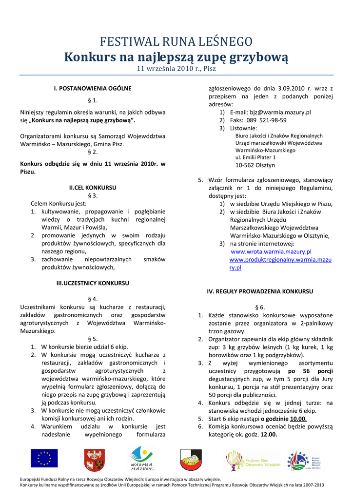 FESTIWAL RUNA LEŚNEGO Konkurs na najlepszą zupę grzybową 11 września 2010 r., Pisz I. POSTANOWIENIA OGÓLNE § 1. Niniejszy regulamin określa warunki, na jakich odbywa się „Konkurs na najlepszą zupę grzybową”. zgłoszeniowego do dnia 3.09.2010 r. wraz z przepisem na jeden z podanych poniżej adresów: 1) E-mail: [email protected] 2) Faks: 089 521-98-59 3) Listownie: Organizatorami konkursu są Samorząd Województwa Warmińsko – Mazurskiego, Gmina Pisz. § 2. Biuro Jakości i Znaków Regionalnych Urząd marszałkowski Województwa Warmińsko-Mazurskiego ul. Emilii Plater 1 Konkurs odbędzie się w dniu 11 września 2010r. w Piszu. 10-562 Olsztyn II.CEL KONKURSU § 3. Celem Konkursu jest: 1. kultywowanie, propagowanie i pogłębianie wiedzy o tradycjach kuchni regionalnej Warmii, Mazur i Powiśla, 2. promowanie jedynych w swoim rodzaju produktów żywnościowych, specyficznych dla naszego regionu, 3. zachowanie niepowtarzalnych smaków produktów żywnościowych, 5. Wzór formularza zgłoszeniowego, stanowiący załącznik nr 1 do niniejszego Regulaminu, dostępny jest: 1) w siedzibie Urzędu Miejskiego w Piszu, 2) w siedzibie Biura Jakości i Znaków Regionalnych Urzędu Marszałkowskiego Województwa Warmińsko-Mazurskiego w Olsztynie, 3) na stronie internetowej: www.wrota.warmia.mazury.pl www.produktregionalny.warmia.mazu ry.pl III.UCZESTNICY KONKURSU IV. REGUŁY PROWADZENIA KONKURSU § 4. Uczestnikami konkursu są kucharze z restauracji, zakładów gastronomicznych oraz gospodarstw agroturystycznych z Województwa WarmińskoMazurskiego. § 5. 1. W konkursie bierze udział 6 ekip. 2. W konkursie mogą uczestniczyć kucharze z restauracji, zakładów gastronomicznych i gospodarstw agroturystycznych z województwa warmińsko-mazurskiego, które wypełnią formularz zgłoszeniowy, dołączą do niego przepis na zupę grzybową i zaprezentują ją podczas konkursu. 3. W konkursie nie mogą uczestniczyć członkowie komisji konkursowej ani ich rodzin. 4. Warunkiem udziału w konkursie jest nadesłanie wypełnionego formularza § 6. 1. Każde stanowisko konkursowe wyposażone zostanie przez organizatora w 2-palnikowy trzon gazowy. 2. Organizator zapewnia dla ekip główny składnik zup: 3 kg grzybów leśnych (1 kg kurek, 1 kg borowików oraz 1 kg podgrzybków). 3. Z wyżej wymienionego asortymentu uczestnicy przygotowują po 56 porcji degustacyjnych zup, w tym 5 porcji dla Jury konkursu, 1 porcja na stół prezentacyjny oraz 50 porcji dla publiczności. 4. Konkurs odbędzie się w jednej turze: na stanowiska wchodzi jednocześnie 6 ekip. 5. Start 6 ekip nastąpi o godzinie 10.00. 6. Komisja konkursowa oceniać będzie powyższą kategorię ok. godz. 12.00. Europejski Fundusz Rolny na rzecz Rozwoju Obszarów Wiejskich: Europa inwestująca w obszary wiejskie. Konkursy kulinarne współfinansowane ze środków Unii Europejskiej w ramach Pomocy Technicznej Programu Rozwoju Obszarów Wiejskich na lata 2007-2013 7. Czas przeznaczony na przygotowanie zupy grzybowej wynosi 120 minut 8. Czas na rozłożenie produktów i drobnego sprzętu oraz dekoracje stanowisk konkursowych nie będzie liczony przez Jurorów do przygotowywania dań konkursowych. 9. Drobny sprzęt kuchenny potrzebny do wykonania dań konkursowych, deski, miski, garnki, zastawę potrzebną do podania potraw każda ekipa przywozi ze sobą. 10. Ogłoszenie wyników konkursów nastąpi ok. godziny 16.00. 11. Każda ekipa może swoją zupę dowolnie wzbogacić dodatkami używanymi w Kuchni polskiej. 12. Wszystkie stanowiska zostaną ustawione przed publicznością zaproszoną na Konkurs w celu zaprezentowania pełnego kunsztu występujących Kucharzy. Dlatego też każda ekipa powinna efektownie się zaprezentować zarówno, jeśli chodzi o wygląd kucharzy, jak i swojego stanowiska. 13. Wszystkie ekipy powinny wystawić nazwy swoich dań konkursowych w formie „stołowego standu”, zawierającego również nazwę restauracji lub zakładu gastronomicznego. § 7. Decyzje komisji są wiążące i ostateczne. V. NAGRODY § 8. 1. Nagroda Główna: 1) PUCHAR WOJEWÓDZTWA konkursu 2. Sprzęt gastronomiczny: • I miejsce - sprzęt wartości 800 zł brutto, • II miejsce - sprzęt wartości 500 zł brutto, • III miejsce - sprzęt wartości 300 zł brutto, MARSZAŁKA – dla zwycięzcy gastronomiczny o gastronomiczny o gastronomiczny o VI. POSTANOWIENIA KOŃCOWE § 9. Udział w konkursie oznacza wyrażenie zgody na przetwarzanie danych osobowych (imię, nazwisko, adres) i publikację, bez odrębnego wynagrodzenia, zgłoszonych do konkursu przepisów oraz zdjęć potraw konkursowych. § 10. Informacje o nagrodzonych i ich produktach zostaną opublikowane w regionalnych mediach, na stronie internetowej Urzędu Gminy Pisz, na stronie internetowej Urzędu Marszałkowskiego Województwa Warmińsko-Mazurskiego w Olsztynie. § 11. Komisja konkursowa zostanie powołana przez organizatorów konkursu. § 12. Organizatorzy nie zwracają kosztów podróży oraz kosztów dodatkowych produktów potrzebnych do wykonania dań konkursowych. Europejski Fundusz Rolny na rzecz Rozwoju Obszarów Wiejskich: Europa inwestująca w obszary wiejskie. Konkursy kulinarne współfinansowane ze środków Unii Europejskiej w ramach Pomocy Technicznej Programu Rozwoju Obszarów Wiejskich na lata 2007-2013