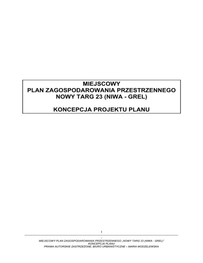 MIEJSCOWY PLAN ZAGOSPODAROWANIA PRZESTRZENNEGO NOWY TARG 23 (NIWA - GREL) KONCEPCJA PROJEKTU PLANU 1 ------------------------------------------------------------------------------------------------------------------------------------------------------------------------MIEJSCOWY PLAN ZAGOSPODAROWANIA PRZESTRZENNEGO „NOWY TARG 23 (NIWA - GREL)” KONCEPCJA PLANU PRAWA AUTORSKIE ZASTRZEŻONE, BIURO URBANISTYCZNE – MARIA MODZELEWSKA NOWY SĄCZ – GRUDZIEŃ 2010 Generalny projektant: mgr inż. arch. Maria Modzelewska Z-ca generalnego projektanta: mgr inż. arch. Katarzyna Salabura Zespół projektowy: mgr inż. Jadwiga Buchta mgr inż. Marcin Golonka mgr inż. arch. Joanna Paradowska – Prusak mgr inż. arch. Kamila Małecka mgr inż. Małgorzata Gołaszewska Opracowania graficzne: tech. Joanna Król mgr inż. arch. Joanna Paradowska – Prusak mgr inż. arch. Agnieszka Kałwa mgr inż. Marcin Duda 2 ------------------------------------------------------------------------------------------------------------------------------------------------------------------------MIEJSCOWY PLAN ZAGOSPODAROWANIA PRZESTRZENNEGO „NOWY TARG 23 (NIWA - GREL)” KONCEPCJA PLANU PRAWA AUTORSKIE ZASTRZEŻONE, BIURO URBANISTYCZNE – MARIA MODZELEWSKA I. CHARAKTERYSTYKA OBSZARU Obszar objęty analizą obejmuje teren położony w zachodniej części miasta, zawierający się pomiędzy ulicą Krakowską w ciągu drogi krajowej Nr 47, zachodnią granicą administracyjną miasta oraz rzeką Czarny Dunajec. Analizowany obszar obejmuje tereny, które poza częścią wschodnią obejmującą tereny położone wzdłuż ul. Krakowskiej oraz na osiedlu Niwa i częścią południową położoną przy ul. Starokrakowskiej, Grel i Partyzantów są w chwili obecnej niezainwestowane. Większość terenu, zajmują grunty rolne, użytkowane głównie jako trwałe użytki zielone. Z północnego wschodu na południowy - zachód przepływają przez obszar objęty analizą dwa strumienie stanowiące dopływy Czarnego Dunajca, stanowiącego północną granicą planu. Zabudowę w obszarze objętym opracowaniem w ww. terenach, położoną wzdłuż ul. Krakowskiej oraz na osiedlu Niwa i w części południowej położonej przy ul. Grel i Partyzantów, stanowi przede wszystkim zabudowa mieszkaniowa jednorodzinna. W północno- zachodniej części obszaru objętego analizą, istniejące skupiska zabudowy stanowi natomiast zabudowa zagrodowa. Na zlokalizowanym w północno – wschodniej części obszaru osiedlu Niwa zlokalizowana jest Szkoła Podstawowa z salą gimnastyczną (w budowie) oraz Kościół parafialny. Ponadto na obszarze opracowania występują usługi publiczne takie jak: niewielka, niedostosowana do potrzeb szkoła podstawowa nr 4 przy ulicy Krakowskiej i biblioteka publiczna oraz specjalistyczne centrum dentystyczne. Usługi komercyjne występujące na obszarze objętym opracowaniem planu, to wbudowane usługi podstawowe oraz usługi handlu, gabinety lekarskie, skład materiałów budowlanych zakład ślusarski, zakład stolarski, stacje obsługi samochodów (myjnie samochodowe, stacja napraw, usługi blacharskie) oraz stacja paliw przy wjeździe do miasta, przy ulicy Krakowskiej. Problemem jest położona nad Dunajcem – funkcjonująca od lat garbarnia. Dostęp do terenu następuje z ulicy Krakowskiej w ciągu drogi krajowej istniejącymi zjazdami prowadzącymi na ul. Grel oraz ulicami bez nazwy na osiedlu Niwa. Wewnątrz obszaru objętego analizą obsługę komunikacyjną terenów zainwestowanych zapewniają ulice Grel, Partyzantów, ulice bez nazw o nawierzchni bitumicznej oraz drogi gruntowe. Parametry wszystkich ww. ulic gminnych i dróg wewnętrznych nie pozwalają na płynny ruch, a większość z nich jest w złym stanie technicznym. Przez zachodnią część obszaru opracowania przebiega linia kolejowa nr 99 Kraków Chabówka – Zakopane, która w Rozporządzeniu Rady Ministrów z 20.03.2007r zaliczona została do linii o znaczeniu państwowym. Tereny zainwestowane są zelektryfikowane, a infrastrukturę w zakresie gospodarki wodno – ściekowej posiadają tereny w rejonie ulic Krakowskiej, Starokrakowskiej, Partyzantów, Grel Boczna i Grel (rurociąg tranzytowy z Ludźmierza) oraz na części osiedla Niwa. 3 ------------------------------------------------------------------------------------------------------------------------------------------------------------------------MIEJSCOWY PLAN ZAGOSPODAROWANIA PRZESTRZENNEGO „NOWY TARG 23 (NIWA - GREL)” KONCEPCJA PLANU PRAWA AUTORSKIE ZASTRZEŻONE, BIURO URBANISTYCZNE – MARIA MODZELEWSKA II. KONCEPCJA ZAGOSPODAROWANIA OBSZARU W Koncepcji uwzględniono następujące opracowania: Analizy poprzedzające prace planistyczne; Aneks do opracowania ekofizjograficznego; Inwentaryzację terenową zainwestowania i uzbrojenia; Uwarunkowanie zagospodarowania przestrzennego; Koncepcję drogową układu komunikacyjnego wraz z infrastrukturą techniczną; 6. Analizę krajobrazową; 7. Rejestr własności; 8. Rejestr wniosków. 1. 2. 3. 4. 5. Koncepcja zakłada utrzymanie na Niwie zabudowy mieszkaniowej i stworzenie warunków dla powstania dzielnicy o średniej intensywności zabudowy, z dominującymi terenami mieszkalnictwa jednorodzinnego, zgodnie z ustaleniami Studium. Przy istniejącej drodze krajowej – ul. Krakowska, zakłada się realizację nowych usług, z uwagi na długo jeszcze odczuwaną uciążliwość drogi. Przyjmuje się utrzymanie istniejącej zabudowy zagrodowej oraz usług publicznych i komercyjnych, dopuszczając w terenach zabudowy mieszkaniowej realizację usług wbudowanych, zgodnie z ustawą Prawo Budowlane oraz usług hotelarskich, realizowanych jako budownictwo pensjonatowe. W większości terenów dopuszcza się również lokalizację obiektów drobnej wytwórczości realizowanych jako warsztaty rzemieślnicze. Z uwagi na położenie większości obszarów US – terenów sportu i rekreacji w terenach zalewowych, rezygnuje się z ich zagospodar