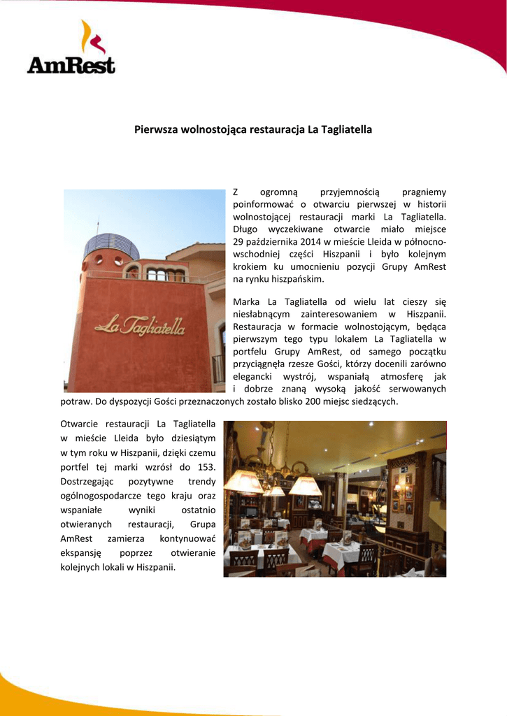 Pierwsza wolnostojąca restauracja La Tagliatella Z ogromną przyjemnością pragniemy poinformować o otwarciu pierwszej w historii wolnostojącej restauracji marki La Tagliatella. Długo wyczekiwane otwarcie miało miejsce 29 października 2014 w mieście Lleida w północnowschodniej części Hiszpanii i było kolejnym krokiem ku umocnieniu pozycji Grupy AmRest na rynku hiszpańskim. Marka La Tagliatella od wielu lat cieszy się niesłabnącym zainteresowaniem w Hiszpanii. Restauracja w formacie wolnostojącym, będąca pierwszym tego typu lokalem La Tagliatella w portfelu Grupy AmRest, od samego początku przyciągnęła rzesze Gości, którzy docenili zarówno elegancki wystrój, wspaniałą atmosferę jak i dobrze znaną wysoką jakość serwowanych potraw. Do dyspozycji Gości przeznaczonych zostało blisko 200 miejsc siedzących. Otwarcie restauracji La Tagliatella w mieście Lleida było dziesiątym w tym roku w Hiszpanii, dzięki czemu portfel tej marki wzrósł do 153. Dostrzegając pozytywne trendy ogólnogospodarcze tego kraju oraz wspaniałe wyniki ostatnio otwieranych restauracji, Grupa AmRest zamierza kontynuować ekspansję poprzez otwieranie kolejnych lokali w Hiszpanii.