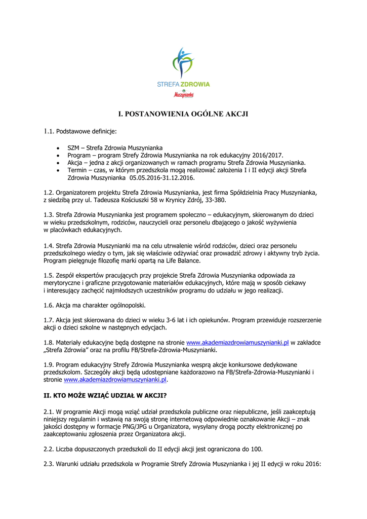 I. POSTANOWIENIA OGÓLNE AKCJI 1.1. Podstawowe definicje: SZM – Strefa Zdrowia Muszynianka Program – program Strefy Zdrowia Muszynianka na rok edukacyjny 2016/2017. Akcja – jedna z akcji organizowanych w ramach programu Strefa Zdrowia Muszynianka. Termin – czas, w którym przedszkola mogą realizować założenia I i II edycji akcji Strefa Zdrowia Muszynianka 05.05.2016-31.12.2016. 1.2. Organizatorem projektu Strefa Zdrowia Muszynianka, jest firma Spółdzielnia Pracy Muszynianka, z siedzibą przy ul. Tadeusza Kościuszki 58 w Krynicy Zdrój, 33-380. 1.3. Strefa Zdrowia Muszynianka jest programem społeczno – edukacyjnym, skierowanym do dzieci w wieku przedszkolnym, rodziców, nauczycieli oraz personelu dbającego o jakość wyżywienia w placówkach edukacyjnych. 1.4. Strefa Zdrowia Muszynianki ma na celu utrwalenie wśród rodziców, dzieci oraz personelu przedszkolnego wiedzy o tym, jak się właściwie odżywiać oraz prowadzić zdrowy i aktywny tryb życia. Program pielęgnuje filozofię marki opartą na Life Balance. 1.5. Zespół ekspertów pracujących przy projekcie Strefa Zdrowia Muszynianka odpowiada za merytoryczne i graficzne przygotowanie materiałów edukacyjnych, które mają w sposób ciekawy i interesujący zachęcić najmłodszych uczestników programu do udziału w jego realizacji. 1.6. Akcja ma charakter ogólnopolski. 1.7. Akcja jest skierowana do dzieci w wieku 3-6 lat i ich opiekunów. Program przewiduje rozszerzenie akcji o dzieci szkolne w następnych edycjach. 1.8. Materiały edukacyjne będą dostępne na stronie www.akademiazdrowiamuszynianki.pl w zakładce „Strefa Zdrowia” oraz na profilu FB/Strefa-Zdrowia-Muszynianki. 1.9. Program edukacyjny Strefy Zdrowia Muszynianka wesprą akcje konkursowe dedykowane przedszkolom. Szczegóły akcji będą udostępniane każdorazowo na FB/Strefa-Zdrowia-Muszynianki i stronie www.akademiazdrowiamuszynianki.pl. II. KTO MOŻE WZIĄĆ UDZIAŁ W AKCJI? 2.1. W programie Akcji mogą wziąć udział przedszkola publiczne oraz niepubliczne, jeśli zaakceptują niniejszy regulamin i wstawią na swoją stronę internetową odpowiednie oznakowanie Akcji – znak jakości dostępny w formacje PNG/JPG u Organizatora, wysyłany drogą poczty elektronicznej po zaakceptowaniu zgłoszenia przez Organizatora akcji. 2.2. Liczba dopuszczonych przedszkoli do II edycji akcji jest ograniczona do 100. 2.3. Warunki udziału przedszkola w Programie Strefy Zdrowia Muszynianka i jej II edycji w roku 2016: Pakiet Przedszkole: 2.4. Wybrana placówka otrzymuje komplet materiałów dla jednej grupy przedszkolnej (25 dzieci) – kolorowanki edukacyjne, zadanie konkursowe, plakat, przybory do rysowania. Materiały edukacyjne będą również dostępne w formie online, po zgłoszeniu zapotrzebowania na nie przez rzeczone przedszkole w celu rozdania materiałów pozostałym dzieciom. Organizator nie wyklucza zaopatrzenia grupy dzieci, biorącej udział w akcji, w wodę butelkowaną marki Muszynianka. Szczegóły będą każdorazowo ustalane z placówkami. Chyba, że Organizator postanowi inaczej. 2.5. Wszystkie koszty związane z drukiem i wysyłką materiałów pokrywa Organizator. Jeżeli przesyłka nie zostanie odebrana przez placówkę, koszty ponownej przesyłki pokrywa adresat. III. PRAWA I OBOWIĄZKI ORGANIZATORA STREFY ZDROWIA MUSZYNIANKA 3.1. Organizator przygotowuje i udostępnia materiały niezbędne do realizacji poszczególnych etapów Akcji realizowanych w ramach Programu w placówkach: - w formie wydrukowanej – po zgłoszeniu chęci przedszkola do udziału w akcji - w formie elektronicznej, po przesłaniu drogą mailową zapotrzebowania na materiały akcyjne. 3.2. Organizator zastrzega sobie możliwość wprowadzania zmian w niniejszym Regulaminie, o czym będzie informował na stronie www.akademiazdrowiamuszynianki.pl oraz na FB/Strefa-ZdrowiaMuszynianki. 3.3. Wszystkie materiały Organizatora stanowią jego własność i objęte są prawami autorskimi. Materiały służą wyłącznie celom edukacyjnym i nie mogą być wykorzystywane w innym celu i przez inne podmioty w celach komercyjnych. 3.4. Organizator nie odpowiada za opóźnienia w dostarczeniu materiałów drogą poczty tradycyjnej i elektronicznej, które nie wynikają z jego winy. 3.5. Organizator wystawia Certyfikat jakości Strefy Zdrowia Muszynianka dla przedszkola biorącego udział w danej Akcji i spełniającego warunki określone w niniejszym Regulaminie. Certyfikat zostaje wysłany do placówki w formie drukowanej i elektronicznej z możliwością umieszczenia go na stronie www placówki. 3.6. Organizator ma prawo do odmówienia wystawienia Certyfikatu za udział w Akcji w przypadku niedostosowania się placówki do założeń niniejszego Regulaminu. 3.7. Organizator dołoży wszelkich starań, aby w ramach realizowanych Akcji nie naruszać niczyich dóbr osobistych, odczuć, czy przekonań. 3.8. Przedszkola biorące udział w Akcji zobowiązują się do przekazania rodzicom materiałów dostarczonych przez Organizatora, aby zwiększyć zasięg Akcji. 3.9. Organizator ma prawo przekazać placówkom materiały promocyjne Strefy Zdrowia Muszynianka. IV. WYMAGANIA ORGANIZATORA WOBEC PRZEDSZKOLI BIORĄCYCH UDZIAŁ W AKCJI 4.1. Przedszkole przystępujące do Akcji zobowiązuje się do krzewienia idei Akcji, umieszczenia informacji o Akcji na swojej stronie www i ew. na profilu FB. 4.2. Przedszkole przystępując do Programu Strefa Zdrowia Muszynianki deklaruje, że dołoży wszelkich starań, aby żywienie w placówce było zgodne z normami zbilansowanego i zdrowego żywienia oraz Ustawy z dnia 28 listopada 2014 r. o zmianie ustawy o bezpieczeństwie żywności i żywienia. 4.3. W celu otrzymania Certyfikatu „Przedszkole przyjazne maluchom” przedszkole jest zobowiązane do sporządzenia krótkiego podsumowania działań drogą mailową na adres [email protected] z dopiskiem podsumowanie Akcji i adres Przedszkola. 4.4. Akceptacja regulaminu udziału w programie