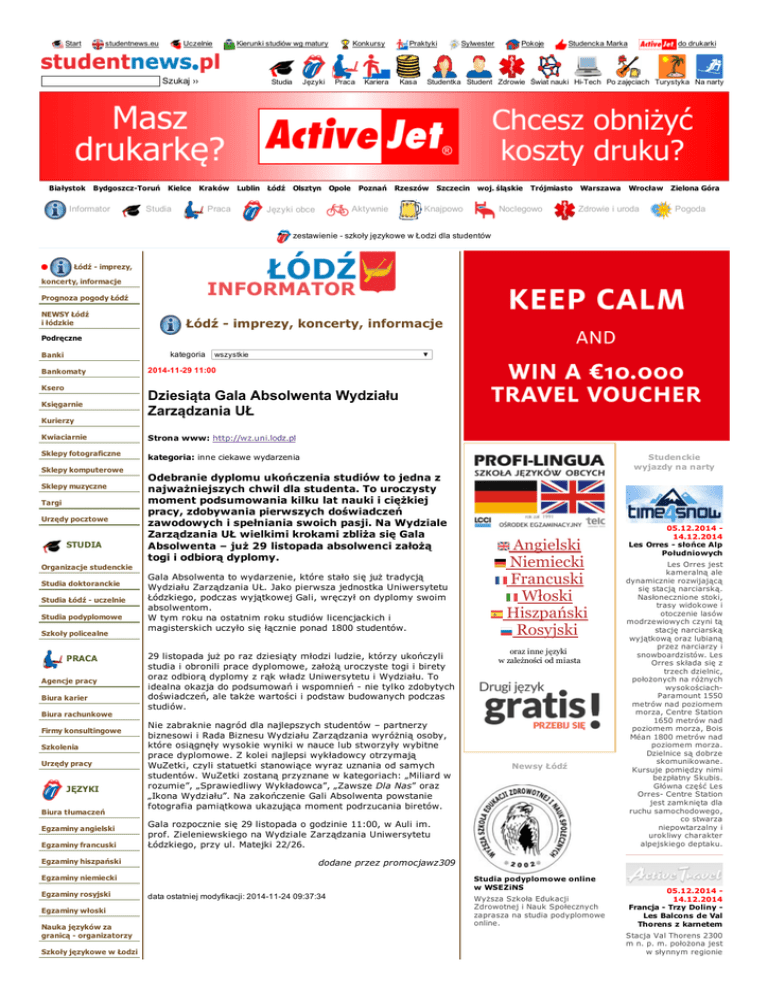 Start studentnews.eu Uczelnie Kierunki studiów wg matury Szukaj ›› Studia Języki Konkursy Praca Kariera Praktyki Kasa Sylwester Pokoje Studencka Marka do drukarki Studentka Student Zdrowie Świat nauki HiTech Po zajęciach Turystyka Na narty Białystok BydgoszczToruń Kielce Kraków Lublin Łódź Olsztyn Opole Poznań Rzeszów Szczecin woj. śląskie Trójmiasto Warszawa Wrocław Zielona Góra Informator Studia Praca Aktywnie Języki obce Knajpowo Noclegowo Zdrowie i uroda Pogoda zestawienie szkoły językowe w Łodzi dla studentów Łódź imprezy, koncerty, informacje Prognoza pogody Łódź NEWSY Łódź i łódzkie Łódź imprezy, koncerty, informacje Podręczne Banki Bankomaty Ksero Księgarnie Kurierzy kategoria wszystkie 20141129 11:00 Dziesiąta Gala Absolwenta Wydziału Zarządzania UŁ Kwiaciarnie Strona www: http://wz.uni.lodz.pl Sklepy fotograficzne kategoria: inne ciekawe wydarzenia Sklepy komputerowe Sklepy muzyczne Targi Urzędy pocztowe STUDIA Studenckie wyjazdy na narty Odebranie dyplomu ukończenia studiów to jedna z najważniejszych chwil dla studenta. To uroczysty moment podsumowania kilku lat nauki i ciężkiej pracy, zdobywania pierwszych doświadczeń zawodowych i spełniania swoich pasji. Na Wydziale Zarządzania UŁ wielkimi krokami zbliża się Gala Absolwenta – już 29 listopada absolwenci założą togi i odbiorą dyplomy. Organizacje studenckie Studia doktoranckie Studia Łódź uczelnie Studia podyplomowe Szkoły policealne PRACA Agencje pracy Biura karier Biura rachunkowe Firmy konsultingowe Szkolenia Urzędy pracy JĘZYKI Biura tłumaczeń Egzaminy angielski Egzaminy francuski Egzaminy hiszpański Gala Absolwenta to wydarzenie, które stało się już tradycją Wydziału Zarządzania UŁ. Jako pierwsza jednostka Uniwersytetu Łódzkiego, podczas wyjątkowej Gali, wręczył on dyplomy swoim absolwentom. W tym roku na ostatnim roku studiów licencjackich i magisterskich uczyło się łącznie ponad 1800 studentów. 29 listopada już po raz dziesiąty młodzi ludzie, którzy ukończyli studia i obronili prace dyplomowe, założą uroczyste togi i birety oraz odbiorą dyplomy z rąk władz Uniwersytetu i Wydziału. To idealna okazja do podsumowań i wspomnień nie tylko zdobytych doświadczeń, ale także wartości i podstaw budowanych podczas studiów. Nie zabraknie nagród dla najlepszych studentów – partnerzy biznesowi i Rada Biznesu Wydziału Zarządzania wyróżnią osoby, które osiągnęły wysokie wyniki w nauce lub stworzyły wybitne prace dyplomowe. Z kolei najlepsi wykładowcy otrzymają WuZetki, czyli statuetki stanowiące wyraz uznania od samych studentów. WuZetki zostaną przyznane w kategoriach: „Miliard w rozumie”, „Sprawiedliwy Wykładowca”, „Zawsze Dla Nas” oraz „Ikona Wydziału”. Na zakończenie Gali Absolwenta powstanie fotografia pamiątkowa ukazująca moment podrzucania biretów. Egzaminy włoski Nauka języków za granicą organizatorzy Szkoły językowe w Łodzi oraz inne języki w zależności od miasta Newsy Łódź Gala rozpocznie się 29 listopada o godzinie 11:00, w Auli im. prof. Zieleniewskiego na Wydziale Zarządzania Uniwersytetu Łódzkiego, przy ul. Matejki 22/26. Les Orres jest kameralną ale dynamicznie rozwijającą się stacją narciarską. Nasłonecznione stoki, trasy widokowe i otoczenie lasów modrzewiowych czyni tą stację narciarską wyjątkową oraz lubianą przez narciarzy i snowboardzistów. Les Orres składa się z trzech dzielnic, położonych na różnych wysokościach Paramount 1550 metrów nad poziomem morza, Centre Station 1650 metrów nad poziomem morza, Bois Méan 1800 metrów nad poziomem morza. Dzielnice są dobrze skomunikowane. Kursuje pomiędzy nimi bezpłatny Skubis. Główna część Les Orres Centre Station jest zamknięta dla ruchu samochodowego, co stwarza niepowtarzalny i urokliwy charakter alpejskiego deptaku. dodane przez promocjawz309 Egzaminy niemiecki Egzaminy rosyjski Angielski Niemiecki Francuski Włoski Hiszpański Rosyjski 05.12.2014 14.12.2014 Les Orres słońce Alp Południowych Studia podyplomowe online w WSEZiNS data ostatniej modyfikacji: 20141124 09:37:34 Wyższa Szkoła Edukacji Zdrowotnej i Nauk Społecznych zaprasza na studia podyplomowe online. 05.12.2014 14.12.2014 Francja Trzy Doliny Les Balcons de Val Thorens z karnetem Stacja Val Thorens 2300 m n. p. m. położona jest w słynnym regionie