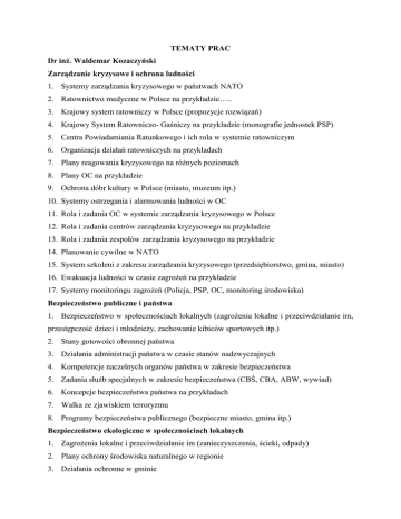 TEMATY PRAC Dr inż. Waldemar Kozaczyński Zarządzanie kryzysowe i ochrona ludności 1. Systemy zarządzania kryzysowego w państwach NATO 2. Ratownictwo medyczne w Polsce na przykładzie….. 3. Krajowy system ratowniczy w Polsce (propozycje rozwiązań) 4. Krajowy System Ratowniczo- Gaśniczy na przykładzie (monografie jednostek PSP) 5. Centra Powiadamiania Ratunkowego i ich rola w systemie ratowniczym 6. Organizacja działań ratowniczych na przykładach 7. Plany reagowania kryzysowego na różnych poziomach 8. Plany OC na przykładzie 9. Ochrona dóbr kultury w Polsce (miasto, muzeum itp.) 10. Systemy ostrzegania i alarmowania ludności w OC 11. Rola i zadania OC w systemie zarządzania kryzysowego w Polsce 12. Rola i zadania centrów zarządzania kryzysowego na przykładzie 13. Rola i zadania zespołów zarządzania kryzysowego na przykładzie 14. Planowanie cywilne w NATO 15. System szkoleni z zakresu zarządzania kryzysowego (przedsiębiorstwo, gmina, miasto) 16. Ewakuacja ludności w czasie zagrożeń na przykładzie 17. Systemy monitoringu zagrożeń (Policja, PSP, OC, monitoring środowiska) Bezpieczeństwo publiczne i państwa 1. Bezpieczeństwo w społecznościach lokalnych (zagrożenia lokalne i przeciwdziałanie im, przestępczość dzieci i młodzieży, zachowanie kibiców sportowych itp.) 2. Stany gotowości obronnej państwa 3. Działania administracji państwa w czasie stanów nadzwyczajnych 4. Kompetencje naczelnych organów państwa w zakresie bezpieczeństwa 5. Zadania służb specjalnych w zakresie bezpieczeństwa (CBŚ, CBA, ABW, wywiad) 6. Koncepcje bezpieczeństwa państwa na przykładach 7. Walka ze zjawiskiem terroryzmu 8. Programy bezpieczeństwa publicznego (bezpieczne miasto, gmina itp.) Bezpieczeństwo ekologiczne w społecznościach lokalnych 1. Zagrożenia lokalne i przeciwdziałanie im (zanieczyszczenia, ścieki, odpady) 2. Plany ochrony środowiska naturalnego w regionie 3. Działania ochronne w gminie 4. Strategie rozwoju gminy Dr Marek Zawartka 1. Organizacja czasu wolnego dla studentów Akademii Wychowania Fizycznego im. Jerzego Kukuczki w Katowicach w aspekcie przeciwdziałania patologiom społecznym. 2. Pseudokibice zagrożeniem dla bezpiecznego przebiegu meczy piłki nożnej na terenie Śląska. Dr Ewa Przybyła Problematyka badawcza z zakresu edukacji zdrowotnej 1. Zdrowie w świadomości społecznej. Koncepcja zdrowia i choroby u młodzieży. Znaczenie wartościowania zdrowia i jego oceny w kształtowaniu się zachowań zdrowotnych dzieci i młodzieży. 2. Ocena stanu zdrowia. Ocena stanu odżywienia. Zdrowie subiektywne i zadowolenie z życia. Pomiar jakości życia – diagnoza społeczna. 3. Styl życia. Zachowania zdrowotne dzieci i młodzieży szkolnej, studentów i nauczycieli, osób dorosłych: - poziom wiedzy a zachowania zdrowotne, - zachowania żywieniowe, odchudzanie się dziewcząt w okresie dojrzewania, - spożywanie napojów energetycznych przez dzieci i młodzież, - aktywność i sprawność fizyczna jako miernik zdrowia, - styl życia osób uprawiających fitness i jego wpływ na świadomość zdrowotną. 4. Modyfikacja zachowań zdrowotnych u osób z problemami nadwagi i otyłości. Determinanty podejmowania i kontynuacji zachowań zdrowotnych (poczucie własnej skuteczności). 5. Zachowania ryzykowne: używanie alkoholu, narkotyków, nikotyny. 6. HIV/AIDS: -poziom wiedzy na temat HIV/AIDS, - zachowania seksualne jako element stylu życia w dobie HIV/AIDS, - stygmat i dyskryminacja w epidemii HIV/AIDS. 7. Wartościowanie wychowania fizycznego i zdrowotnego jako przedmiotu szkolnego. 8. Realizacja edukacji zdrowotnej w polskiej szkole. Warunki i sposoby realizacji przez szkoły nowej podstawy programowej. Stosowanie metod aktywizujących. 9. Kształcenie nauczycieli w zakresie edukacji zdrowotnej. - kompetencje nauczycieli do realizacji edukacji zdrowotnej, - stan wiedzy studentów z zakresu edukacji zdrowotnej, - samokształcenie jako element stylu życia studentów. dr Janusz ROPSKI 1. Kompetencje społeczne współczesnego nauczyciela. 2. Atrakcyjność interpersonalna nauczyciela wychowania fizycznego. 3. Umiejętności interpersonalne współczesnego nauczyciela. 4. Nauczyciel edukacji dla bezpieczeństwa i wychowania fizycznego na tle wymagań współczesności. 5. Umiejętności dydaktyczne nauczyciela współczesnej szkoły. 6. Czynniki mające wpływ na efektywność nauczania. 7. Wykorzystanie nowoczesnych metod nauczania w prowadzeniu lekcji. 8. Autorytet współczesnego nauczyciela. 9. Stereotypy i uprzedzenia w ocenianiu. 10. Deformacje w relacjach społecznych występujące we współczesnej szkole. 11. Sytuacja trudne i stresowe w pracy nauczyciela. 12. Wychowawcze i edukacyjne aspekty lekcji edukacji dla bezpieczeństwa i wychowania fizycznego. 13. Troska o bezpieczeństwo społeczne uczniów w działaniach podejmowanych przez nauczycieli. 14. Aspiracje społeczno-zawodowe uczniów szkół średnich. 15. Świadomość obronna uczniów szkół średnich. 16. Wiedza o wojsku i obronności wśród uczniów klas mundurowych. 17. Rola i zadania szkoły w edukacji dla bezpieczeństwa. 18. Edukacja dla bezpieczeństwa i jej konteksty społeczne i wychowawcze. Dr Krzysztof Sas-Nowosielski 1. Uwarunkowania aktywności fizycznej różnych grup społecznych 2. Motywy i bariery uczestnictwa w kulturze fizycznej. 3. Konsekwencje uprawiania sportu dla rozwoju psychospołecznego dzieci i młodzieży dr Joanna Ogrodnik 1. Wybrane aspekty zawodu nauczyciela wychowania fizycznego, instruktora, trenera. 2. Problemy dydaktyczno-wychowawcze na lekcjach wychowania fizycznego lub w zespole sportowym. 3. Aktywność fizyczna a problemy dewiacyjnego zachowania się dzieci, młodzieży i dorosłych (agresja, przestępczość, alkoholizm, narkomania). 4. Motywacja w sporcie. 5. Aktywność ruchowa dzieci w wieku przedszkolnym i szkolnym na przykładzie wybranych placówek oświatowych. 6. Organizacja lekcji wychowania fizycznego a oczeki