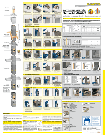 5. Zakończenie czapy kominowej Systemy kominowe Stożek komina INSTRUKCJA MONTAŻU: Ceramiczna rura profilowana 5.5 Przyłożyć stożek wylotu spalin i odmierzyć brakującą długość rury. 5.6 Przed zamontowaniem skrócić (szlifierką kątową) ostatnią rurę ceramiczną. 5.7 Osadzić rurę ceramiczną i na jej górną krawędź nałożyć masę ROTEMPO. 5.8 Nałożyć stożek opierając go ściśle na górnej krawędzi rury (masa ROTEMPO uszczelnia połączenie stożka z rurą). Płyta przykrywająca Schiedel AVANT do kotłów kondensacyjnych i niskotemperaturowych Inteligentny system kominowy dla techniki kondensacyjnej Schiedel AVANT jest systemem odprowadzania spalin do zastosowania w budownictwie jednorodzinnym. System ten został stworzony w oparciu o najnowsze osiągnięcia technologiczne. 5.1 Dwa pręty zbrojeniowe z mufami oraz jeden pręt gwintowany (razem 3 m) połączyć ze sobą i zamontować w przeciwległych narożach pustaka. 5.2 Otwory zalać rzadką zaprawą (pilnować osiowego ustawienia prętów). 5.3 Płytę przykrywającą komina osadzić na zaprawie... 5.4 ... i przykręcić śrubami. 6. Sposób samodzielnego wykonania płyty przykrywającej na budowie Szalunek tracony Płyta betonowa 4. Standardowy przebieg montażu Średnica komina [mm] Ø D [mm] ±1 A [mm] ±2 Typ komina 212 270 Avant 12 – 16 255 310 Avant 18 – 20 340 480 Avant 25 120 140 Usztywnienie komina w więźbie dachowej (alternatywnie patrz rys. 3. d) Pręty montażowe płyty przykrywającej 160 180 200 250 Szalunek tracony ułożyć na ostatnim pustaku. Po odpowiednim jego wycentrowaniu należy wykonać szalunek zewnętrzny, ułożyć odpowiednie zbrojenie i wylać beton o klasie min C 20/25. Maksymalna wysokość wylewanej płyty nie może przekraczać poziomu linii na szalunku traconym. Po związaniu betonu rozebrać szalunek zewnętrzny, osadzić ostatnią rurę ceramiczną na kicie kwasoodpornym i na jej wystający odcinek nałożyć stalowy stożek komina. 4.6 Osadzić rurę ceramiczną. 4.5 Pokrywę zabezpieczającą wyjąć przy pomocy magnetycznej końcówki przyrządu do wygładzania fug. 4.7 Połączenie dwóch rur wyrównać za pomocą przyrządu do wygładzania fug. 4.8 Na górną krawędź rury nałożyć masę ROTEMPO. Czynności powtarzać do etapu nałożenia czapy kominowej. 5. Doprowadzenie powietrza do spalania Wymiary otworów Średnica Ø cm 2 b h 160 155 260 155 12* 14 16 Płyta wspornikowa 18 20 1 Tylko w razie potrzeby! Montaż górnych drzwiczek wyczystkowych należy uzgodnić z mistrzem kominiarskim 4.1 Górną krawędź rury ceramicznej (kielich) wypełnić grubą warstwą masy ROTEMPO. 4.2 Rurę przykryć pokrywą zabezpieczającą... 4.3 ...nanieść cienką warstwę zaprawy... 4.4 ...ułożyć kolejne dwa pustaki. Przykład: Avant + kanały wentylacyjne. 25 * Alternatywnie można zastosować 2 kratki boczne o wym 150 x 210 mm. W przypadku zastosowania betonowej płyty przykrywającej wylewanej bezpośrednio na budowie dopływ powietrza do kotła należy zapewnić poprzez otwory wykonane w ostatnim pustaku kominowym pod płytą przykrywającą – patrz przykład. Wymiary otworów zapewniających dopływ powietrza są zależne od wielkości średnicy systemu kominowego – patrz tabela. Podobna zasada obowiązuje w przypadku wykonania obmurówki z cegły klinkierowej. 4. Montaż górnych drzwiczek wyczystkowych 3. Montaż przyłącza spalin Zaślepka rewizyjna Drzwiczki wyczystkowe 3.5 W kolejnym pustaku odrysować otwór... 3.6 ...a następnie wyciąć go za pomocą szlifierki kątowej. 3.7 Pustak z wyciętym otworem, ułożyć na zaprawie montażowej. 3.8 Osadzić rurę przyłącza spalin RA. 4.a Osadzić zaślepkę rewizyjną. 4.b Drzwiczki rewizyjne przybić gwoździami do pustaka. 4.c Ramkę drzwiczek otynkować. 3. Przejście przez stropy i dach Strop drewniany Strop betonowy Pustak Pustak Strop betonowy Strop drewniany Tylko w razie potrzeby! Płyta dolna. Element wzmocnienia komina Dylatacja z wełny mineralnej Strop betonowy 3.1 Możliwe wysokości przyłączenia. 3.2 Na krawędź rury nałożyć masę ROTEMPO i osadzić rurę ceramiczną. 3.3 Połączenie dwóch rur wyrównać za pomocą przyrządu do wygładzania fug. 4.d Komin otynkować zaprawą cementowo-wapienną. 3.4 Nałożyć masę ROTEMPO, rurę przykryć pokrywą zabezpieczającą, nanieść cienką warstwę zaprawy. 3.a Otwór przejścia stropowego 3.b Przejście komina przez strop i dachowego musi być ze drewniany. wszystkich stron większy od wymiaru zewnętrznego pustaka o min. 2-3 cm. Do dylatacji nie stosować styropianu!!! Dylatacja z wełny mineralnej 3.c Przejście komina przez strop betonowy. 3.d Alternatywne wykonanie przejścia kominowego przez konstrukcję dachu. Montaż uchwytu kominowego Schiedel. 2.c Osadzić maskownicę metalową. 2.d Montaż koncentrycznej rury powietrzno-spalinowej w trybie przeciwprądu. 2. Podłączenie urządzenia grzewczego 2. Montaż środkowej części komina 2 1 Wysokość przyłącza spalin ustalić z instalatorem Szerokość A Średnica komina w cm 2.1 Na górną krawędź rury nałożyć masę ROTEMPO oraz zabezpieczyć ją pokrywą... 2.2 ...nanieść cienką warstwę zaprawy... 2.3 ...osadzić kolejne dwa pustaki. 2.4 Pokrywę zabezpieczającą wyjąć przy pomocy magnetycznej końcówki przyrządu do wygładzania fug. 1. Wykonanie stopy komina 2.a 1 - Uszczelka przewodu spalinowego 2 - Maskownica metalowa Podłączenie - tryb współprądu 2.b 1 - Uszczelka przewodu spalinowego 2 - Maskownica metalowa dolotu powietrza Podłączenie - tryb przeciwprądu 1. Połączenie węża syfonu z końcówką odpływu Wymiar A w cm 12 16 14-16 22 18-20 26 25 28 1.5 W następnym pustaku wyciąć otwór rewizyjny o szerokości 16 cm pod drzwiczki wyczystkowe. 1.6 Pustak z wyciętym otworem osadzić na pokrytej zaprawą, betonowej płycie... 1.7 ...ułożyć następny pustak. 1.8 Trójnik wyczystkowy z wężem syfonu osadzić na zaprawie na podstawie betonowej 