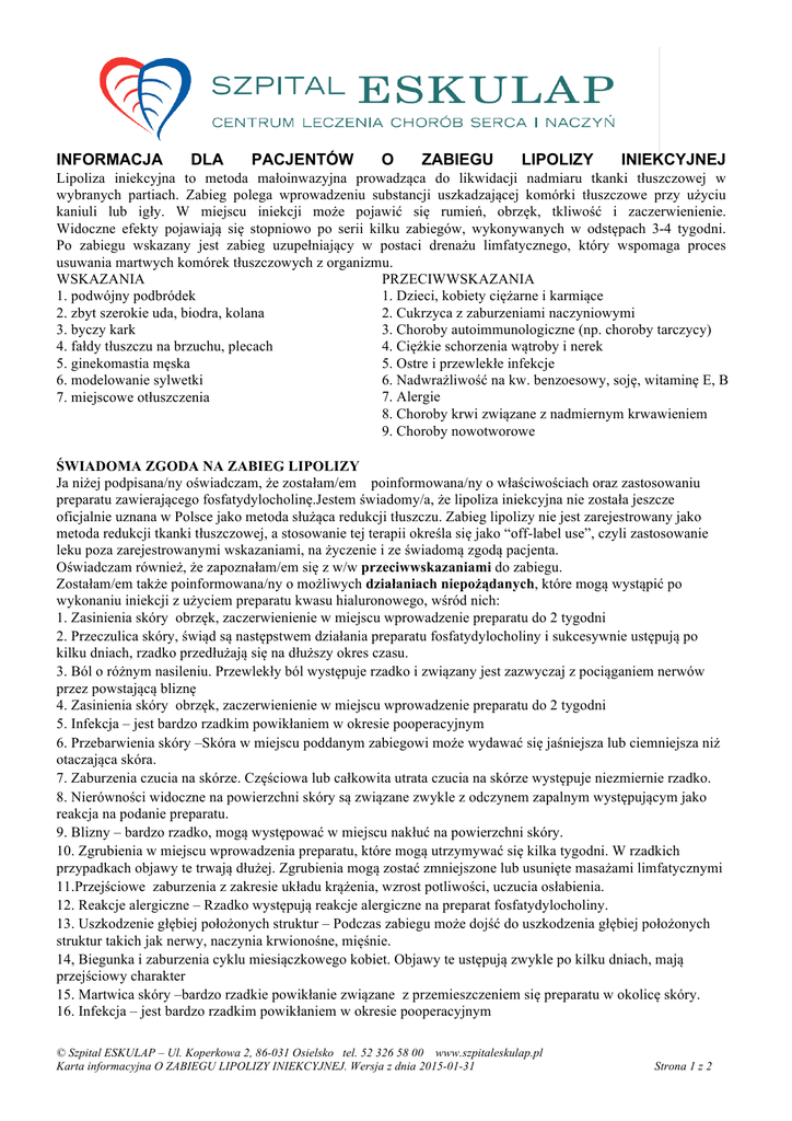 INFORMACJA DLA PACJENTÓW O ZABIEGU LIPOLIZY INIEKCYJNEJ Lipoliza iniekcyjna to metoda małoinwazyjna prowadząca do likwidacji nadmiaru tkanki tłuszczowej w wybranych partiach. Zabieg polega wprowadzeniu substancji uszkadzającej komórki tłuszczowe przy użyciu kaniuli lub igły. W miejscu iniekcji może pojawić się rumień, obrzęk, tkliwość i zaczerwienienie. Widoczne efekty pojawiają się stopniowo po serii kilku zabiegów, wykonywanych w odstępach 3-4 tygodni. Po zabiegu wskazany jest zabieg uzupełniający w postaci drenażu limfatycznego, który wspomaga proces usuwania martwych komórek tłuszczowych z organizmu. WSKAZANIA PRZECIWWSKAZANIA 1. podwójny podbródek 1. Dzieci, kobiety ciężarne i karmiące 2. zbyt szerokie uda, biodra, kolana 2. Cukrzyca z zaburzeniami naczyniowymi 3. byczy kark 3. Choroby autoimmunologiczne (np. choroby tarczycy) 4. fałdy tłuszczu na brzuchu, plecach 4. Ciężkie schorzenia wątroby i nerek 5. ginekomastia męska 5. Ostre i przewlekłe infekcje 6. modelowanie sylwetki 6. Nadwrażliwość na kw. benzoesowy, soję, witaminę E, B 7. Alergie 7. miejscowe otłuszczenia 8. Choroby krwi związane z nadmiernym krwawieniem 9. Choroby nowotworowe ŚWIADOMA ZGODA NA ZABIEG LIPOLIZY Ja niżej podpisana/ny oświadczam, że zostałam/em poinformowana/ny o właściwościach oraz zastosowaniu preparatu zawierającego fosfatydylocholinę.Jestem świadomy/a, że lipoliza iniekcyjna nie została jeszcze oficjalnie uznana w Polsce jako metoda służąca redukcji tłuszczu. Zabieg lipolizy nie jest zarejestrowany jako metoda redukcji tkanki tłuszczowej, a stosowanie tej terapii określa się jako “off-label use”, czyli zastosowanie leku poza zarejestrowanymi wskazaniami, na życzenie i ze świadomą zgodą pacjenta. Oświadczam również, że zapoznałam/em się z w/w przeciwwskazaniami do zabiegu. Zostałam/em także poinformowana/ny o możliwych działaniach niepożądanych, które mogą wystąpić po wykonaniu iniekcji z użyciem preparatu kwasu hialuronowego, wśród nich: 1. Zasinienia skóry obrzęk, zaczerwienienie w miejscu wprowadzenie preparatu do 2 tygodni 2. Przeczulica skóry, świąd są następstwem działania preparatu fosfatydylocholiny i sukcesywnie ustępują po kilku dniach, rzadko przedłużają się na dłuższy okres czasu. 3. Ból o różnym nasileniu. Przewlekły ból występuje rzadko i związany jest zazwyczaj z pociąganiem nerwów przez powstającą bliznę 4. Zasinienia skóry obrzęk, zaczerwienienie w miejscu wprowadzenie preparatu do 2 tygodni 5. Infekcja – jest bardzo rzadkim powikłaniem w okresie pooperacyjnym 6. Przebarwienia skóry –Skóra w miejscu poddanym zabiegowi może wydawać się jaśniejsza lub ciemniejsza niż otaczająca skóra. 7. Zaburzenia czucia na skórze. Częściowa lub całkowita utrata czucia na skórze występuje niezmiernie rzadko. 8. Nierówności widoczne na powierzchni skóry są związane zwykle z odczynem zapalnym występującym jako reakcja na podanie preparatu. 9. Blizny – bardzo rzadko, mogą występować w miejscu nakłuć na powierzchni skóry. 10. Zgrubienia w miejscu wprowadzenia preparatu, które mogą utrzymywać się kilka tygodni. W rzadkich przypadkach objawy te trwają dłużej. Zgrubienia mogą zostać zmniejszone lub usunięte masażami limfatycznymi 11.Przejściowe zaburzenia z zakresie układu krążenia, wzrost potliwości, uczucia osłabienia. 12. Reakcje alergiczne – Rzadko występują reakcje alergiczne na preparat fosfatydylocholiny. 13. Uszkodzenie głębiej położonych struktur – Podczas zabiegu może dojść do uszkodzenia głębiej położonych struktur takich jak nerwy, naczynia krwionośne, mięśnie. 14, Biegunka i zaburzenia cyklu miesiączkowego kobiet. Objawy te ustępują zwykle po kilku dniach, mają przejściowy charakter 15. Martwica skóry –bardzo rzadkie powikłanie związane z przemieszczeniem się preparatu w okolicę skóry. 16. Infekcja – jest bardzo rzadkim powikłaniem w okresie pooperacyjnym © Szpital ESKULAP – Ul. Koperkowa 2, 86-031 Osielsko tel. 52 326 58 00 www.szpitaleskulap.pl Karta informacyjna O ZABIEGU LIPOLIZY INIEKCYJNEJ. Wersja z dnia 2015-01-31 Strona 1 z 2 Ponadto oświadczam, że zostałam/em w sposób wyczerpujący i w języku dla mnie zrozumiałym poinformowana o rodzaju zabiegu, przewidywanym czasie trwania, sposobie znieczulenia oraz przewidywanym wyniku, kosztach zabiegu oraz ZALECENIACH POZABIEGOWYCH, w tym: 1. Spanie z uniesioną głową oraz podłożenie poduszek pod ramiona gdy zabieg był wykonywany na twarzy. 2. Całkowicie unikaj słońca i solarium przez 6 tyg. po zabiegu 3. Efekty widoczne są zazwyczaj po drugim lub trzecim zabiegu w cyklu, choć u niektórych osób widać je już po pierwszym zabiegu. Pełen efekt stabilizuje się w ciągu miesiąca po ostatnim zabiegu w cyklu. 4.. Reakcja organizmu na zabieg lipolizy jest zróżnicowana i indywidualna. Szybkość redukcji otłuszczeń rożni się, tak pomiędzy pacjentami, jak i pomiędzy obszarami u jednej osoby. 5.. Wskazane jest wprowadzenie niskotłuszczowej diety w okresie działania preparatu. 6. W celu zwiększenia efektu przyjmować L-karnitynę 1 tabl. dziennie 7. Nie przyjmować leków przeciwbólowych I przeciwzapalnych. Jedynym zalecanym lekiem jest Paracetamol. 8. Działanie lipolizy można wspomóc zabiegami endermologia i masażami limfatycznymi po około 4-5 dniach od daty wykonania zabiegu. Jestem świadoma/y, że możliwy do osiągnięcia efekt zabiegu, okres gojenia i skuteczność ewentualnej terapii są ściśle uzależnione od indywidualnego przypadku i zależne od wielu czynników m.in. od stanu mojego zdrowia, wieku, elastyczności skóry, indywidualnej reakcji skóry i całego organizmu na podane leki. Przed przystąpieniem do zabiegu zostałam/em wyczerpująco i dostępnie poinformowana/y o tym, że końcowy efekt zabiegu nie jest identyczny w każdym przypadku i może odbiegać od efektów, które osiągnięto u innyc
