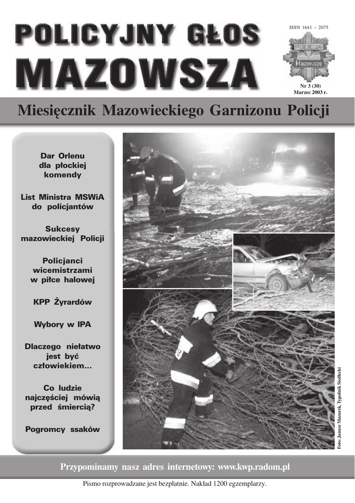 ISSN 1641 – 2075 Nr 3 (30) Marzec 2003 r. Miesięcznik Mazowieckiego Garnizonu Policji Dar Orlenu dla płockiej komendy List Ministra MSWiA do policjantów Sukcesy mazowieckiej Policji Policjanci wicemistrzami w piłce halowej KPP Żyrardów Dlaczego niełatwo jest być człowiekiem... Co ludzie najczęściej mówią przed śmiercią? Pogromcy ssaków Przypominamy nasz adres internetowy: www.kwp.radom.pl Pismo rozprowadzane jest bezpłatnie. Nakład 1200 egzemplarzy. Foto: Janusz Mazurek, Tygodnik Siedlecki Wybory w IPA AKTUALNOŚCI Radom. ul. Warszawska, 4.03.2003, godz. 9:10 - Policjanci Sekcji Ruchu Drogowego KMP w Radomiu zatrzymali sam. Volkswagen Golf, którym podróżowali dwaj mężczyźni (29 i 26 lat). Jeden z nich okazał się być poszukiwany nakazem Sądu Rejonowego w Kozienicach w celu odbycia kary pozbawienia wolności. Policjanci znaleźli w zatrzymanym samochodzie rozpruty sejf z dokumentami należącymi do pewnego urzędu gminy, skradziony podczas włamania uprzedniej nocy. Zatrzymanych osadzono w areszcie. Płońsk, 2.03.2003, godz. 9:00 - Policjanci w wyniku działań operacyjnych ustalili i zatrzymali sprawców kradzieży okien w Ćwiklinie, kradzieży z włamaniem do budynku mieszkalnego w Galominie i kradzieży z włamaniem do budynku gospodarczego w Niedarzynie. Zatrzymano pięciu mężczyzn pochodzących z sąsiednich miejscowości. Policjanci odzyskali część utraconego mienia, m.in. okna i elektronarzędzia. Po przesłuchaniu osoby zatrzymane decyzją Prokuratury Rejonowej w Płońsku zostały zwolnione. Małkinia, powiat ostrowiecki, 28.02.2003, godz. 20:40 - Nieznani sprawcy, w stojącym na peronie pociągu relacji Małkinia-Białystok, przystawili nóż do szyi mieszkańcowi powiatu ostrowieckiego, a następnie ukradli mu pieniądze. Policjanci zatrzymali dwóch mężczyzn (19 i 15 lat), podejrzanych o popełnienie tego przestępstwa. Radom, ul. Dębowa, 28.02.2003, godz. 13:00 - Policjanci KMP w Radomiu podczas przeszukania pomieszczeń mieszkalnych ujawnili i zabezpieczyli masę plastyczną szarego koloru o wadze ok. 800 g, zapalnik górniczy z opóźnieniem i inne przedmioty mogące służyć do wyrobu ładunków wybuchowych. Policjanci zatrzymali trzech mężczyzn podejrzewanych o związek z tą sprawą. Decyzją sądu następnego dnia aresztowano na trzy miesiące 48letniego mieszkańca Pionek. Radom, 26.02.2003, godz. 23:45 Mieszkaniec Radomia w ruinach zawalonego budynku obory w Zadąbrowie znalazł najprawdopodobniej pocisk artyleryjski, który swoim samochodem (!) dowiózł do budynku KMP Radom. Policjanci zabezpieczyli pocisk na boisku sportowym przy KWP Radom do przyjazdu patrolu rozminowania z J.W. Kazuń. Żyrardów, 26.02.2003, godz. 18:15 Nieznany sprawca doprowadził do stanu bezbronności poprzez pobicie 33-letniego mieszkańca Żyrardowa, po czym skradł mu niewielką kwotę pieniędzy, zegarek i paczkę papierosów. Policjanci, w wyniku podjętych czynności, zatrzymali sprawcę, którym okazał się 20-letni mieszkaniec Żyrardowa. Mężczyznę osadzono w areszcie. Radom, 25.02.2003, godz. 12:00 Policjanci z Radomia i z Kowali przeszukali pomieszczenia mieszkalne i gospodarcze w gminie Kowala, gdzie ujawnili i zabezpieczyli części samochodowe, karoserie, silniki, instalacje gazowe, elementy nadwozia i wyposażenia. Zabezpieczono 2 również pochodzące z kradzieży samochody Polonez, Golf i BMW. Podczas przeszukania w jednym z mieszkań w Radomiu znaleziono z kolei kradzione radioodtwarzacze. Żyrardów, 25.02.2003, godz. 2:30 - Policjanci z KPP w pościgu zatrzymali dwóch sprawców włamania do samochodu Fiat 126p, którymi okazali się dwaj mieszkańcy gminy Plichowice (47 i 30 lat). Sprawcy po włamaniu zdążyli ukraść radio, które zostało odzyskane. Zatrzymanie było możliwe dzięki monitoringowi miejskiemu. Płońsk, 24.02.2003, godz. 20:45 - Nieznany sprawca pobił 30-letnią mieszkankę Płońska, której ukradł torebkę z pieniędzmi i przedmiotami osobistymi. W wyniku podjętych czynności ustalono i zatrzymano sprawcę. Jest nim 19-letni mieszkaniec Płońska, przy którym znaleziono ukradzione przedmioty, odzyskana została również torebka. Niestety, pokrzywdzona z obrażeniami ciała została umieszczona w szpitalu. Płock, 22.02.2003, godz.18:00 - Policja poszukuje nieznanego sprawcę, który oddał cztery strzały z krótkiej broni palnej do mieszkańca Płocka. Poszkodowany w wyniku odniesionych obrażeń zmarł na miejscu. Szydłowiec, ul. Garbarska, 19.02.2003, godz. 19:30 - Policjanci zatrzymali dwóch mężczyzn na gorącym uczynku kradzieży kabli energetycznych z terenu garbarni. Sprawców, będących pod wpływem alkoholu, osadzono w areszcie. Sadowne, powiat węgrowski, 22.02.2003, godz. 12:35 - Węgrowscy i łochowscy policjanci przeszukali jedno z zabudowań w miejscowości Szankarzyzna. W trakcie przeszukania zatrzymano dwóch mężczyzn podczas rozmontowywania sam. Opel Astra. Samochód został skradziony poprzedniej nocy w Białołęce. Zatrzymanych osadzono w areszcie a “Opla” zabezpieczono na parkingu. Postępowanie w sprawie prowadzi KPP Węgrów. Radom, ul. Młodzianowska, 19.02.2003, godz. 16:00 - Policjanci SPPP KWP zatrzymali pięciu mieszkańców Radomia, usiłujących ukraść fragmenty szyn kolejowych. Zatrzymanych osadzono w areszcie. Radom, ul. Warszawska, 19.02.2003 - Radomscy policjanci zatrzymali trzech mieszkańców Radomia, którzy wyprowadzali z garażu skradziony wcześniej samochód Daewoo Matiz. Zatrzymanych osadzono w areszcie, a samochód zabezpieczono na strzeżonym parkingu. Janów, powiat zwoleński, 13.02.2003r, godz. 3:20 - Policjanci zatrzymali na gorącym uczynku kradzieży urządzeń sygnalizacyjnych oświetlenia ulicznego zasilanych bateriami słonecznymi dwóch mężczyzn. Sprawcy w chwili zatrzymania posiadali przy sobie zdemontowane urządzenia sygnalizacyjne i akumulatory zasilające. Siedlce, 10.02.2003 - Policjanci z KMP podczas przeszukań w kilku miesz