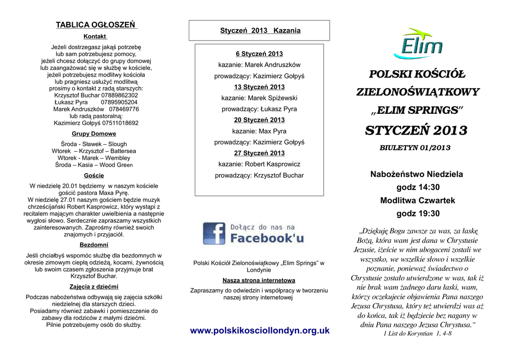 styczeń 2013 - Polski Kościół Chrześcijański Elim Springs w Londynie