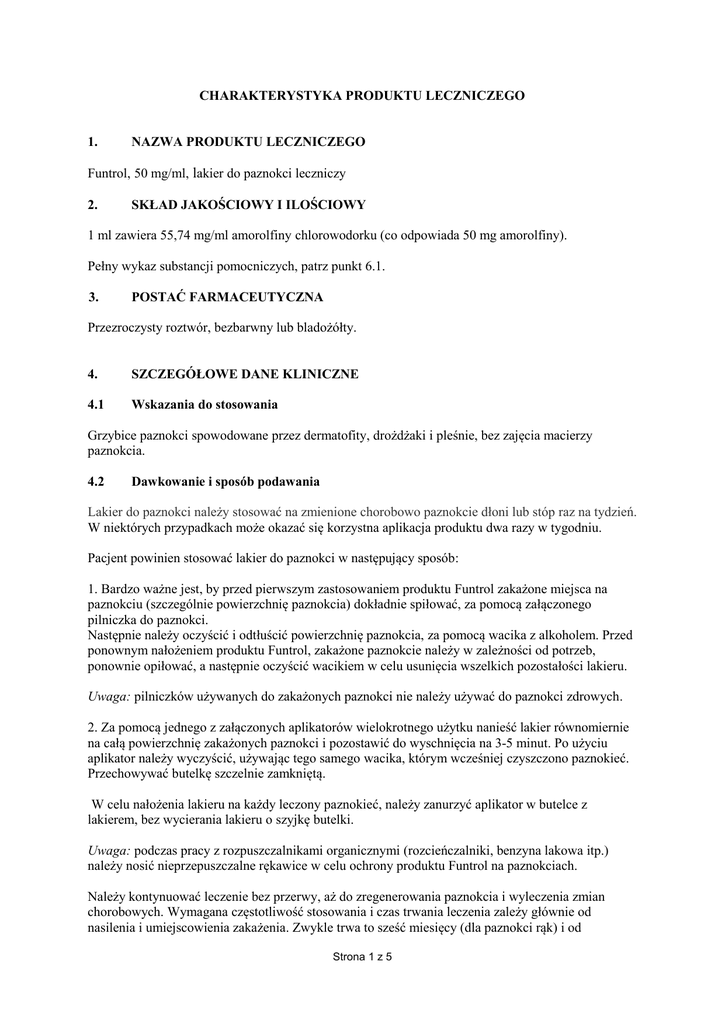 CHARAKTERYSTYKA PRODUKTU LECZNICZEGO 1. NAZWA PRODUKTU LECZNICZEGO Funtrol, 50 mg/ml, lakier do paznokci leczniczy 2. SKŁAD JAKOŚCIOWY I ILOŚCIOWY 1 ml zawiera 55,74 mg/ml amorolfiny chlorowodorku (co odpowiada 50 mg amorolfiny). Pełny wykaz substancji pomocniczych, patrz punkt 6.1. 3. POSTAĆ FARMACEUTYCZNA Przezroczysty roztwór, bezbarwny lub bladożółty. 4. SZCZEGÓŁOWE DANE KLINICZNE 4.1 Wskazania do stosowania Grzybice paznokci spowodowane przez dermatofity, drożdżaki i pleśnie, bez zajęcia macierzy paznokcia. 4.2 Dawkowanie i sposób podawania Lakier do paznokci należy stosować na zmienione chorobowo paznokcie dłoni lub stóp raz na tydzień. W niektórych przypadkach może okazać się korzystna aplikacja produktu dwa razy w tygodniu. Pacjent powinien stosować lakier do paznokci w następujący sposób: 1. Bardzo ważne jest, by przed pierwszym zastosowaniem produktu Funtrol zakażone miejsca na paznokciu (szczególnie powierzchnię paznokcia) dokładnie spiłować, za pomocą załączonego pilniczka do paznokci. Następnie należy oczyścić i odtłuścić powierzchnię paznokcia, za pomocą wacika z alkoholem. Przed ponownym nałożeniem produktu Funtrol, zakażone paznokcie należy w zależności od potrzeb, ponownie opiłować, a następnie oczyścić wacikiem w celu usunięcia wszelkich pozostałości lakieru. Uwaga: pilniczków używanych do zakażonych paznokci nie należy używać do paznokci zdrowych. 2. Za pomocą jednego z załączonych aplikatorów wielokrotnego użytku nanieść lakier równomiernie na całą powierzchnię zakażonych paznokci i pozostawić do wyschnięcia na 3-5 minut. Po użyciu aplikator należy wyczyścić, używając tego samego wacika, którym wcześniej czyszczono paznokieć. Przechowywać butelkę szczelnie zamkniętą. W celu nałożenia lakieru na każdy leczony paznokieć, należy zanurzyć aplikator w butelce z lakierem, bez wycierania lakieru o szyjkę butelki. Uwaga: podczas pracy z rozpuszczalnikami organicznymi (rozcieńczalniki, benzyna lakowa itp.) należy nosić nieprzepuszczalne rękawice w celu ochrony produktu Funtrol na paznokciach. Należy kontynuować leczenie bez przerwy, aż do zregenerowania paznokcia i wyleczenia zmian chorobowych. Wymagana częstotliwość stosowania i czas trwania leczenia zależy głównie od nasilenia i umiejscowienia zakażenia. Zwykle trwa to sześć miesięcy (dla paznokci rąk) i od Strona 1 z 5 dziewięciu do dwunastu miesięcy (dla paznokci stóp). Zaleca się ocenę postępu leczenia w odstępach około 3. miesięcy. Jednocześnie występującą grzybicę stóp należy leczyć odpowiednim kremem przeciwgrzybiczym. Pacjenci w podeszłym wieku Brak szczególnych zaleceń dotyczących dawkowania u pacjentów w podeszłym wieku. Dzieci Lek Funtrol nie jest zalecany do stosowania u dzieci ze względu na brak danych dotyczących bezpieczeństwa stosowania i skuteczności. Sposób podawania Podanie na skórę. 4.3 Przeciwwskazania Produktu Funtrol nie wolno stosować ponownie u pacjentów, którzy wykazali nadwrażliwość na leczenie. Nadwrażliwość na substancję czynną (amorolfinę) lub na którąkolwiek substancje pomocniczą. 4.4 Specjalne ostrzeżenia i środki ostrożności dotyczące stosowania Należy unikać kontaktu lakieru z oczami, uszami i błonami śluzowymi. Pacjenci ze stanami predysponującymi do grzybiczych zakażeń paznokci powinni omówić odpowiedni sposób leczenia z lekarzem. Do takich stanów należą zaburzenia krążenia obwodowego, cukrzyca i immunosupresja. Pacjenci z dystrofią paznokci i zniszczoną płytką paznokci powinni omówić odpowiednie leczenie z lekarzem. Należy unikać stosowania kosmetycznych lakierów do paznokci lub sztucznych paznokci w trakcie leczenia. Amorolfina nie jest wskazana do stosowania u dzieci, ponieważ nie są dostępne dane kliniczne. 4.5 Interakcje z innymi lekami i inne rodzaje interakcji Nie przeprowadzono specjalnych badań dotyczących równoczesnego leczenia innymi lekami stosowanymi miejscowo. 4.6 Ciąża i laktacja Ciąża Brak dostępnych danych klinicznych dla produktu leczniczego Funtrol dotyczących narażenia ciąży. Badania toksykologiczne dotyczące wpływu na rozród nie wykazały działania teratogennego u zwierząt laboratoryjnych, ale przy dużych dawkach amorolfiny podawanych doustnie obserwowano embriotoksyczność. Biorąc pod uwagę niewielkie ogólnoustrojowe wchłanianie amorolfiny w proponowanym zastosowaniu klinicznym, nie jest spodziewane działanie niepożądane na płód, jednakże jako środek ostrożności zaleca się unikać stosowania produktu Funtrol w czasie ciąży. Strona 2 z 5 Karmienie piersią Nie przewiduje się wpływu na dzieci karmione piersią, ponieważ ogólnoustrojowe narażenie kobiet karmiących piersią na działanie amorolfiny jest nieznaczne. Produkt Funtrol może być stosowany podczas karmienia piersią. 4.7 Wpływ na zdolność prowadzenia pojazdów mechanicznych i obsługiwania maszyn Funtrol nie wywiera wpływu na zdolność prowadzenia pojazdów i obsługiwania maszyn. 4.8 Działania niepożądane Działania niepożądane występują rzadko. Mogą wystąpić zaburzenia ze strony paznokci (np. odbarwienie paznokci, łamanie się paznokci, kruchość paznokci). Reakcje te mogą być również związane z samą grzybicą paznokci. Klasyfikacja układów i narządów Zaburzenia skóry i tkanki podskórnej 4.9 Częstość Niepożądane działanie leku Rzadko (≥ 1/10 000 do < 1/1 000) Zaburzenia paznokci, odbarwienie paznokci, łamliwość paznokci Bardzo rzadko (< 1/10 000) Pieczenie skóry, kontaktowe zapalenie skóry Przedawkowanie Przypadkowe połknięcie Produkt Funtrol jest do stosowania miejscowo. W wypadku przypadkowego połknięcia, można zastosować odpowiedni sposób opróżniania żołądka. 5. WŁAŚCIWOŚCI FARMAKOLOGICZNE 5.1 Właściwości farmakodynamiczne Grupa farmakoterapeutyczna: środki przeciwgrzybicze do stosowania dermatologicznego, inne 