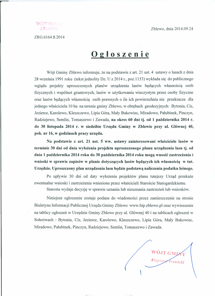 Zblewo, dnia 2014.09.24 ZRG.6164.8.2014 Ogłoszenie Wójt Gminy Zblewo informuje, że na podstawie z art. 21 ust. 4 ustawy o lasach z dnia 28 września 1991 roku (tekst jednolity Dz. U z 2014 r., poz.l153) wykłada się do publicznego wglądu projekty uproszczonych planów urządzenia lasów będących własnością osób fizycznych i wspólnot gruntowych, lasów w użytkowaniu wieczystym przez osoby fizyczne oraz lasów będących własnością osób prawnych o ile ich powierzchnia nie przekracza jednego właściciela 10 ha na terenie gminy Zblewo, w obrębach geodezyjnych: dla Bytonia, Cis, Jezierce, Karolewo, Kleszczewo, Lipia Góra, Mały Bukowiec, Miradowo, Pałubinek, Pinczyn, Radziejewo, Semlin, Tomaszewo i Zawada, na okres 60 dni tj. od 1 października 2014 r. do 30 listopada 2014 r. w siedzibie Urzędu Gminy w Zblewie przy ul. Głównej 40, pok. nr 16, w godzinach pracy urzędu. Na podstawie z art. 21 ust. 5 ww. ustawy zainteresowani właściciele lasów w terminie 30 dni od dnia wyłożenia projektu uproszczonego planu urządzenia lasu tj. od dnia 1 października 2014 roku do 30 października 2014 roku mogą wnosić zastrzeżenia i wnioski w sprawie zapisów w planie dotyczących lasów będących ich własnością w tut. Urzędzie. Uproszczony plan urządzenia lasu będzie podstawą naliczenia podatku leśnego. Po upływie 30 dni od daty wyłożenia projektów planu tutejszy Urząd przekaże ewentualne wnioski i zastrzeżenia wniesione przez właścicieli Staroście Starogardzkiemu. Starosta wydaje decyzję w sprawie uznania lub nieuznania zastrzeżeń lub wniosków. Niniejsze ogłoszenie zostaje podane do wiadomości przez zamieszczenie Biuletynu Informacji Publicznej Urzędu Gminy Zblewo www.bip.zblewo.pl na stronie oraz wywieszenie na tablicy ogłoszeń w Urzędzie Gminy Zblewo przy ul. Głównej 40 i na tablicach ogłoszeń w Sołectwach: Bytonia, Cis, Jezierce, Karolewo, Kleszczewo, Lipia Góra, Mały Bukowiec, Miradowo, Pałubinek, Pinczyn, Radziejewo, Semlin, Tomaszewo i Zawada. ,