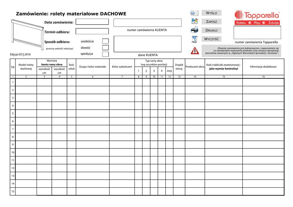 WYŚLIJ Zamówienie: rolety materiałowe DACHOWE ZAPISZ Data zamówienia: numer zamówienia KLIENTA Termin odbioru: (prosimy zakreślić właściwy) 1 1 2 3 4 5 6 7 8 9 10 11 12 13 14 15 2 dowóz spedycja Edycja 05 || 2016 Lp WYCZYŚĆ osobiście Sposób odbioru: Model rolety dachowej Wymiary kantu ramy okna szerokość cm wysokość cm 3 4 DRUKUJ Ilość sztuk Grupa i kolor materiału 5 6 Złożenie zamówienia jest jednoznaczne z zapoznaniem się ze standardami wykonania produktu oraz oznacza akceptację warunków zawartych w „Ogólnych Warunkach Sprzedaży i Dostawy". dane KLIENTA Typ ramy okna (wg rysunków poniżej) Kolor wykończeń 7 numer zamówienia Tapparella 1 2 3 4 inny 8 9 10 11 12 Kod z tabliczki znamionowej Drążek Producent okna steruj. jako wymiar kontrolny! 13 14 15 Informacje dodatkowe 16 Zamówienie: rolety materiałowe DACHOWE Lp Model rolety dachowej Wymiary kantu ramy okna szerokość cm wysokość cm Ilość sztuk Grupa i kolor materiału Kolor wykończeń 1 2 3 4 5 6 7 1 FANTAZJA 61,3 116 2 A 901 BIEL przykład wypełnionego zamówienia Typ ramy okna (wg rysunków poniżej) 1 2 3 4 inny 8 9 10 11 12 Kod z tabliczki znamionowej Drążek Producent okna steruj. jako wymiar kontrolny! x przykład wypełnionego zamówienia 13 14 15 x VELUX M08 Informacje dodatkowe przykład wypełnionego zamówienia UWAGI: Kolumna 2 - prosimy wpisać odpowiedni model rolety materiałowej DACHOWEJ: Fantazja, Werso Kolumna 3 i 4 - prosimy wpisać wymiary kantu ramy okna dachowego w centymetrach. UWAGA: Brak podania wymiarów kantu ramy spowoduje zwrot zamówienia w celu uzupełnienia danych! Kolumna 5 - prosimy wpisać ilość sztuk rolet o tych samych wymiarach i materiale. Kolumna 6 - prosimy wpisać nazwę materiału oraz jej numer odpowiadający wybranemu kolorowi. Kolumna 7 - prosimy wpisać dostępny kolor wykończeń lub inny wybrany kolor wg RAL. Fantazja: biały (RAL 9003), beż (RAL 1001), srebrny anodowany Werso: srebrny anodowany Kolumna 8 do 11 - typ ramy okna prosimy określić wg rysunków sposobów pomiarowania podanych obok. Kolumna 12 - w przypadu innego typu ramy okna niż podane prosimy o dołączenie rysunku lub przekroju okna. Kolumna 13 - drążek sterujący (za dopłatą) występuje w kolorze białym. Fantazja: 100cm, 150cm, 200cm Werso: 75cm, 100cm, 150cm, 200cm Kolumna 14 - producent okna dachowego. Kolumna 15 - kod z tabliczki znamionowej - jako opcja do kontroli podanych wymiarów kantu ramy okna. Kolumna 16 - prosimy wpisać dodatkowe uwagi dotyczące zamówienia. Kolumna od 8 do 11 Typy ramy okna - sposób wymiarowania: 16
