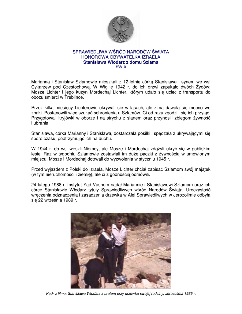 SPRAWIEDLIWA WŚRÓD NARODÓW ŚWIATA HONOROWA OBYWATELKA IZRAELA Stanisława Włodarz z domu Szlama #3810 Marianna i Stanisław Szlamowie mieszkali z 12-letnią córką Stanisławą i synem we wsi Cykarzew pod Częstochową. W Wigilię 1942 r. do ich drzwi zapukało dwóch Żydów: Mosze Lichter i jego kuzyn Mordechaj Lichter, którym udało się uciec z transportu do obozu śmierci w Treblince. Przez kilka miesięcy Lichterowie ukrywali się w lasach, ale zima dawała się mocno we znaki. Postanowili więc szukać schronienia u Szlamów. Ci od razu zgodzili się ich przyjąć. Przygotowali kryjówki w oborze i na strychu z sianem oraz przynosili zbiegom żywność i ubrania. Stanisława, córka Marianny i Stanisława, dostarczała posiłki i spędzała z ukrywającymi się sporo czasu, podtrzymując ich na duchu. W 1944 r. do wsi weszli Niemcy, ale Mosze i Mordechaj zdążyli ukryć się w pobliskim lesie. Raz w tygodniu Szlamowie zostawiali im duże paczki z żywnością w umówionym miejscu. Mosze i Mordechaj dotrwali do wyzwolenia w styczniu 1945 r. Przed wyjazdem z Polski do Izraela, Mosze Lichter chciał zapisać Szlamom swój majątek (w tym nieruchomości i ziemię), ale ci z godnością odmówili. 24 lutego 1988 r. Instytut Yad Vashem nadał Mariannie i Stanisławowi Szlamom oraz ich córce Stanisławie Włodarz tytuły Sprawiedliwych wśród Narodów Świata. Uroczystość wręczenia odznaczenia i zasadzenia drzewka w Alei Sprawiedliwych w Jerozolimie odbyła się 22 września 1989 r. Kadr z filmu: Stanisława Włodarz z bratem przy drzewku swojej rodziny, Jerozolima 1989 r. Tytuł „Sprawiedliwy wśród Narodów Świata” Od 1963 r. specjalna komisja Instytutu Pamięci Narodowej Yad Vashem w Jerozolimie, pod przewodnictwem Sądu Najwyższego Izraela, przyznaje medale i dyplomy „Sprawiedliwy wśród Narodów Świata” (חסיד אומות העולם, czyt. Chasid umot ha-Olam). Jest to odznaczenie mające oddać hołd Bohaterom, którzy bezinteresownie, z czysto humanitarnych pobudek narażali życie dla ratowania swoich żydowskich przyjaciół, sąsiadów, znajomych, a często zupełnie obcych ludzi, skazanych na Zagładę. Osoby uznane za Sprawiedliwych otrzymują specjalnie wybity medal ze swoim nazwiskiem oraz dyplom honorowy. Ich imiona i nazwiska zostają również wyryte na kamiennych tablicach w Ogrodzie Sprawiedliwych w Jerozolimie. Od kilku lat Bohaterom nie sadzi się już drzewek oliwnych z powodu braku miejsca. Instytut Yad Vashem uhonorował dotychczas ponad 23 tysiące Bohaterów z całego świata, w tym ponad 6 tysięcy Polaków. Sprawiedliwymi wśród Narodów Świata zostali między innymi pisarka i inicjatorka powstania „Żegoty” Zofia Kossak-Szczucka, działaczka społeczna Irena Sendlerowa, śpiewak Mieczysław Fogg, pisarz Igor Newerly, dyplomata Henryk Sławik i minister Władysław Bartoszewski. Podstawą przyznania tytułu „Sprawiedliwy wśród Narodów Świata” osobie niosącej pomoc Żydom w czasie II wojny światowej jest złożenie zeznania przez osobę uratowaną i przekazanie go Instytutowi Yad Vashem w Jerozolimie. Wyjątkowo zgłoszenia składać mogą również ratujący, krewni ratujących, a także świadkowie wydarzeń. Ich wnioski mają wówczas jedynie charakter pomocniczy. Rozpatrując zgłoszenia, komisja historyków Yad Vashem bierze pod uwagę m.in. następujące kryteria: - zakres i rodzaj udzielonej pomocy, - korzyści materialne wynikające z udzielanej pomocy lub brak takich korzyści, - skala niebezpieczeństwa i podejmowanego ryzyka, wynikającego z udzielania pomocy, - motywację osób udzielających pomocy (np. przyjaźń, altruizm, religia, przekonania) - dostępność dowodów złożonych przez osoby uratowane, - inne ważne fakty, informacje oraz dokumenty, które mogą udowodnić prawdziwość przedstawianych wydarzeń. Instytut Yad Vashem, Righteous Among the Nations Department P.O. Box 3477, 91034 Jerusalem, Izrael tel. 00972/ 2 644 3521, fax 00972/ 2 644 3443 e-mail: [email protected] Departament Sprawiedliwych wśród Narodów Świata Ambasada Izraela w Polsce ul. Krzywickiego 24, 02-078 Warszawa tel. 22/ 59 70 547, fax 22/ 82 51 607 e-mail: [email protected] Więcej na stronie: www.israel.pl w zakładce Departamentu Sprawiedliwych.