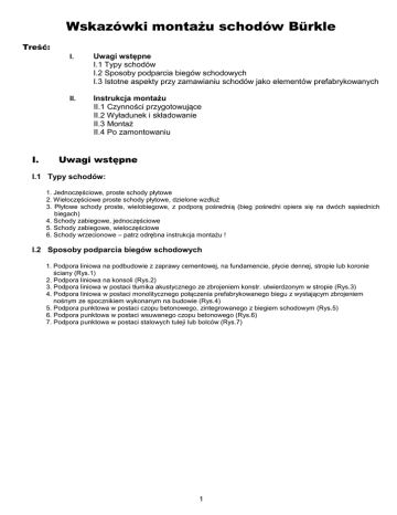 Wskazówki montażu schodów Bürkle Treść: I. I. Uwagi wstępne I.1 Typy schodów I.2 Sposoby podparcia biegów schodowych I.3 Istotne aspekty przy zamawianiu schodów jako elementów prefabrykowanych II. Instrukcja montażu II.1 Czynności przygotowujące II.2 Wyładunek i składowanie II.3 Montaż II.4 Po zamontowaniu Uwagi wstępne I.1 Typy schodów: 1. Jednoczęściowe, proste schody płytowe 2. Wieloczęściowe proste schody płytowe, dzielone wzdłuż 3. Płytowe schody proste, wielobiegowe, z podporą pośrednią (bieg pośredni opiera się na dwóch sąsiednich biegach) 4. Schody zabiegowe, jednoczęściowe 5. Schody zabiegowe, wieloczęściowe 6. Schody wrzecionowe – patrz odrębna instrukcja montażu ! I.2 Sposoby podparcia biegów schodowych 1. Podpora liniowa na podbudowie z zaprawy cementowej, na fundamencie, płycie dennej, stropie lub koronie ściany (Rys.1) 2. Podpora liniowa na konsoli (Rys.2) 3. Podpora liniowa w postaci tłumika akustycznego ze zbrojeniem konstr. utwierdzonym w stropie (Rys.3) 4. Podpora liniowa w postaci monolitycznego połączenia prefabrykowanego biegu z wystającym zbrojeniem nośnym ze spocznikiem wykonanym na budowie (Rys.4) 5. Podpora punktowa w postaci czopu betonowego, zintegrowanego z biegiem schodowym (Rys.5) 6. Podpora punktowa w postaci wsuwanego czopu betonowego (Rys.6) 7. Podpora punktowa w postaci stalowych tuleji lub bolców (Rys.7) 1 I.3 Istotne aspekty przy zamawianiu schodów jako elementy prefabrykowane Przed zleceniem zaprojektowania prefabrykowanych schodów należy ustalić i zweryfikować: - zgodność zaplanowanych wymiarów schodów z wymiarami rzeczywistymi na budowie, a w szczególności: a) położenie i wymiary podpór dla schodów, b) wysokości dolnej i górnej powierzchni stropów, c) wymiary otworów na schody w poziomie stropów, d) długość oraz szerokość w świetle ścian klatki schodowej, e) ilość biegów schodowych, ewentualny podział f) ciężar biegów schodowych - dostępność dźwigu budowlanego o wymaganym udźwigu, - możliwość dojazdu do miejsca rozładunku środka transportowego oraz dźwigu, - termin dostawy schodów uwzględniający ich wbudowanie np. przed wykonaniem innych elementów konstrukcyjnych na budowie (stropy, dachy itp.) - grubość okładziny na schodach, a w przypadku schodów zaplanowanych w wersji bez okładziny, wybrać sposób zaślepienia widocznych otworów po hakach transportowych (np. talerzyki maskujące, szpachlowanie itp.). II. Instrukcja montażu II.1 Wymagane narzędzia i materiały: a) podpory montażowe (stemple), poziomnice, łaty murarskie, b) zawiesia do wyładunku (zalecane są zawiesia łańcuchowe z 4 cięgnami – tylko wówczas możliwe jest proste wypoziomowanie zawieszonego biegu), c) podkładki elastomerowe, w przypadku montażu schodów na konsoli (patrz rys. 2) – dostarczane na życzenie klienta, d) stalowe trzpienie stabilizujące lub kątowniki, w przypadku montażu schodów na wolnostojącej podporze liniowej (patrz rys. 1), e) przekładki do ewentualnego składowania biegów schodowych w stosie (w przypadku betonu architektonicznego stosować przekładki antypoślizgowe Stapelfix AR firmy Reuss-Seifert lub podobne z uwagi na możliwe przebarwienia), f) środki ochrony indywidualnej wg przepisów BHP. II.2 Wyładunek i składowanie a) b) elementy są oznakowane zgodnie z dokumentacją oraz obowiązującymi normami, przed rozpoczęciem rozładunku sprawdzić numerację prefabrykatów, zgodnie z planem montażu, 2 c) d) e) f) g) h) i) sprawdzić elementy odnośnie ewentualnych uszkodzeń powstałych w czasie transportu lub widocznych wad produkcyjnych, używać odpowiedniego, nieuszkodzonego zawiesia, patrz powyżej II.1.2 lit. b) !!!, używać tylko dopuszczonych, pasujących i sprawdzonych akcesorii do zawiesi (pętle liniowe, zaczepy itd.), wszystkie pętle linowe powinny być wkręcone na całą długością gwintu, przestrzegać wszystkich przepisów BHP związanych z wykonywaniem prac rozładunkowych i montażowych nigdy nie stawać pod zawieszonymi prefabrykatami !!!, podczas tymczasowego składowania na budowie, schody nie powinny być narażone na zabrudzenia oraz obciążenia inne niż przewidziane w projekcie konstrukcyjnym (uwaga na powierzchnie w jakości betonu architektonicznego – patrz II.1.2 lit. e) !!! Montaż II.3 Sposób montażu różni się w zależności od typu schodów oraz sposobu ich podparcia !!! Ogólne wskazówki: - - - w przypadku schodów zewnętrznych, bieg należy osadzić pod niewielkim kątem w stosunku do poziomu, tak aby uzyskać spadek min. 2 mm na stopnicy schodów, w celu swobodnego odprowadzenia wody deszczowej, w przypadku schodów wewnętrznych zaleca się stosować podkładki elastomerowe o właściwościach spężysto-tłumiących w celu redukcji tzw. dźwięków uderzeniowych (odgłosów kroków). W trakcie montażu należy zwrócić uwagę na to, aby schody prefabrykowane nie zostały oparte bezpośrednio na konstrukcji klatki schodowej bez użycia w/w podkładek, w schodach znajdują się 3 lub 4 haki transportowe, w zależności od ich typu oraz ciężaru, służące do zamocowania elementów w obiekcie. Przygotowanie podpór: Oparcie biegu na podbudowie z zaprawy cementowej (patrz I.2.1): - ułożyć zaprawę na odpowiednią grubość, na całej powierzchni podpory, przygotować otwory pod trzpienie stabilizujące bądź zamontować kątownik. Oparcie biegu na podporze liniowej w kształcie konsoli (patrz I.2.2): - usunąć z konsoli wszelkie zanieszczyszczenia, a następnie ułożyć zalecane podkładki elastomerowe tak, aby wyeliminować możliwość bezpośredniego kontaktu prefabrykatu z elementem stropu. Utwierdzenie biegu w stropie przy pomocy tłumika akustycznego ze zbrojeniem konstr. (patrz I.2.3): Przed ułożeniem górnego zbrojenia w stropnie lub spoczniku należy: ustawić schody w pozycji ich eksploatacji oraz zaszalować i podstemplować podporę tak, aby można było zwolnić 