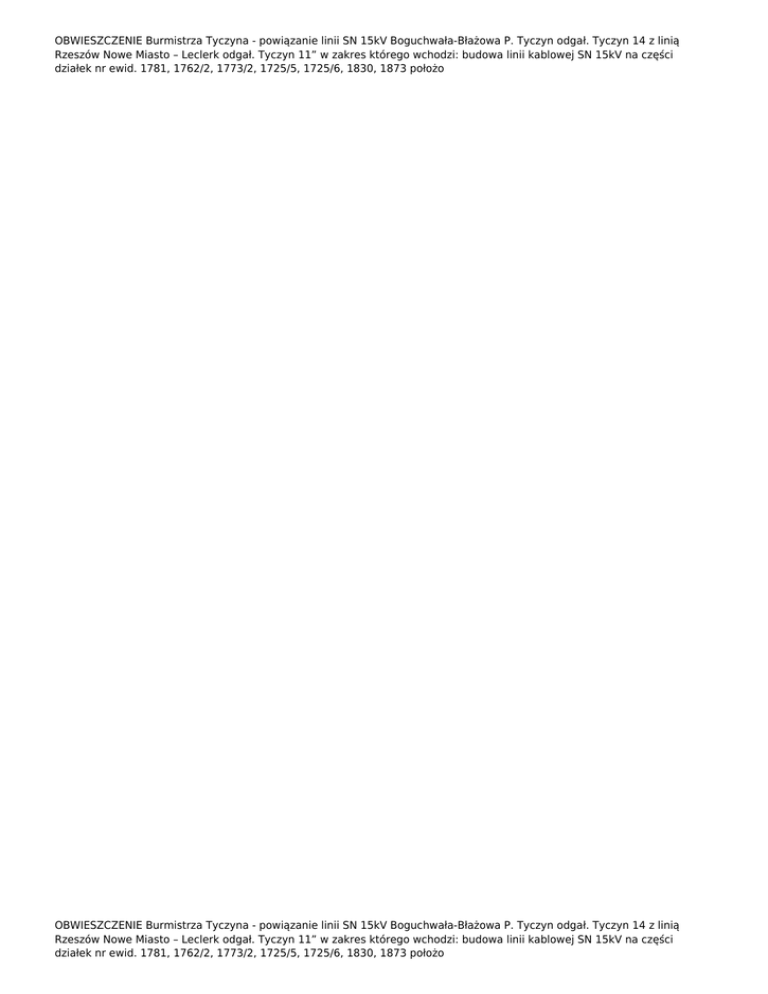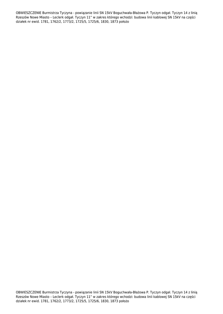 OBWIESZCZENIE Burmistrza Tyczyna - powiązanie linii SN 15kV Boguchwała-Błażowa P. Tyczyn odgał. Tyczyn 14 z linią Rzeszów Nowe Miasto – Leclerk odgał. Tyczyn 11” w zakres którego wchodzi: budowa linii kablowej SN 15kV na części działek nr ewid. 1781, 1762/2, 1773/2, 1725/5, 1725/6, 1830, 1873 położo OBWIESZCZENIE Burmistrza Tyczyna - powiązanie linii SN 15kV Boguchwała-Błażowa P. Tyczyn odgał. Tyczyn 14 z linią Rzeszów Nowe Miasto – Leclerk odgał. Tyczyn 11” w zakres którego wchodzi: budowa linii kablowej SN 15kV na części działek nr ewid. 1781, 1762/2, 1773/2, 1725/5, 1725/6, 1830, 1873 położo